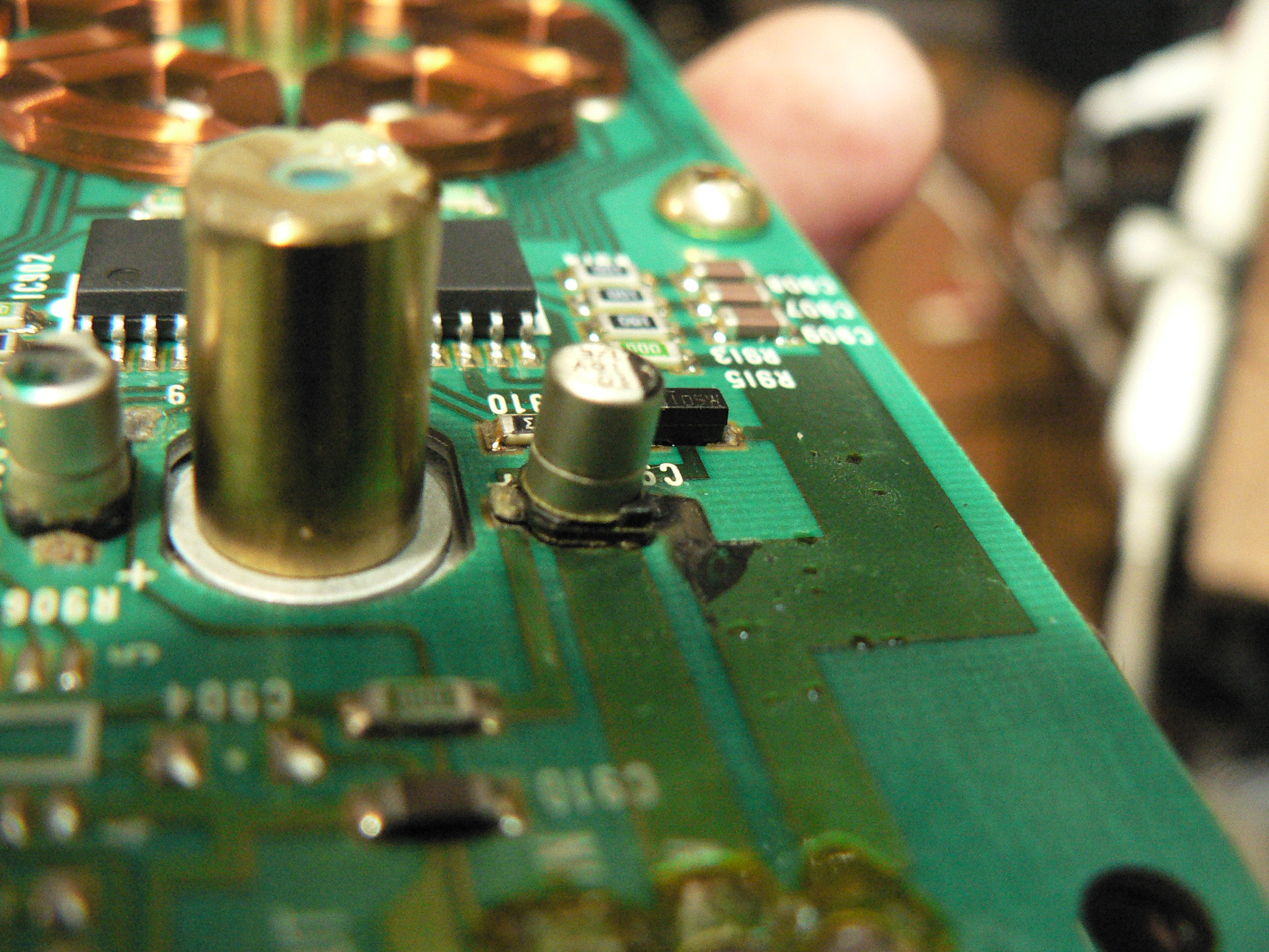 リード型の電解コンデンサーを取り付け、その端子からICの細かい足にバイパス線を接続します。老眼には酷な作業です。取れてしまった100kΩの抵抗も通常タイプのものを取り付けます。