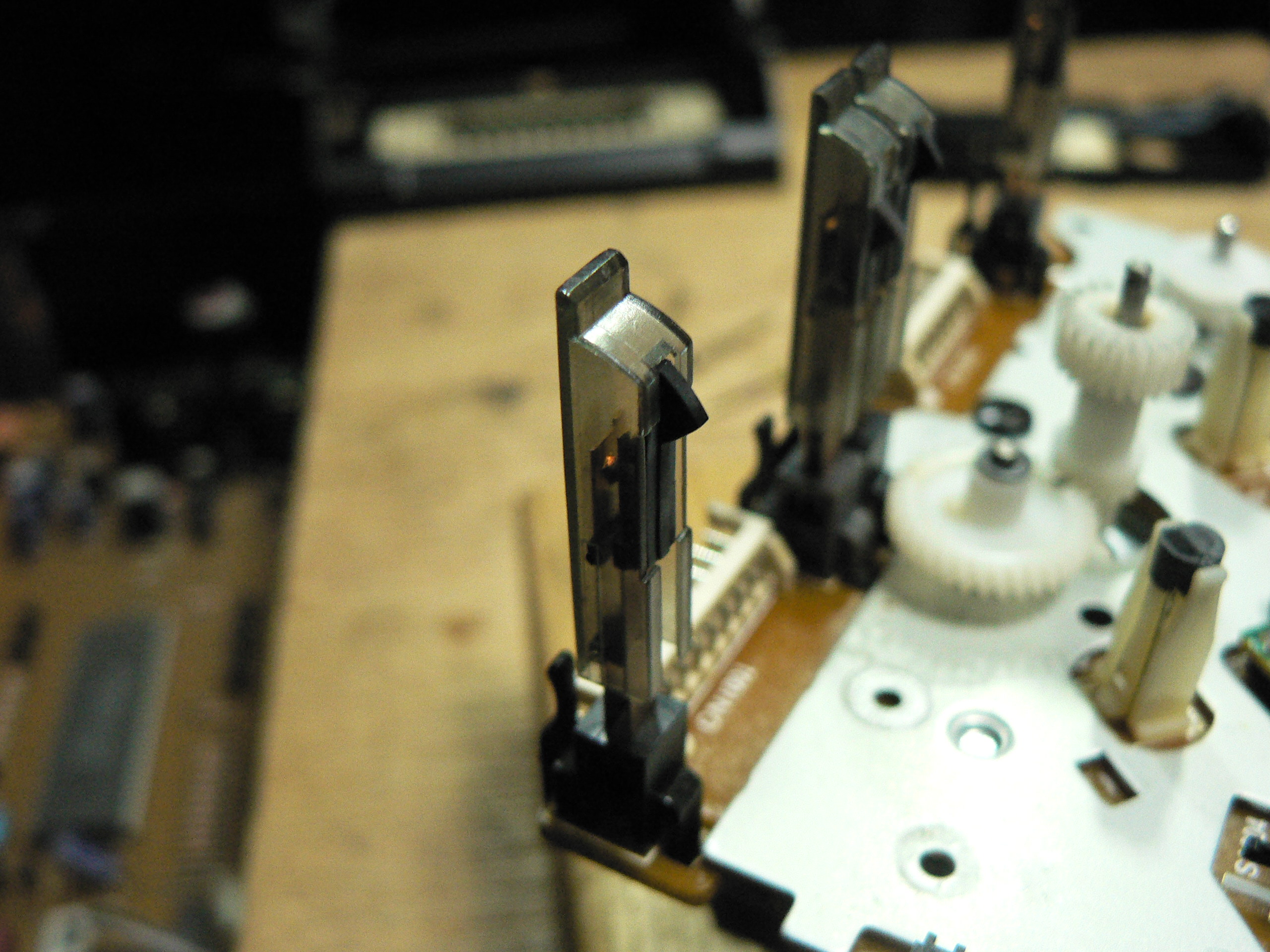 テープセレクターの検出スイッチもカバーを外して接点の清掃を行います。カバーの脱着はコツが必要です。無理に引き抜くと爪が簡単に破損します。