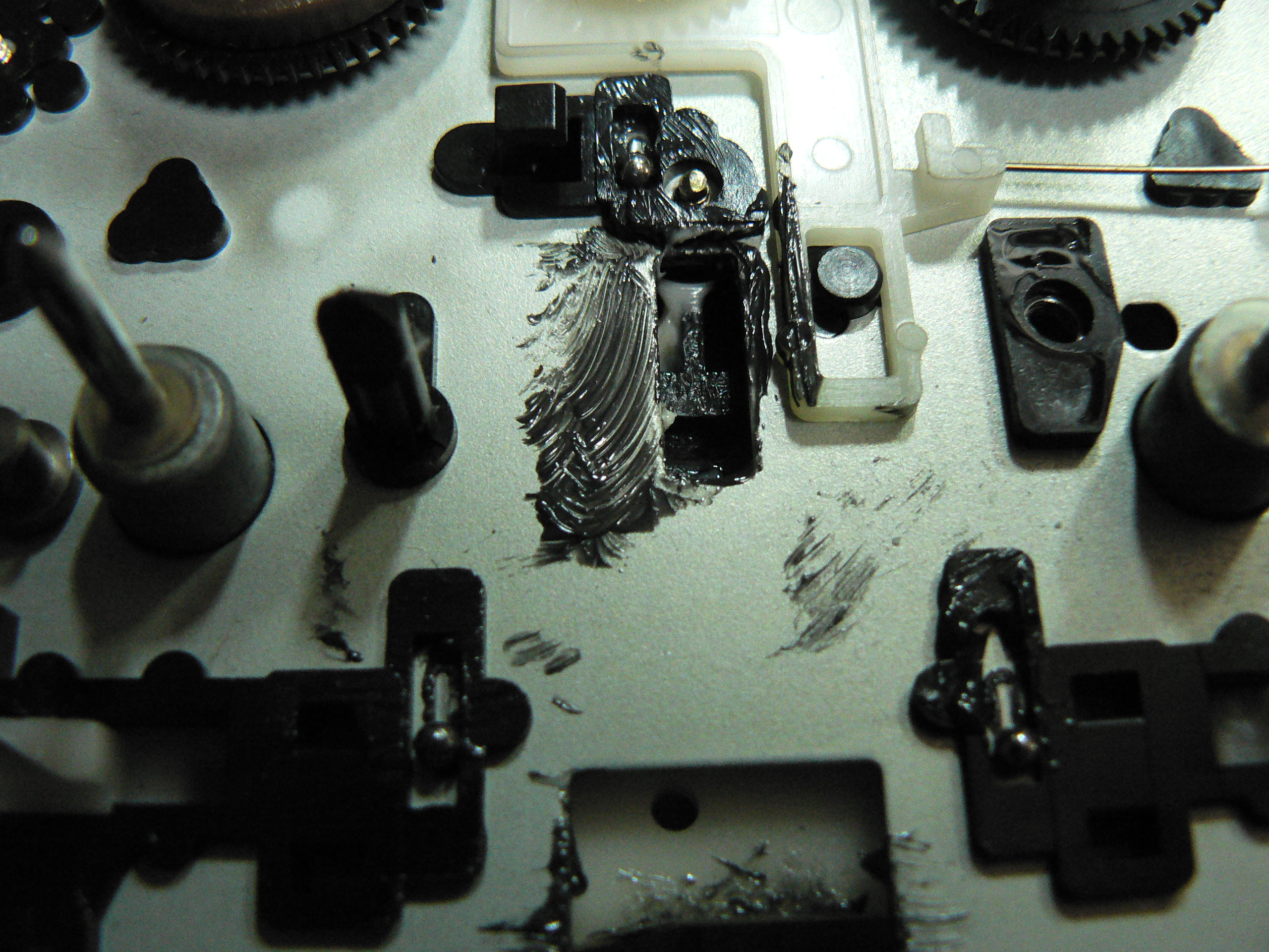 「『モードカムギア』を手動で回しますと、ある回転角度で非常に硬くなるところが確認されました。どうも『ヘッドアッシー』のスライド部が所定の位置までスライドせず少々固着していたようです。『ヘッドアッシー』を外し、スライド部のボールが入っている箇所を掃除・グリスアップして『ヘッドアッシー』を組み込みましたらどのモードからもカセットホルダーが開くようになりました。」