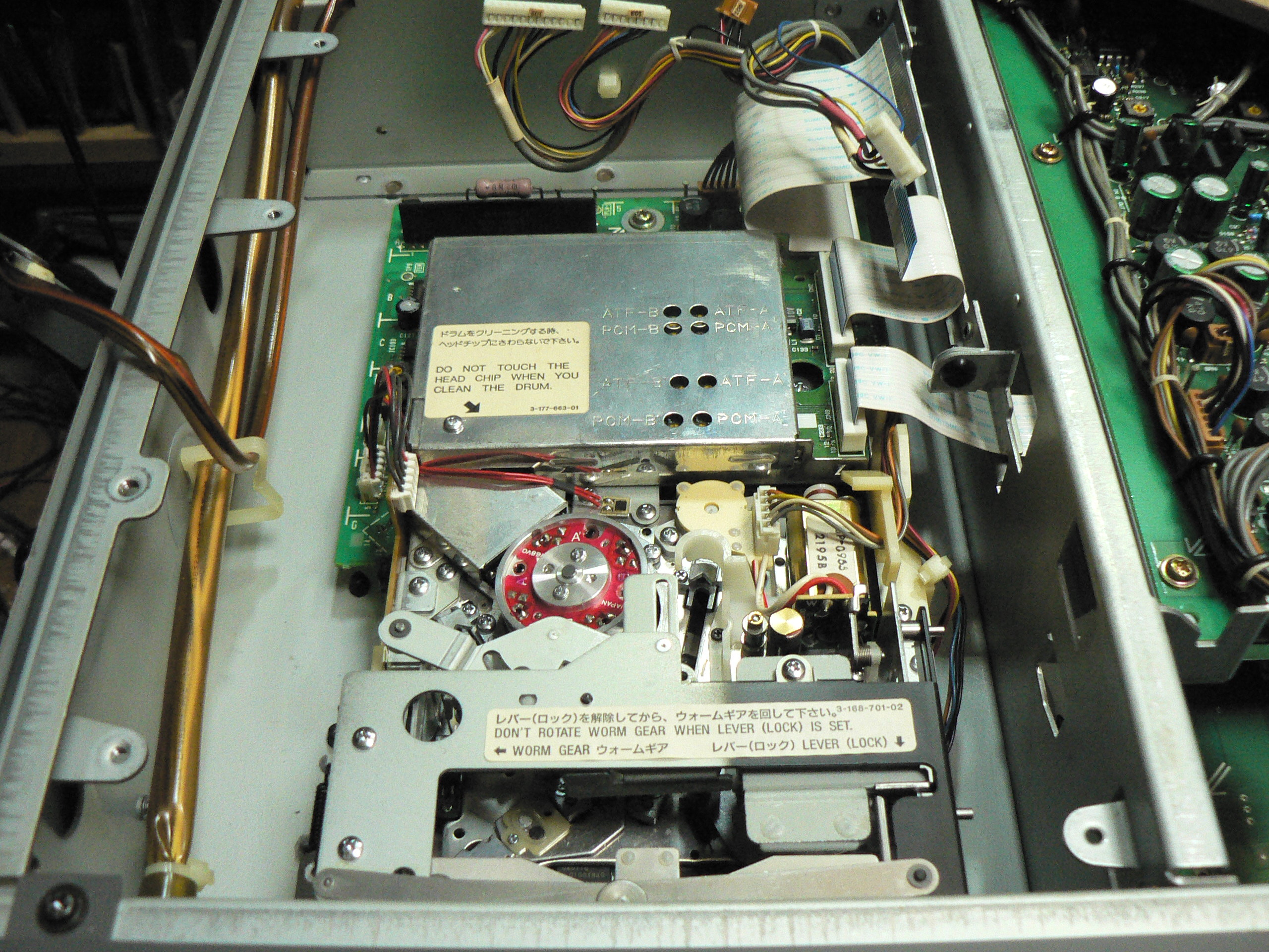 カバーを開けてメカの動作状況を目視点検します。赤い4ヘッドドラムが目を引きます。