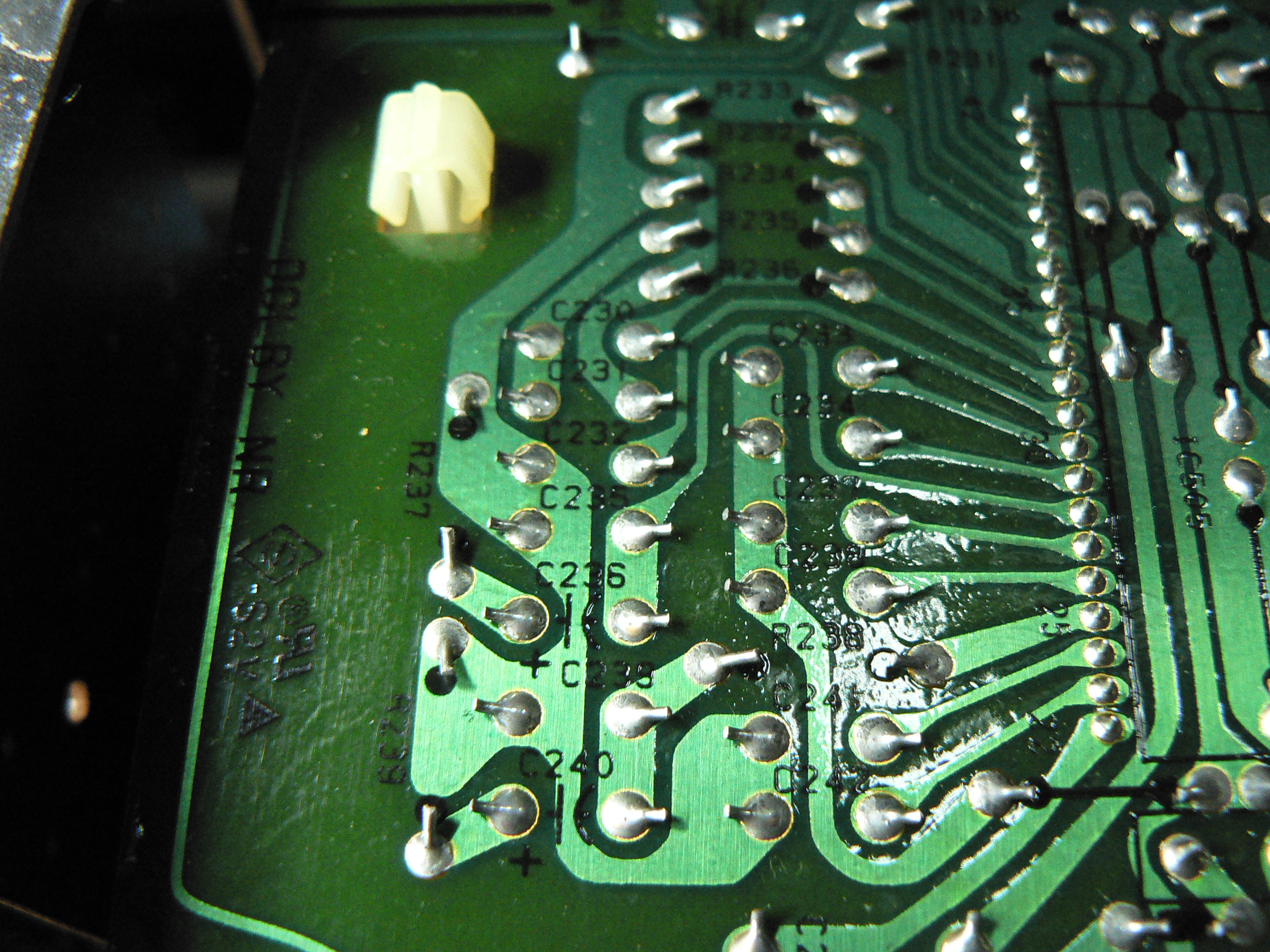ヘッドホン基板の100μFなど、いずれも液漏れの形跡はありません。これまでの経験上、液漏れが発生していない機体は全体の2割程度といったところでしょうか。おそらく製造時の部品の納入時期によって異なるのだと思います。