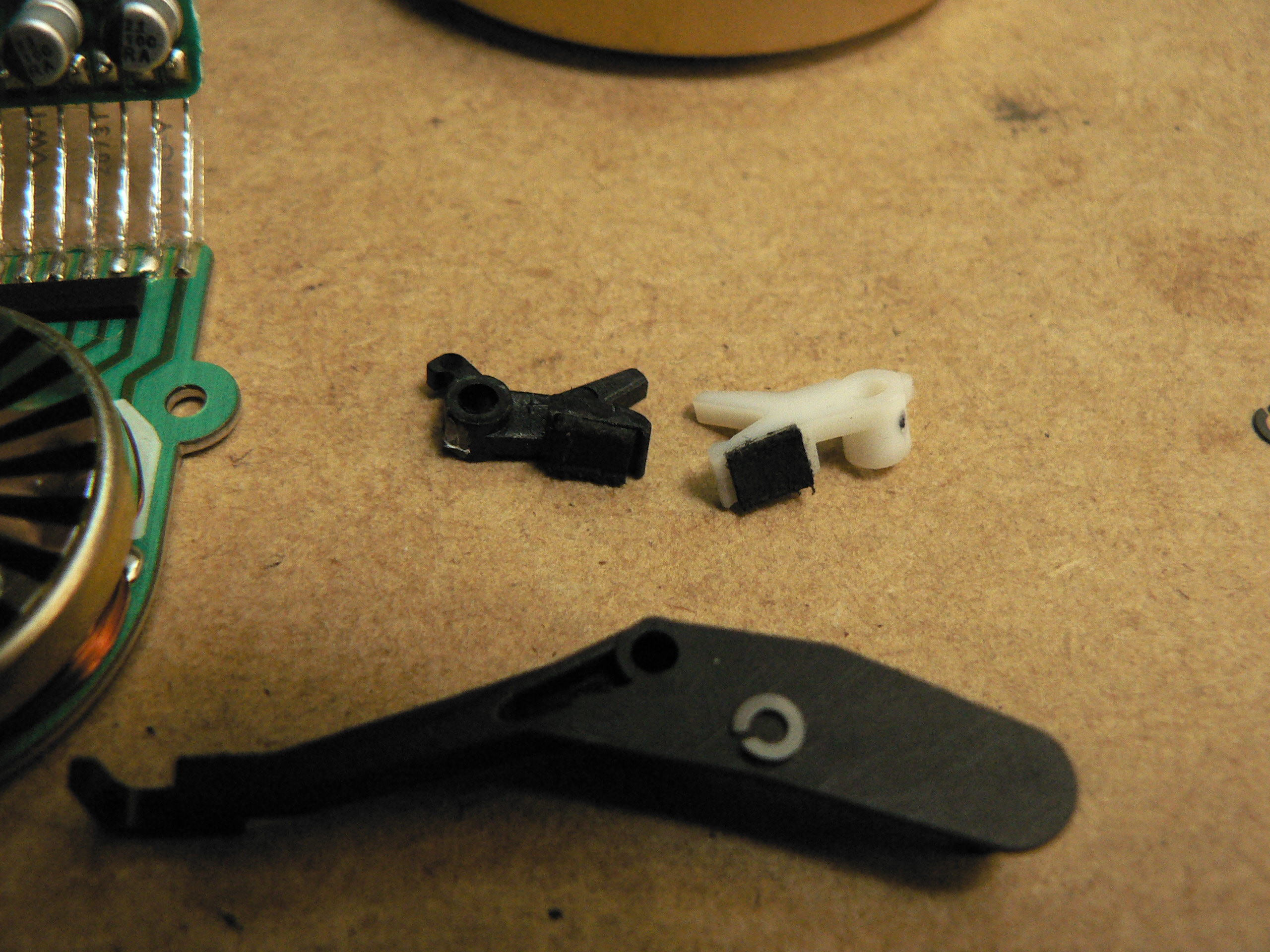 ここも見逃しません。中央のピンチローラーの留め具が浮いています。A8やZA5ESでも同様ですが、プラスチックの留め具が劣化により割れて抜け出し、その次にピンチローラーが外れて故障します。弾性のある接着剤で抜け止め処置を施しました。