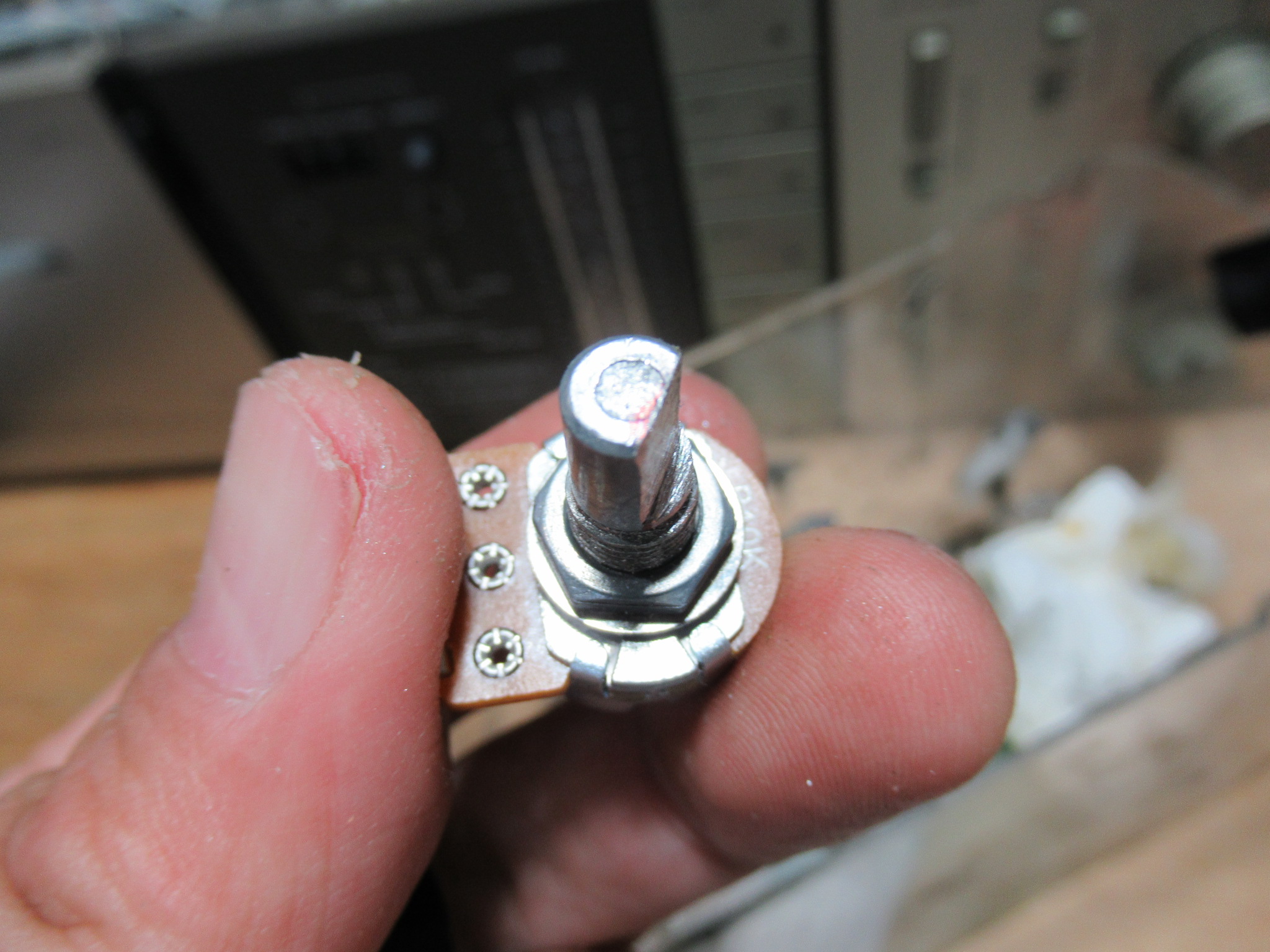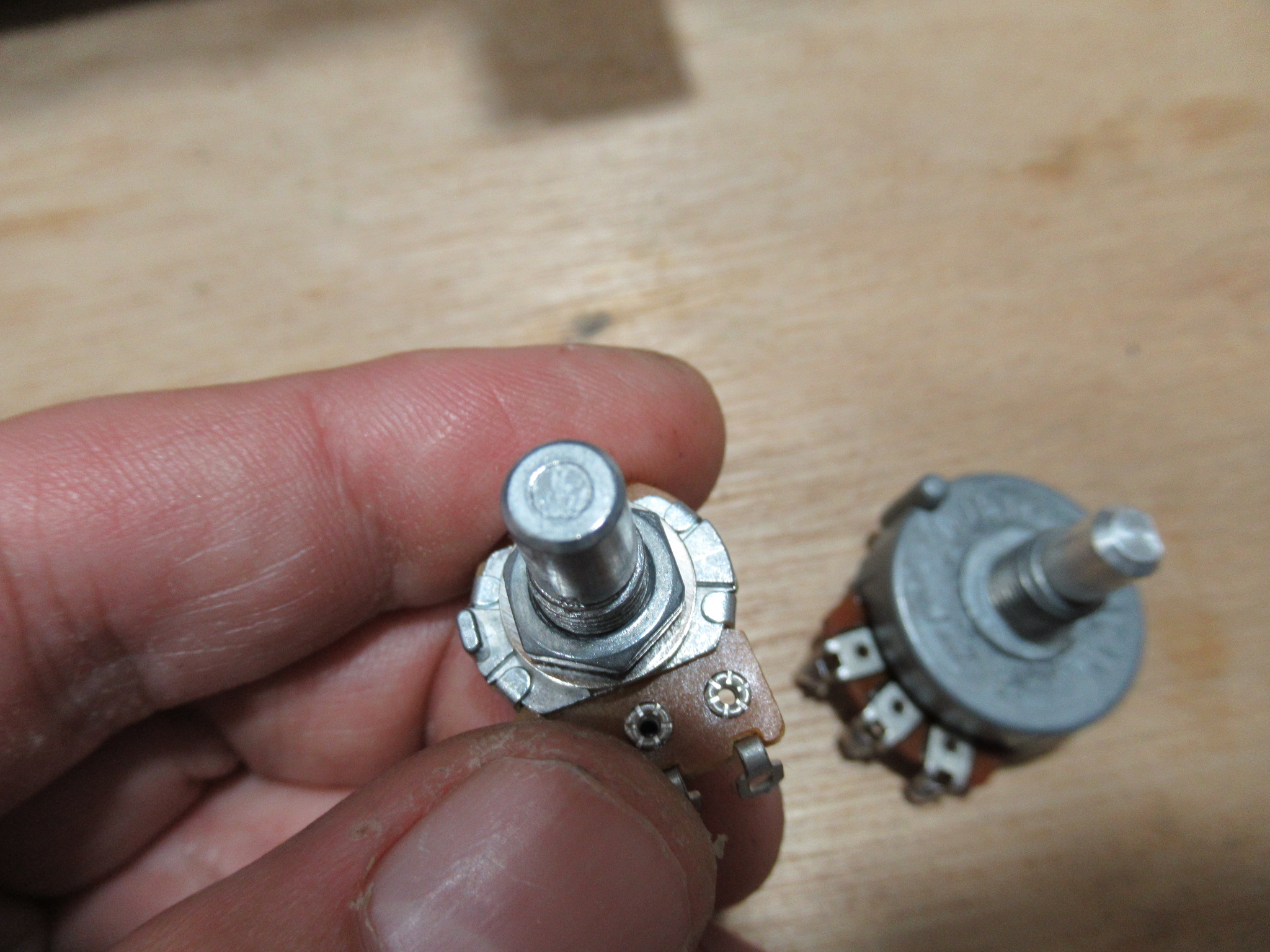 形状が特殊ですので同じものは用意できません。ということで、大きさはかなり違いますが、左のようなポテンショメーター10kΩ-Bを用意しました。