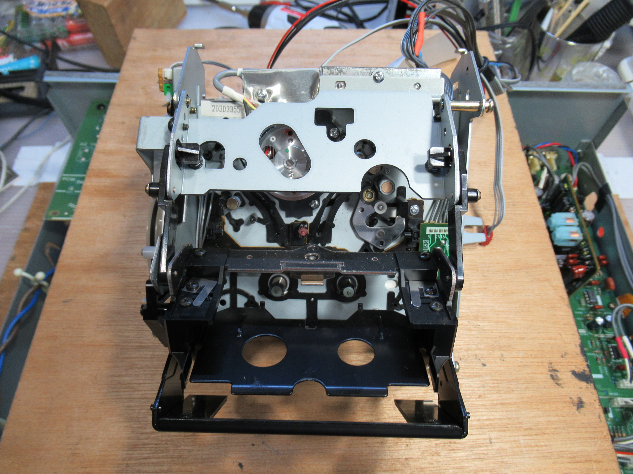 しかし、再生音が出ません。内部からリレーの「カチカチ」という音が断続的に鳴っています。ヘッドが汚れかRFアンプ故障のどちらかです。