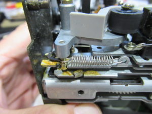 メカの分解を進めます。左側ピンチローラーアームは調整式になっていますので、元の位置を測定し記録します。
