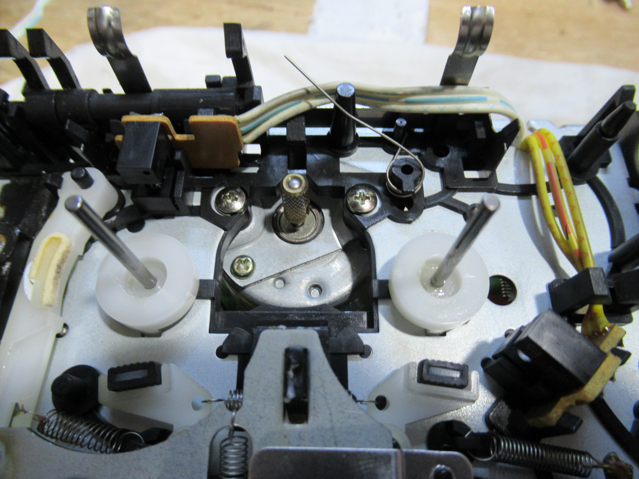 ピンチローラーアームを取り外した後です。シャフトに塗られたグリスが乾いて白くなっています。