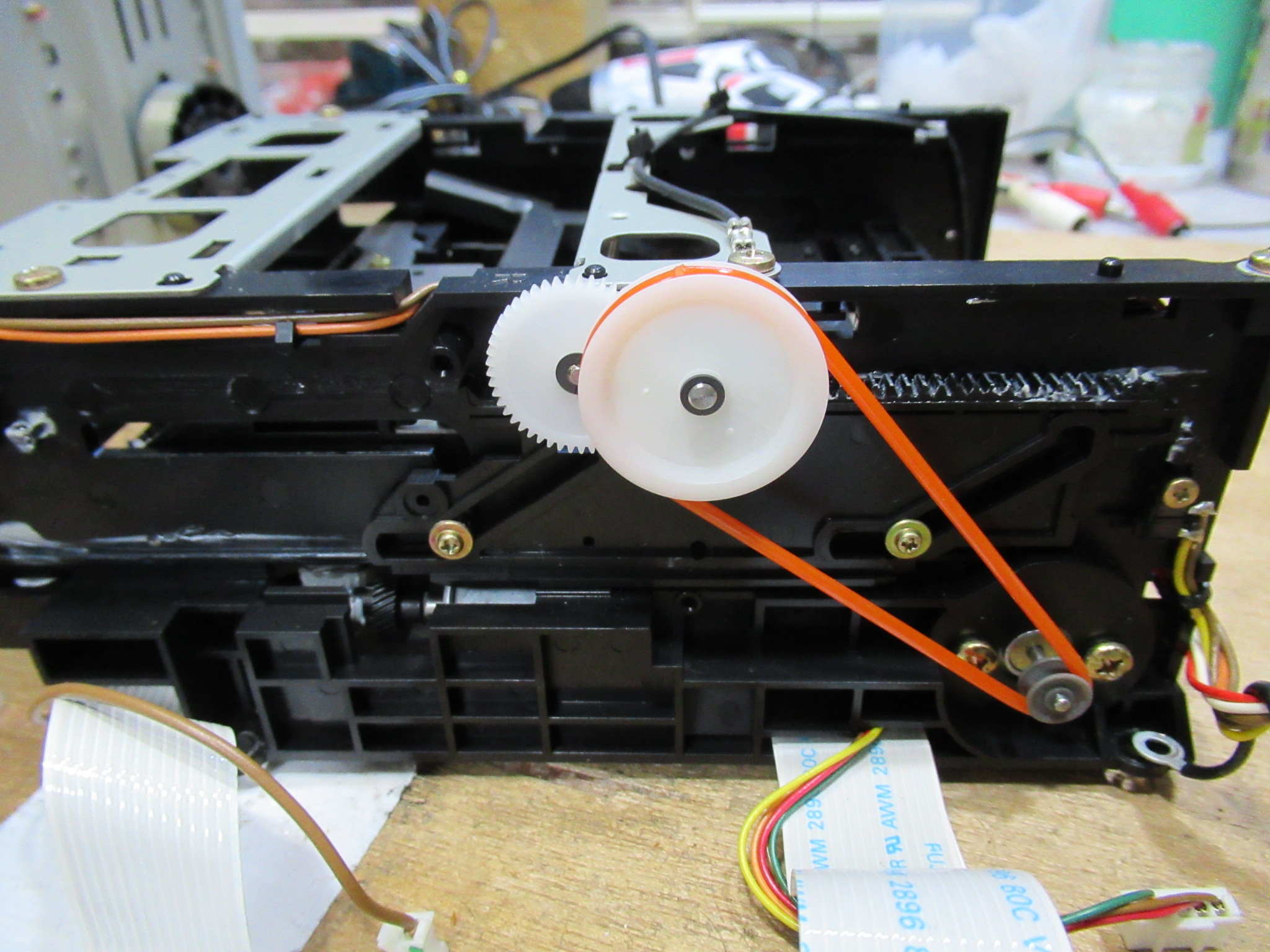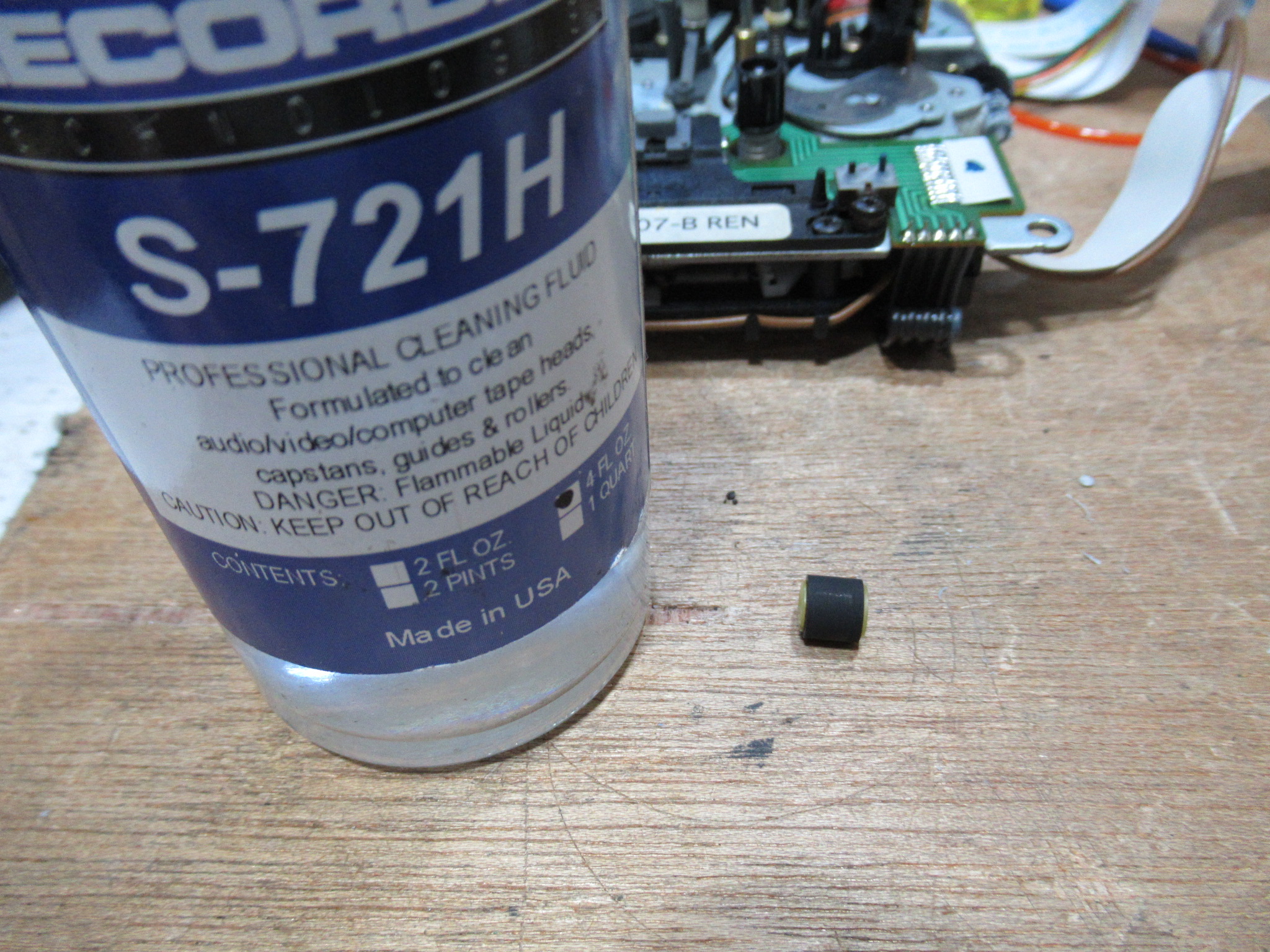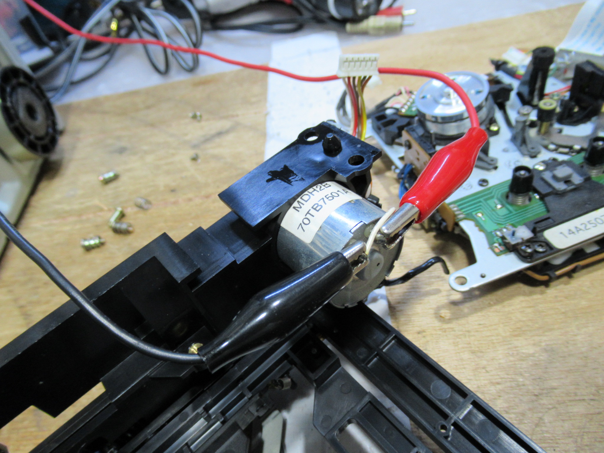 可動式のテープガイドなどを駆動するモーターを切り離し、直接電圧を加え、しばらくの間、空転させます。常時動作しないモーターは、内部で接触不良が起きやすいため、それを予防します。