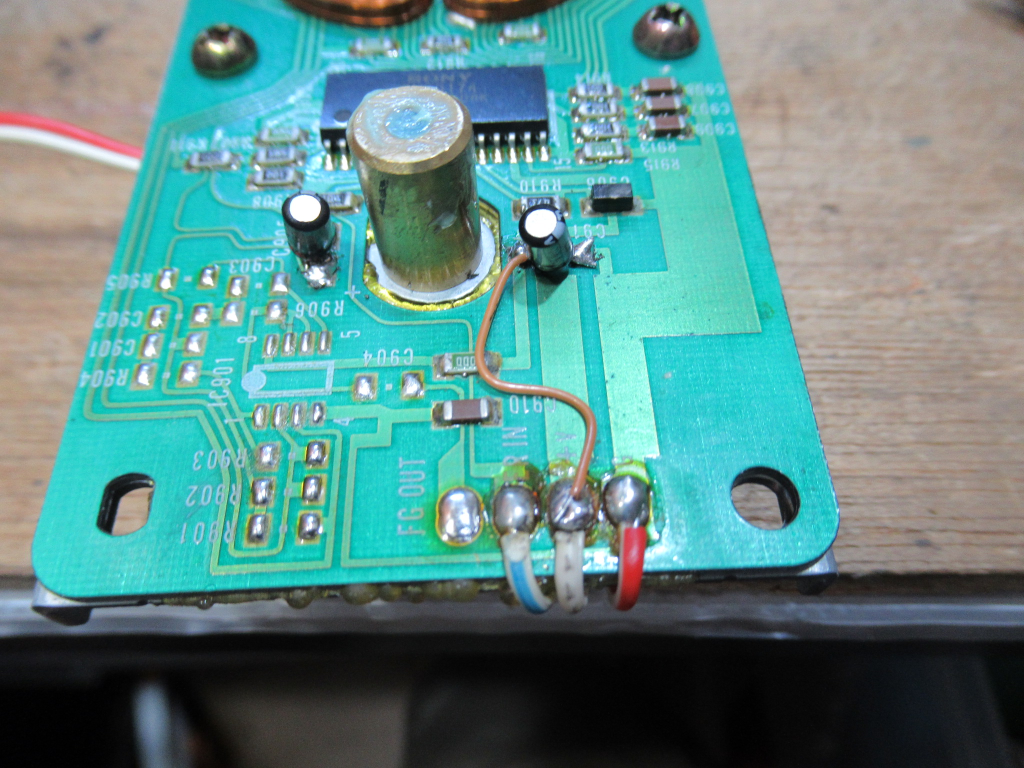 コンデンサーを取り外します。液漏れで基板に傷みが見られます。テスターで導通を点検したところ、一部が絶縁状態になっています。