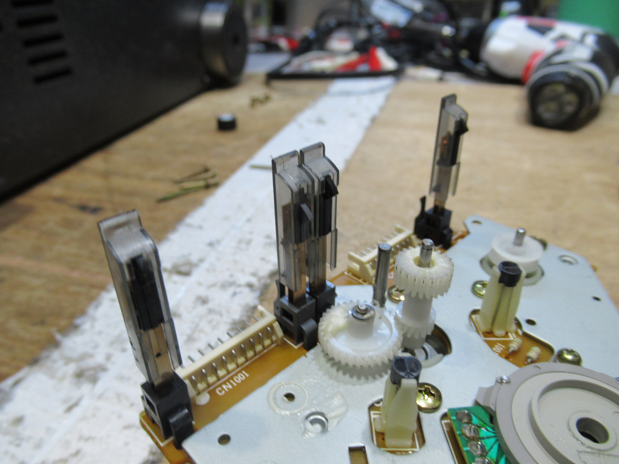今回は珍しい故障に遭遇しました。 SONYのTC-K333ESJですが、 トレイがここまでしか開きません。オーナー様のお話では、テープをセットして蓋を閉めるときに「ガリッ」と音がして、それ以降この状態 …