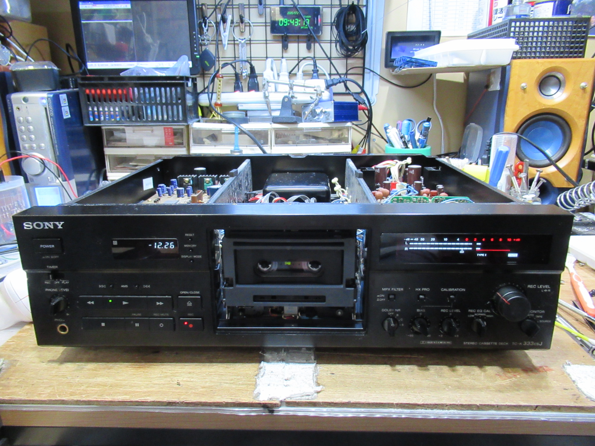 SONYのTC-K333ESJです。今回の故障は、かなりのレアケースです。 修理のご依頼内容は3点です。「メンテナンス」「左CH出力不良」「たまに音揺れする」ですが、問題は3点目です。「常時発生しない …