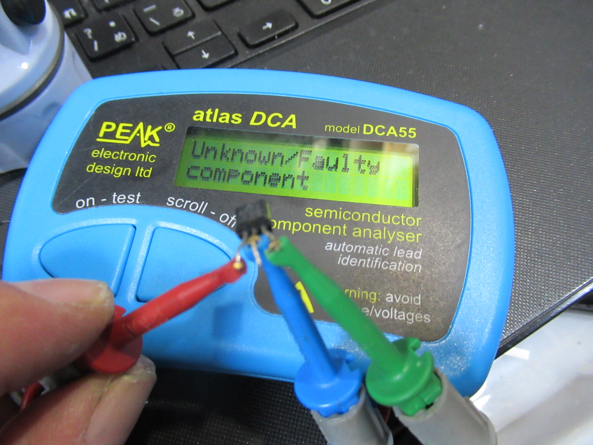 取り外したトランジスタをチェッカーで点検すると、やはり「UNKNOWN」と出ました。