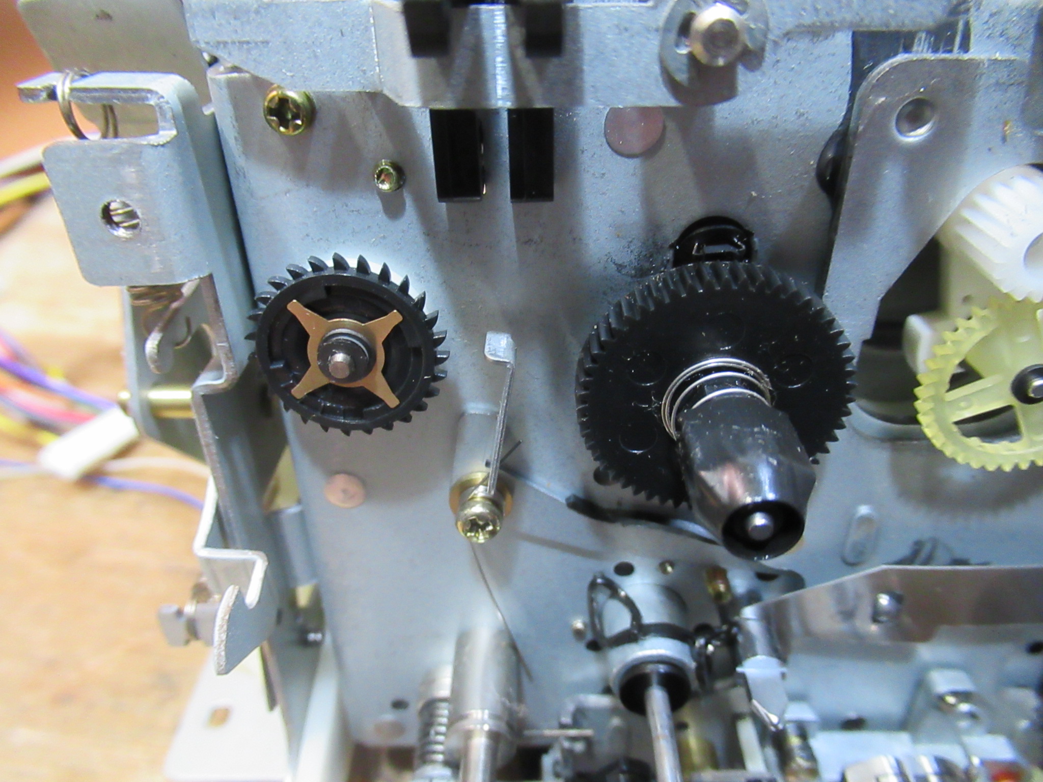 カバーを開けます。メカの上部にはテープセレクターのスイッチに関係するシールドを兼ねたプレートが取り付けられています。正常に動作させるためには、組み付けにコツが必要ですので、取り外す際には事前に十分な観察を行います。