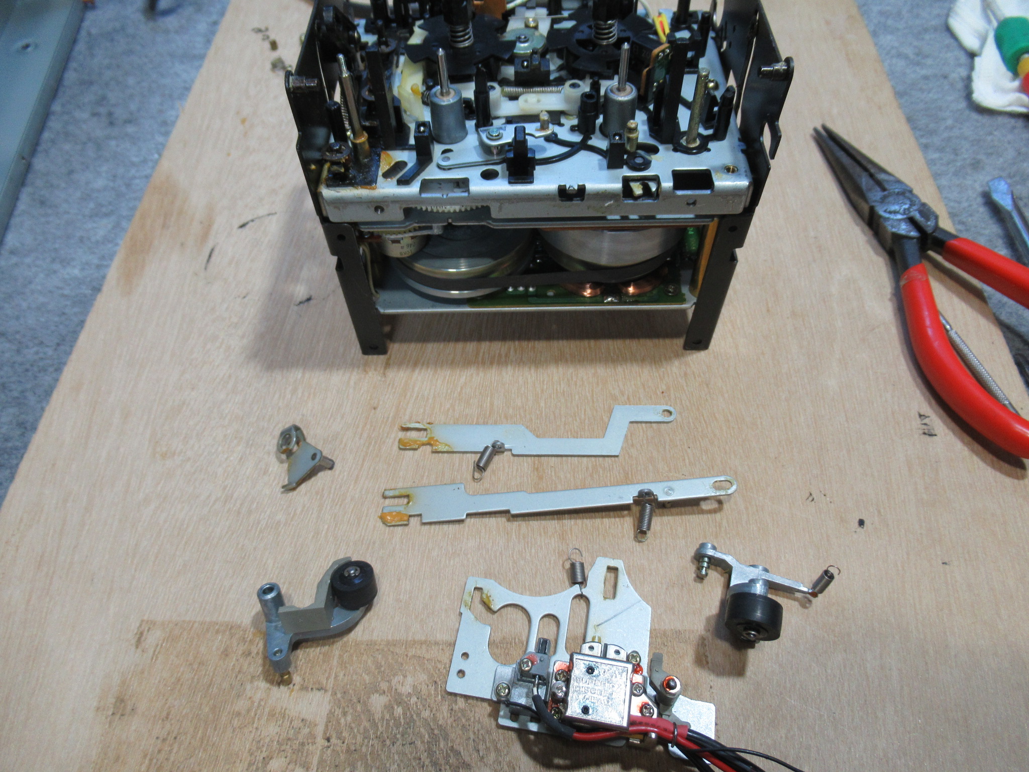 キャプスタンのシャフトにグリスを塗布し、新しいベルトを掛けて組み立てます。