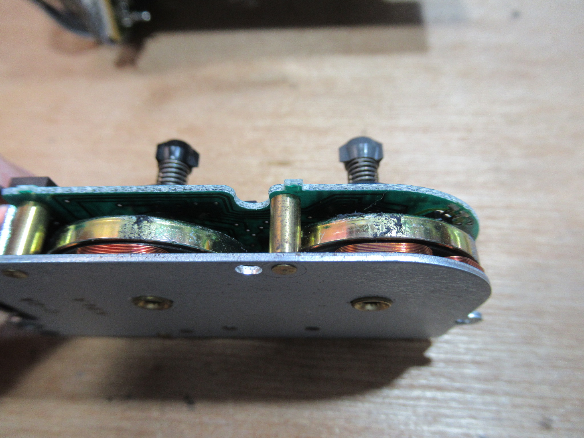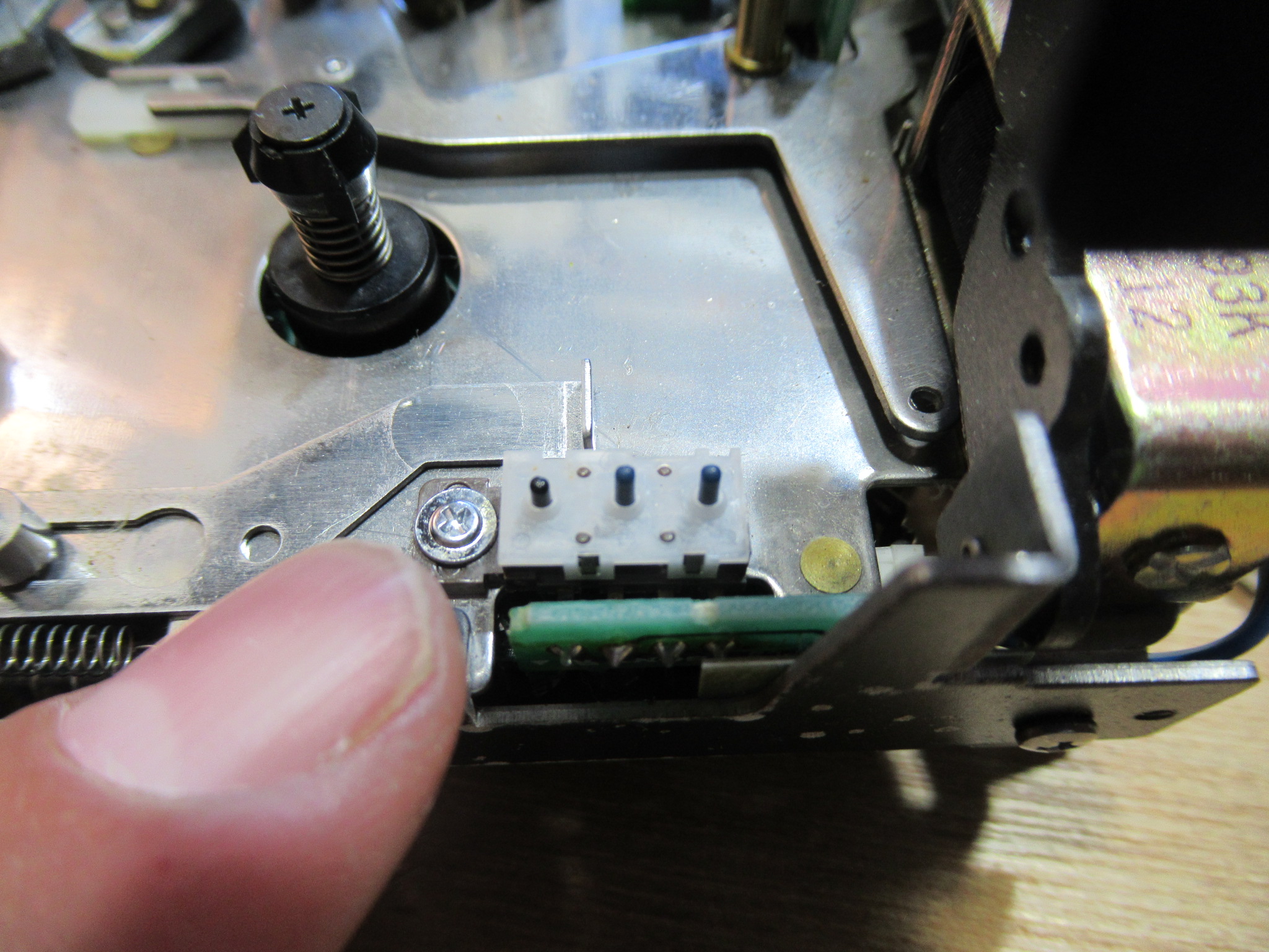メカを覗き込むと、右側のリールが回転していないことが分かりました。この状況は、ブレーキパッドがリールに張り付いてしまったことが原因ですので、リールの先端を摘まんで少し強めに回してやると、スルッと回転するようになりました。しかし、テープは走行するようになったものの、相変わらず音は出ません。