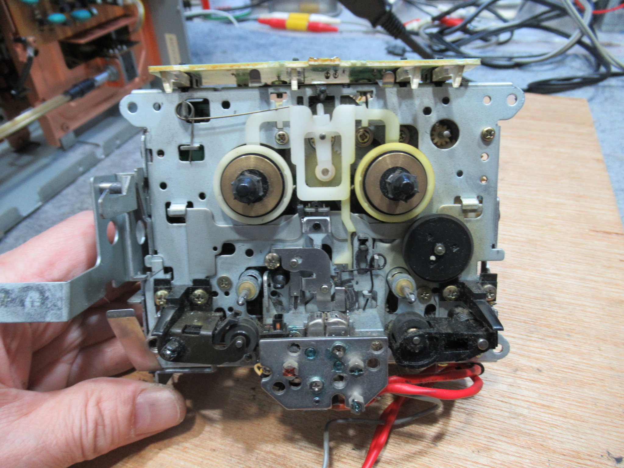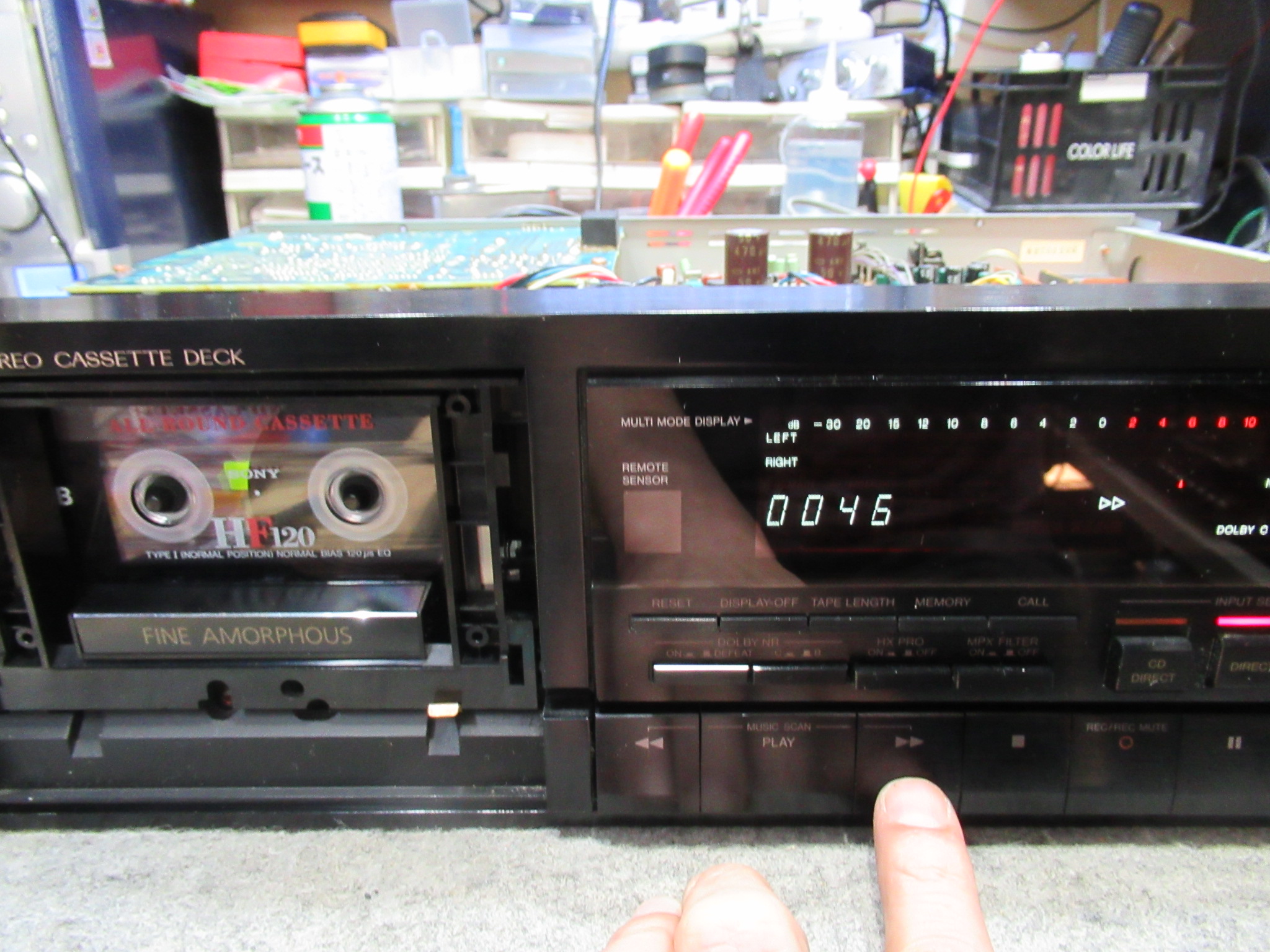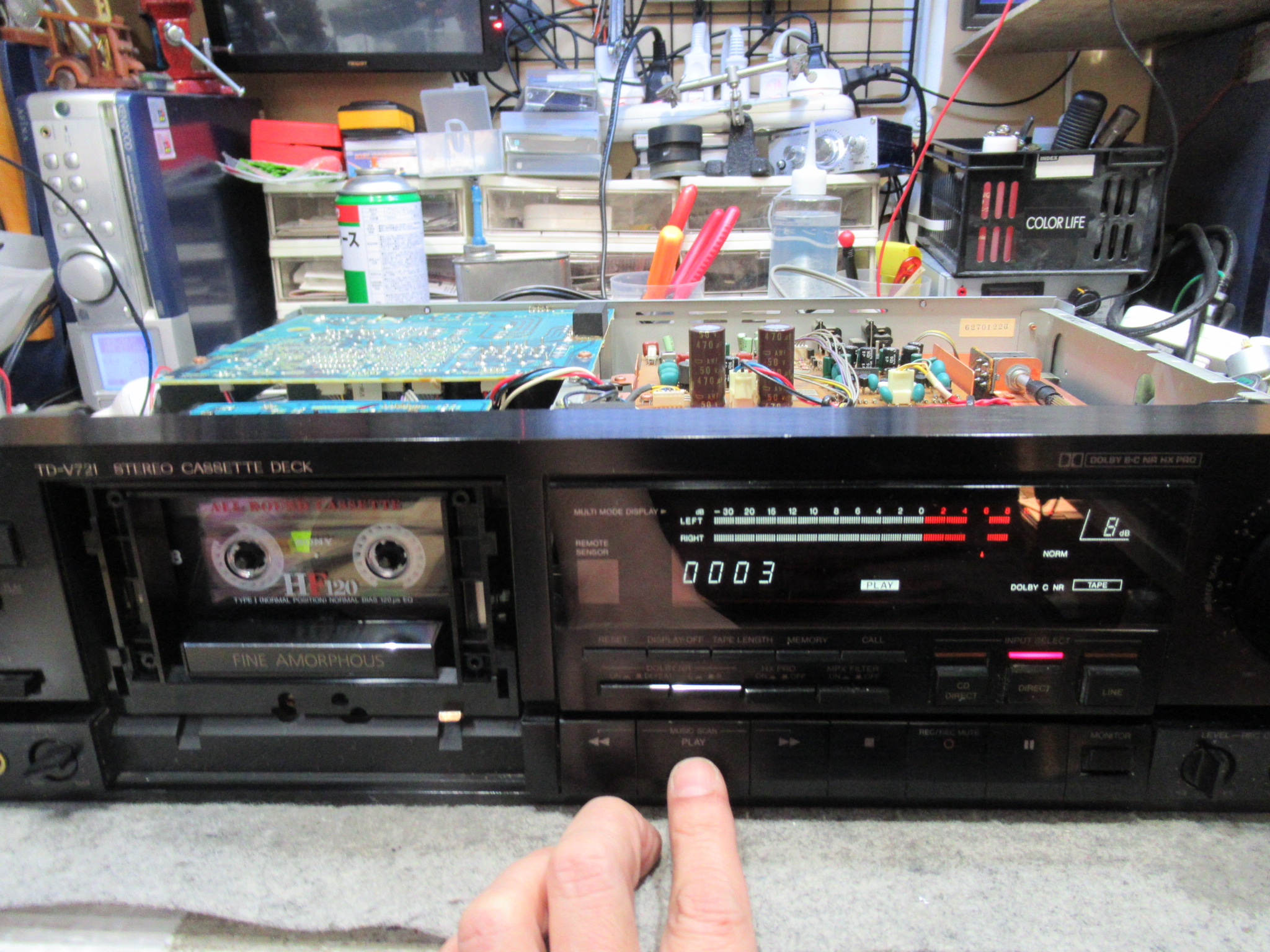 近郊にお住まいの方からのご依頼です。 ビクター製3ヘッドデュアルキャプスタンカセットデッキ、TD-V721です。 再生はOKですが、早送りと巻き戻しができません。 カバーと底板を取り外し、メカに接続さ …