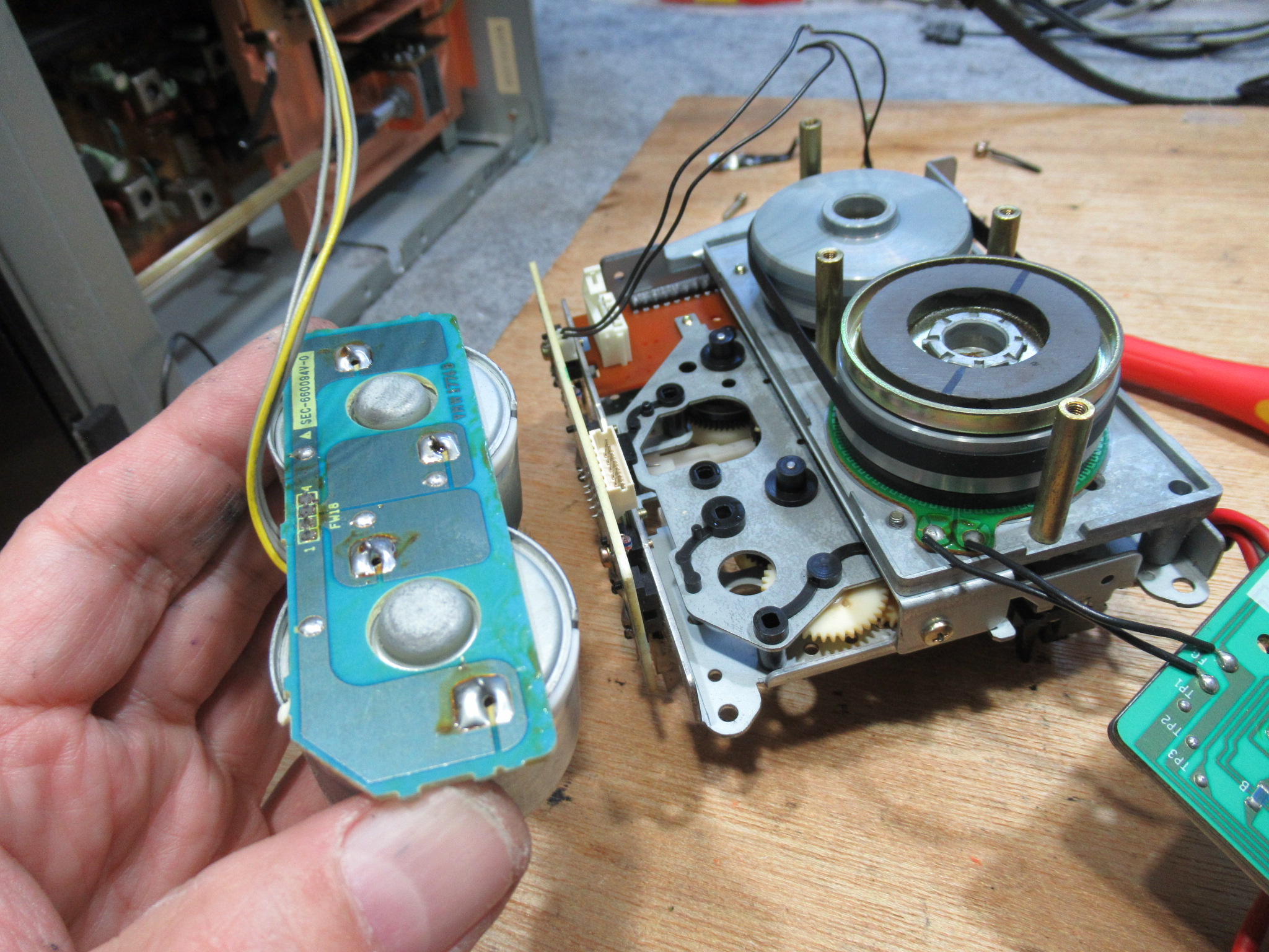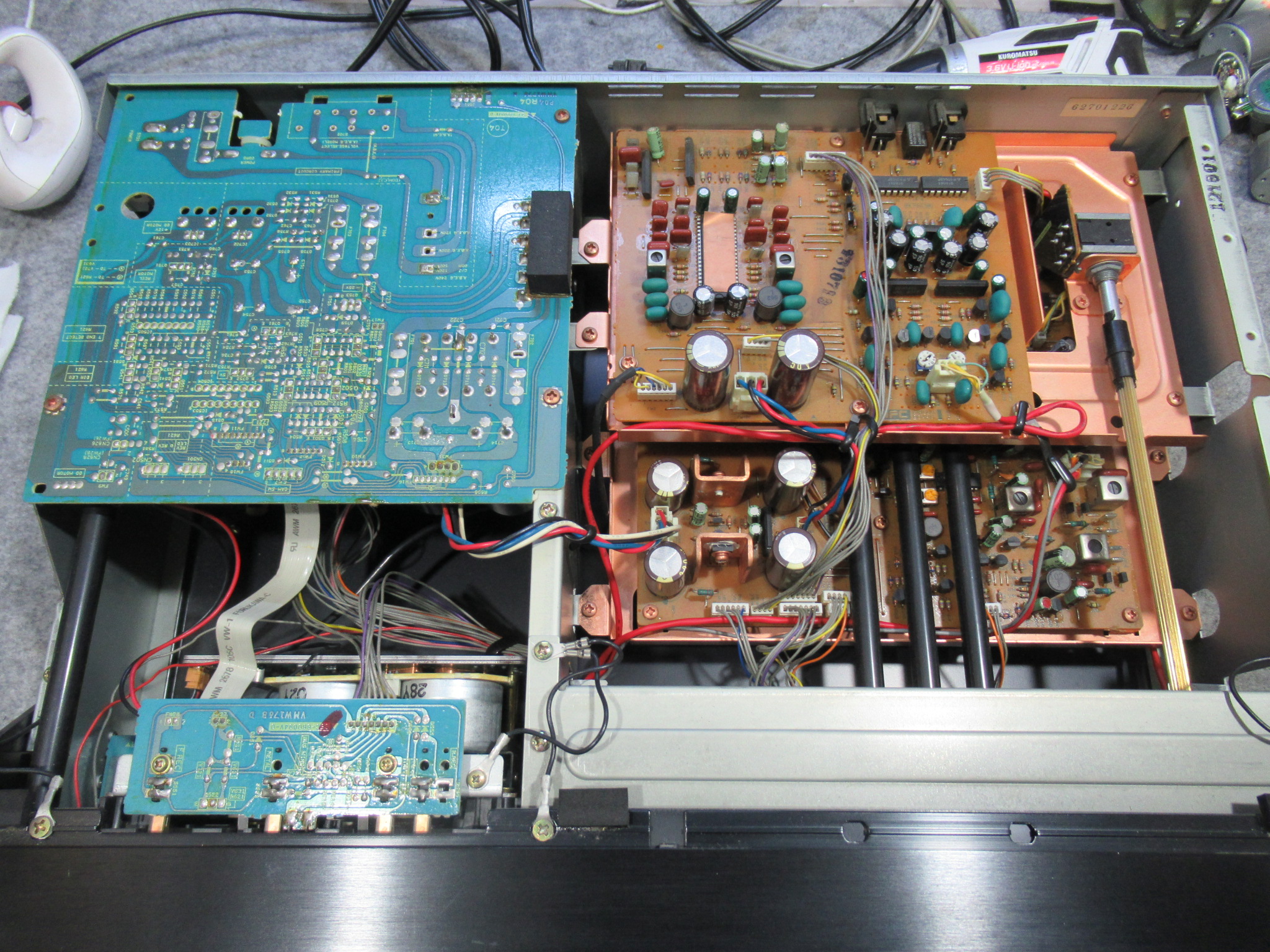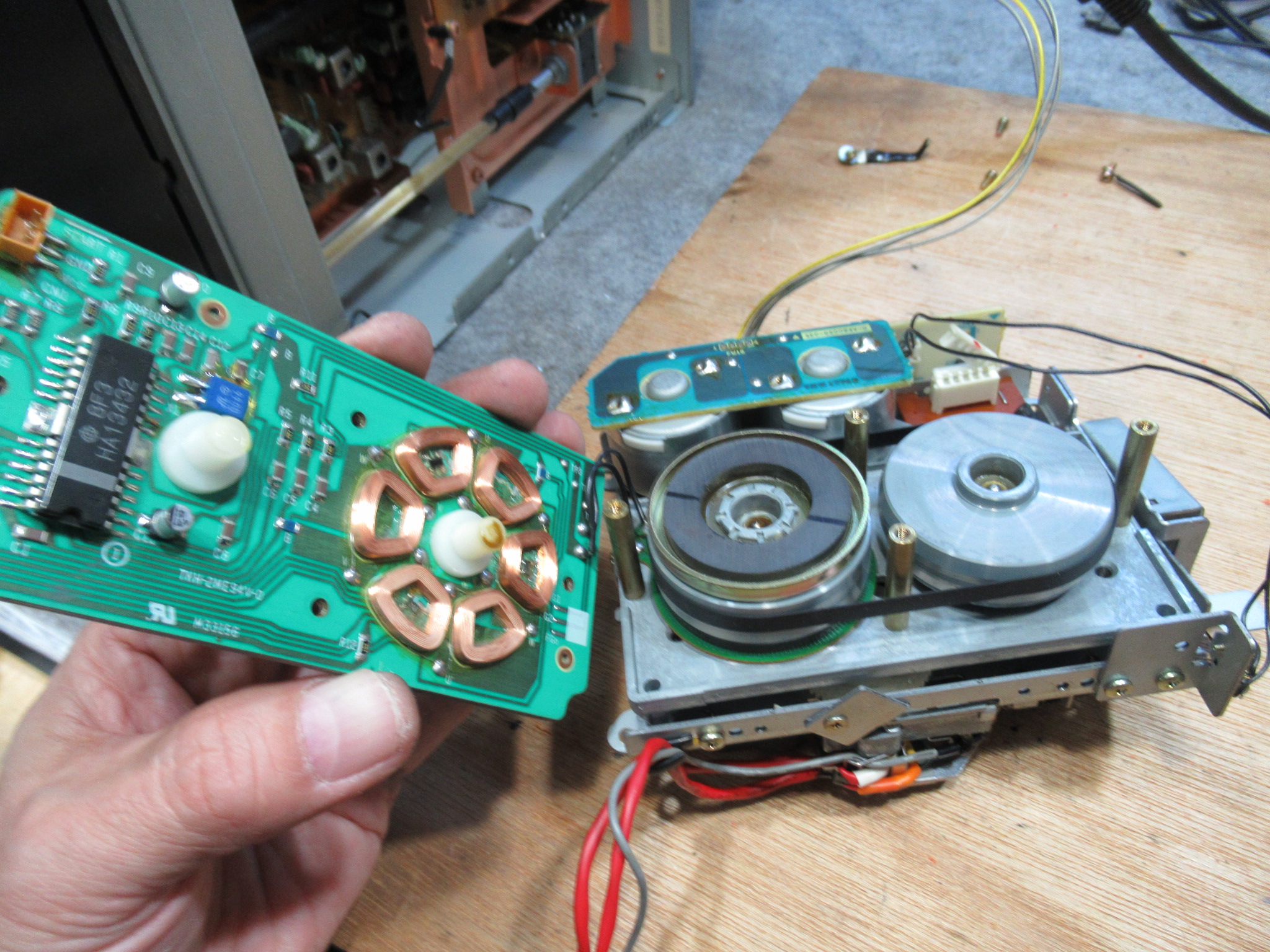 近郊にお住まいの方からのご依頼です。 ビクター製3ヘッドデュアルキャプスタンカセットデッキ、TD-V721です。 再生はOKですが、早送りと巻き戻しができません。 カバーと底板を取り外し、メカに接続さ …