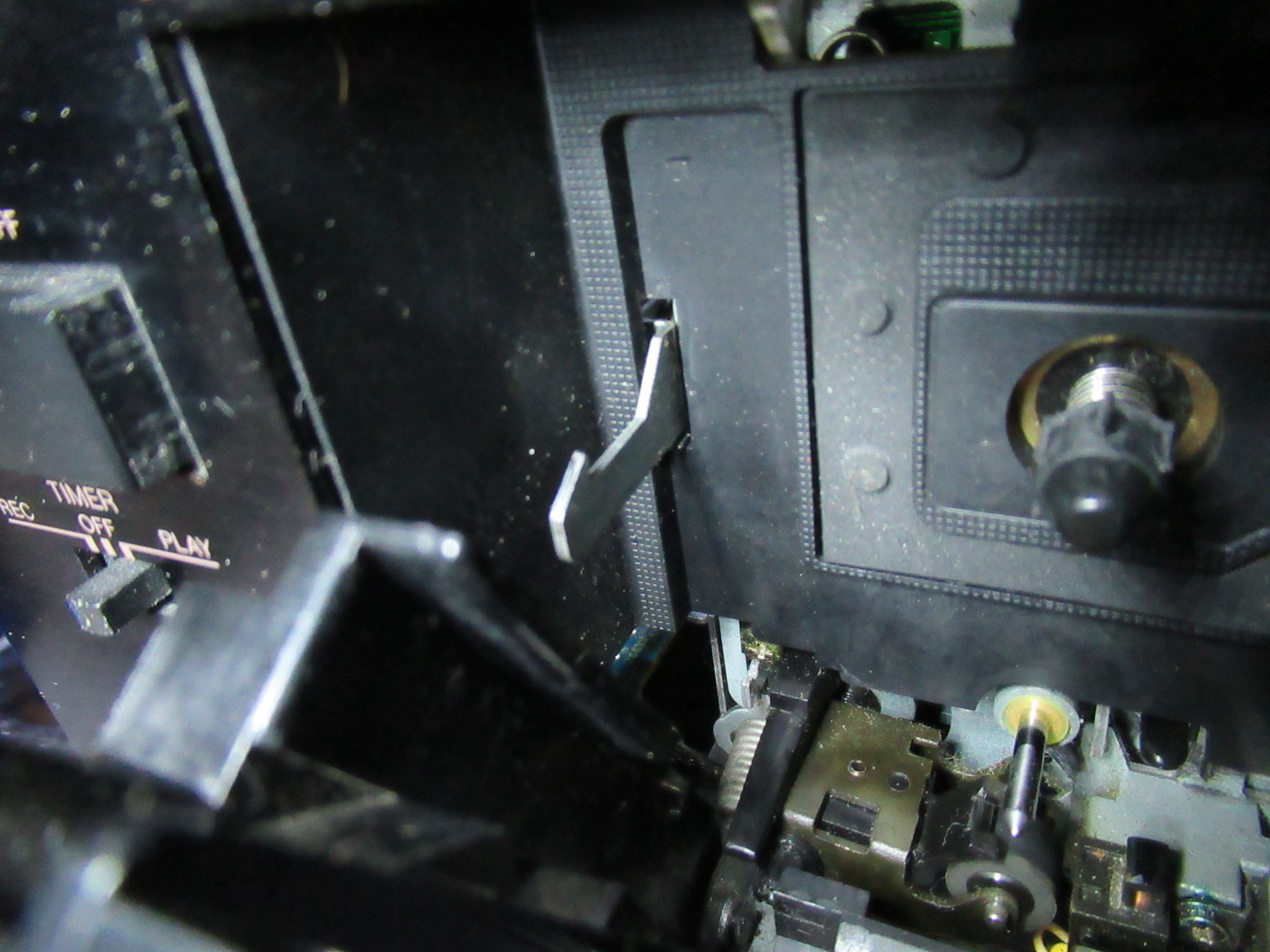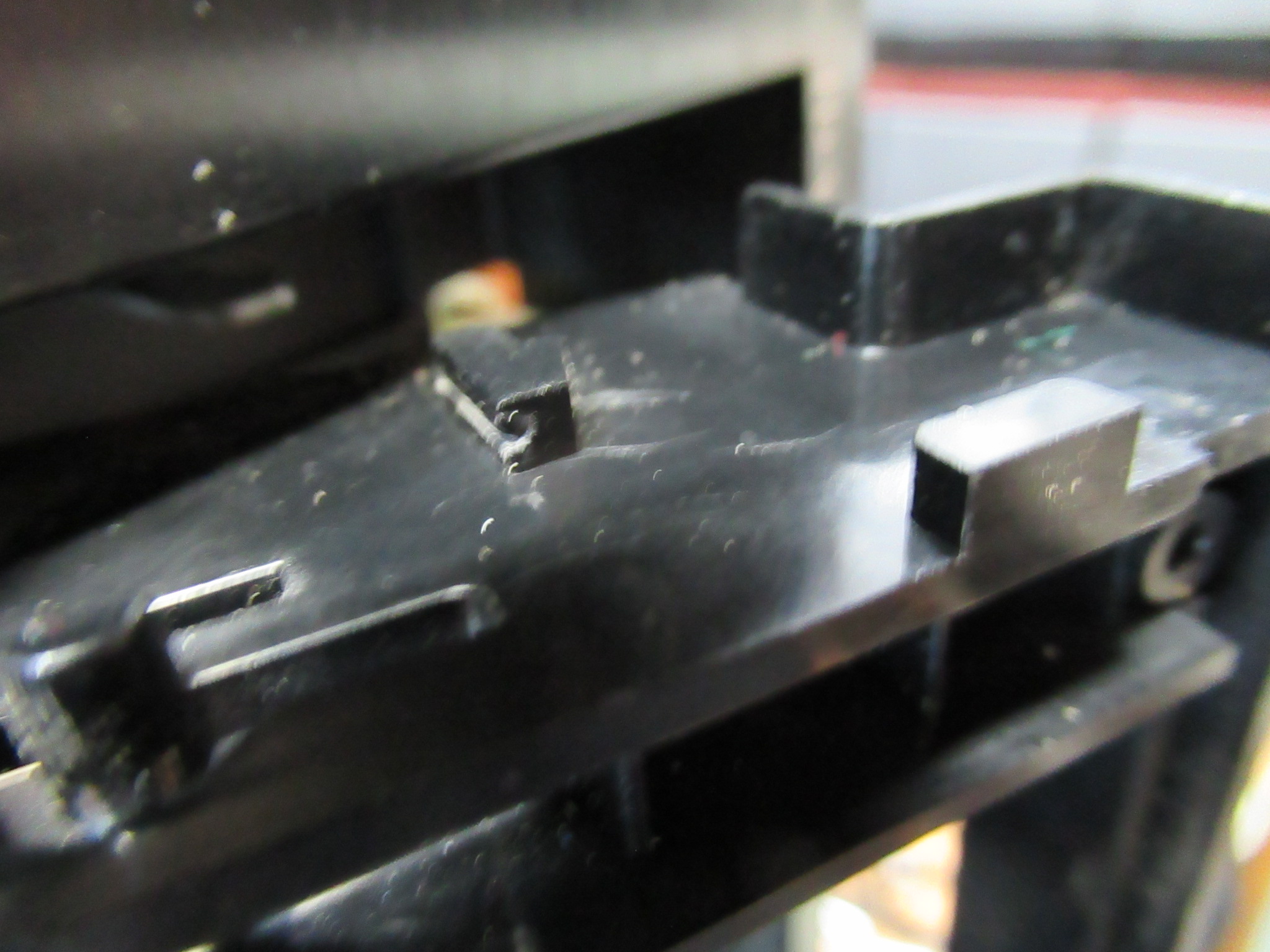 トレイ開閉の不具合を修理します。まず、リッドが取り付けた状態では勝手に開いてしまう件については、トレイを引っ掛けるレバー(右写真中央)とリッドが干渉していましたので修正します。