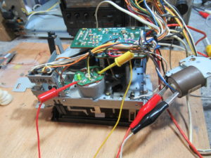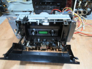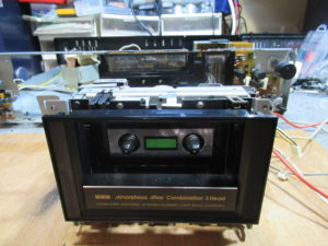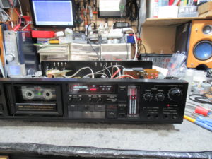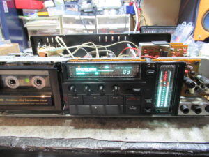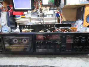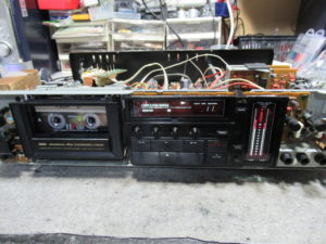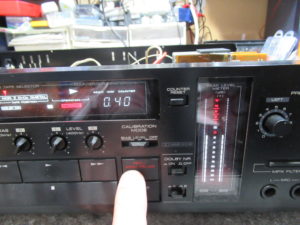 不具合の状況ですが、事前にお聞きしていたのは、「レベルメーターが点灯しないこと」、「カウンタ表示が暗いこと」、「テープ走行がすぐに停止すること」ということでした。しかし、メーターはご覧のとおり点灯しませんでしたが、