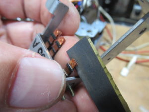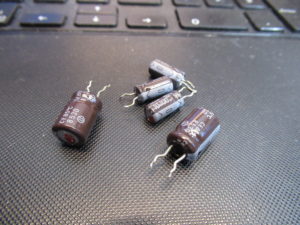 筐体をほぼバラバラにして基板を取り出します。1ケだけすでに交換済みでしたので、故障していないものも含め、関係するコンデンサー5ケを交換します。
