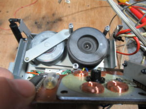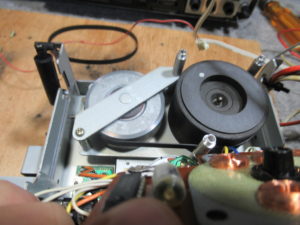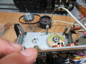 モーター基板とフライホイールを取り外し、キャプスタンにグリスアップ後、新しいベルトを掛けて組み立てます。