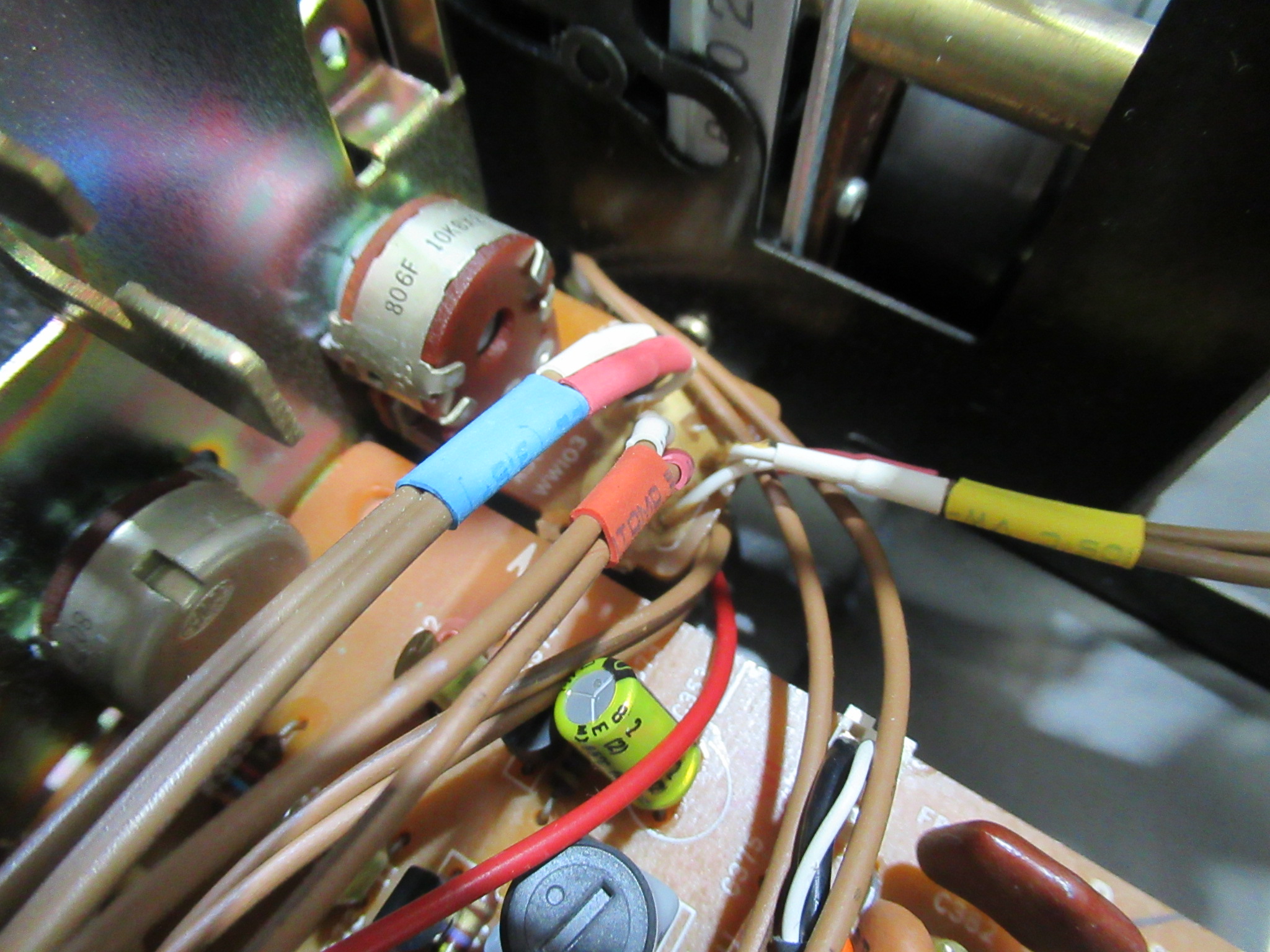 絶縁しているケーブルの接続部を再半田するとともに、念のためにOUTPUT端子からヘッドホンVOLにバイパス線を増設します。