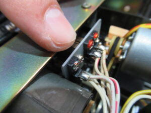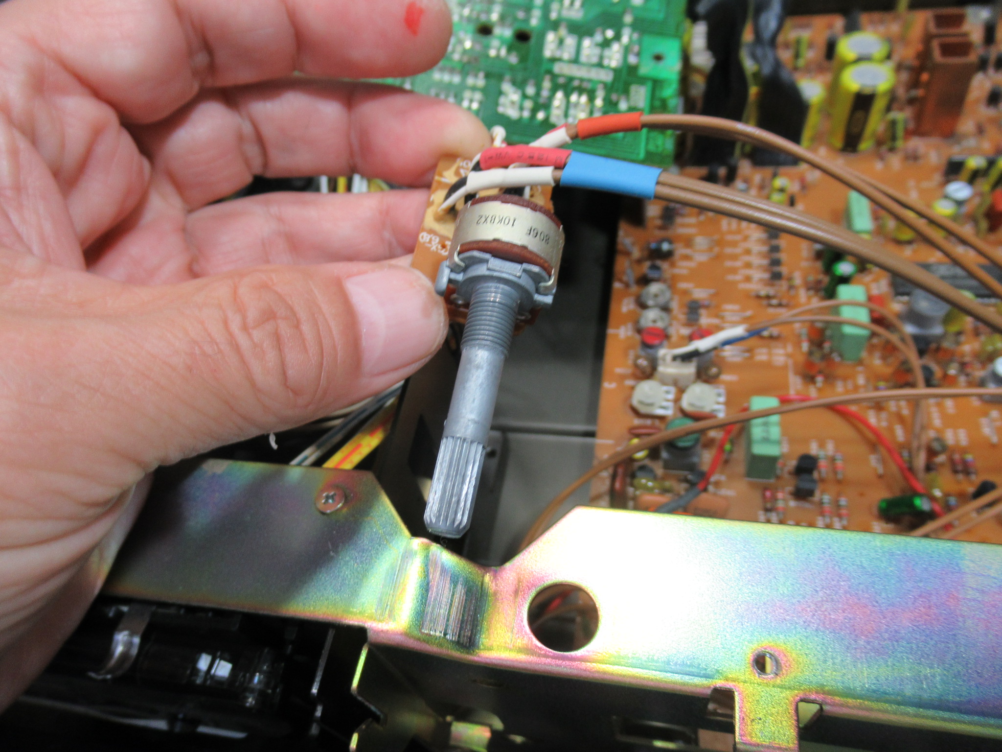 ヘッドホンVOLを取り外します。メーターとヘッドホンへの出力は、LINEOUTの端子の直前で分岐して、ここを経由しますので、この周辺に接触不良が起きている可能性があります。