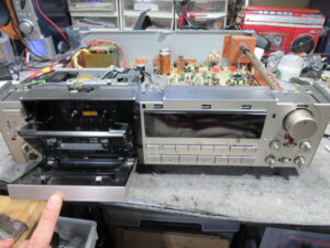 パイオニア製3ヘッドデュアルキャプスタンカセットデッキ、T-858の修理依頼をいただきました。 テープが絡むようになったということです。 イジェクトは動作しましたが、自力で閉まることはできません。 手 …