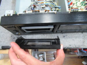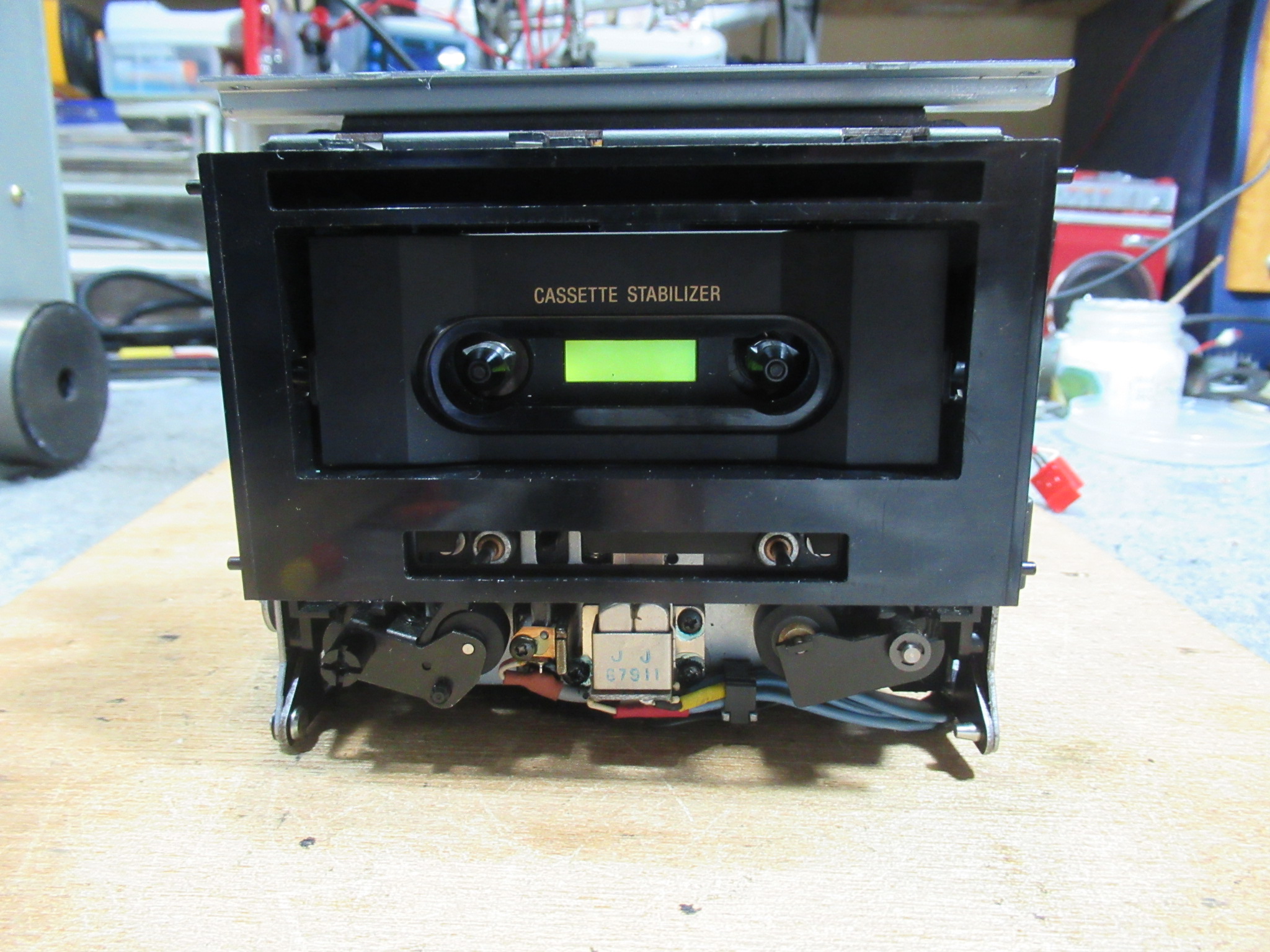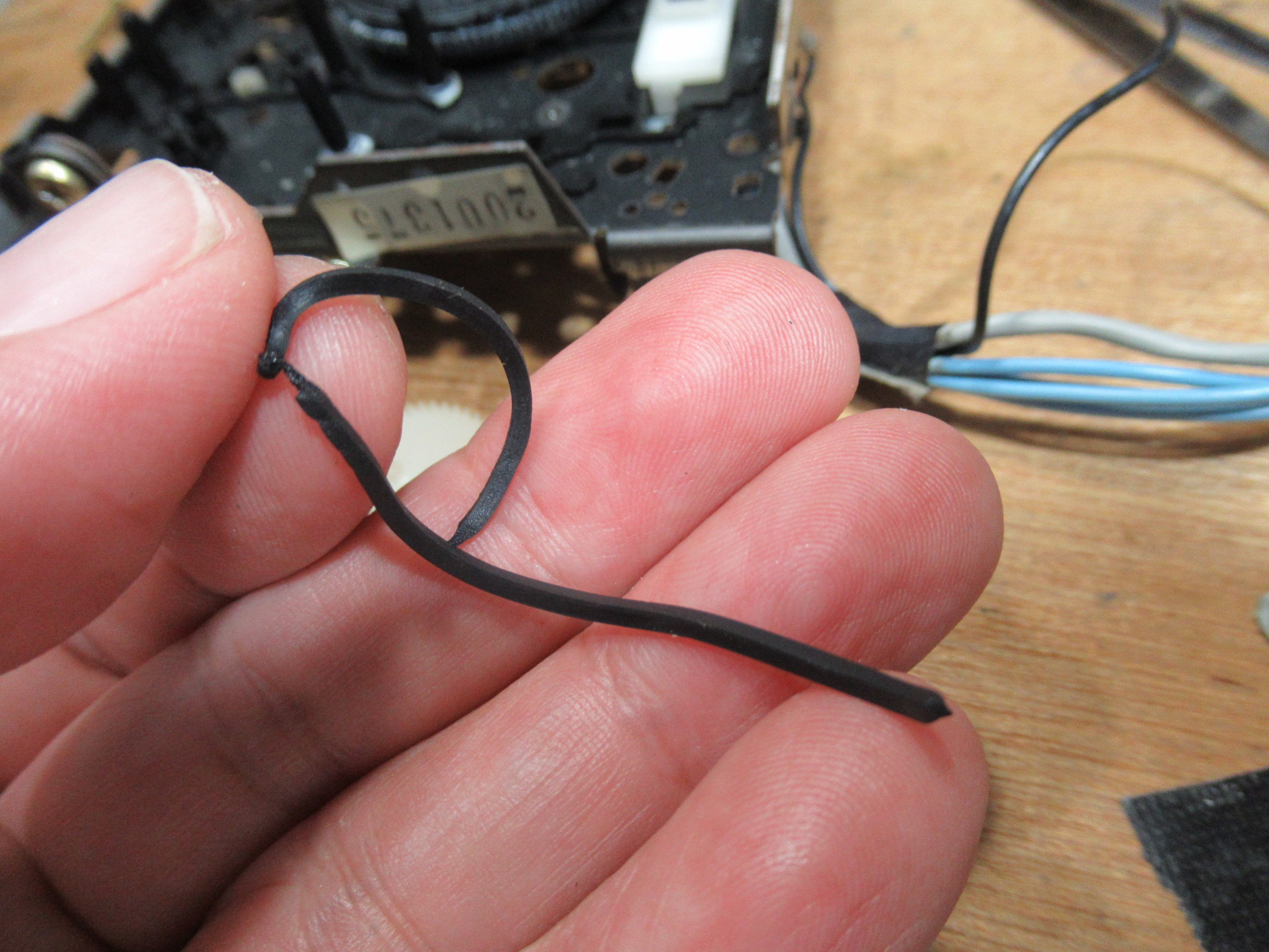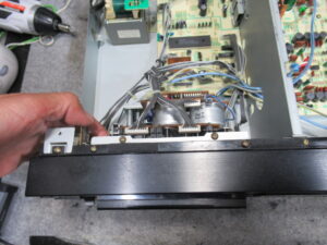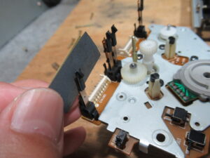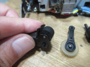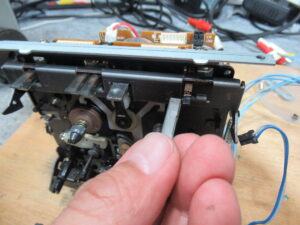 調整式になっている左側のピンチローラーアームの位置を測定したところ、2mmほど前方にせり出していました。これでは正常にテープ走行できません。