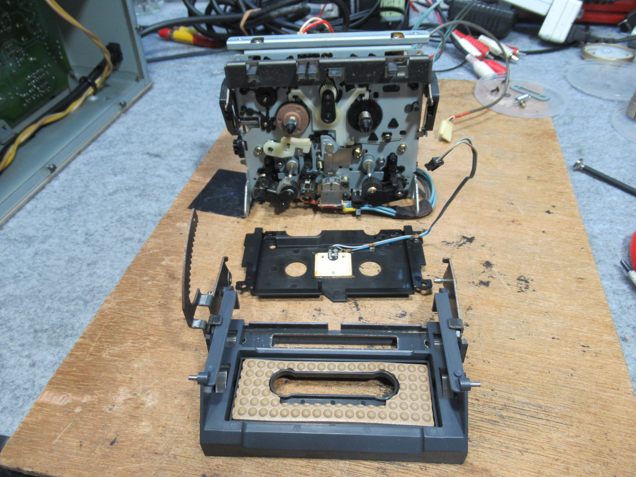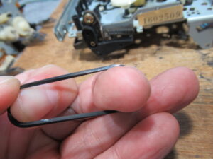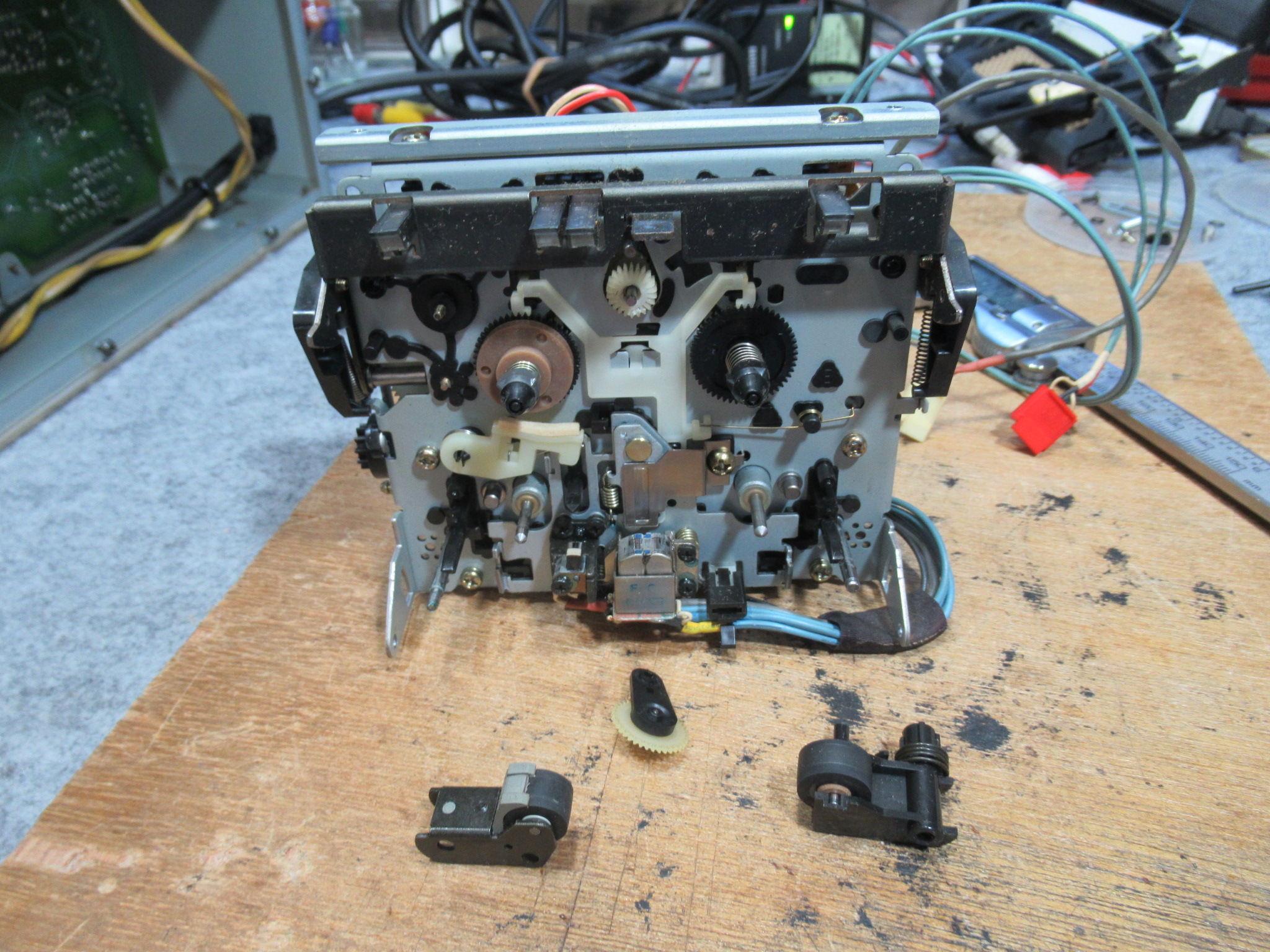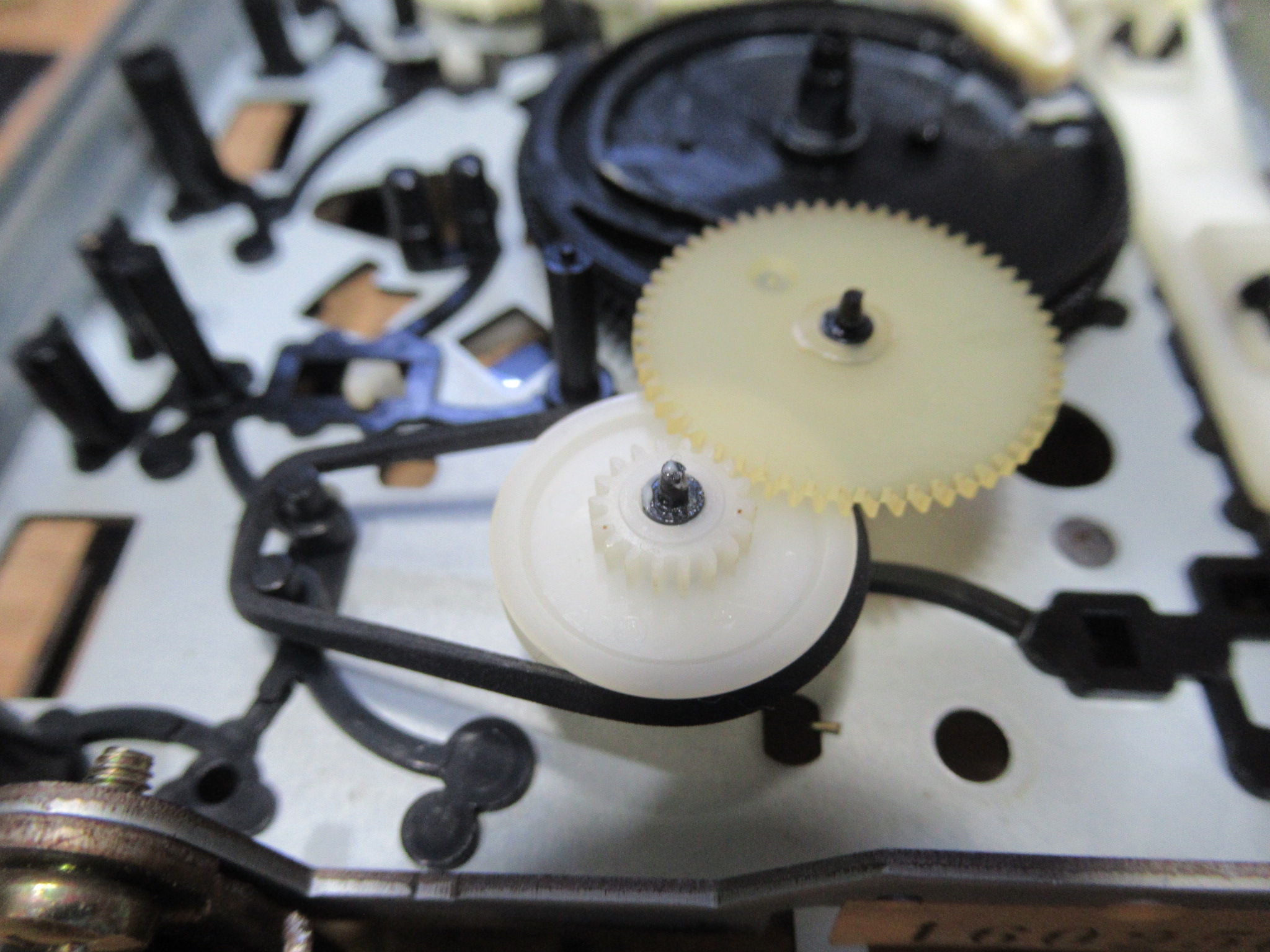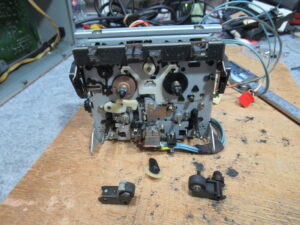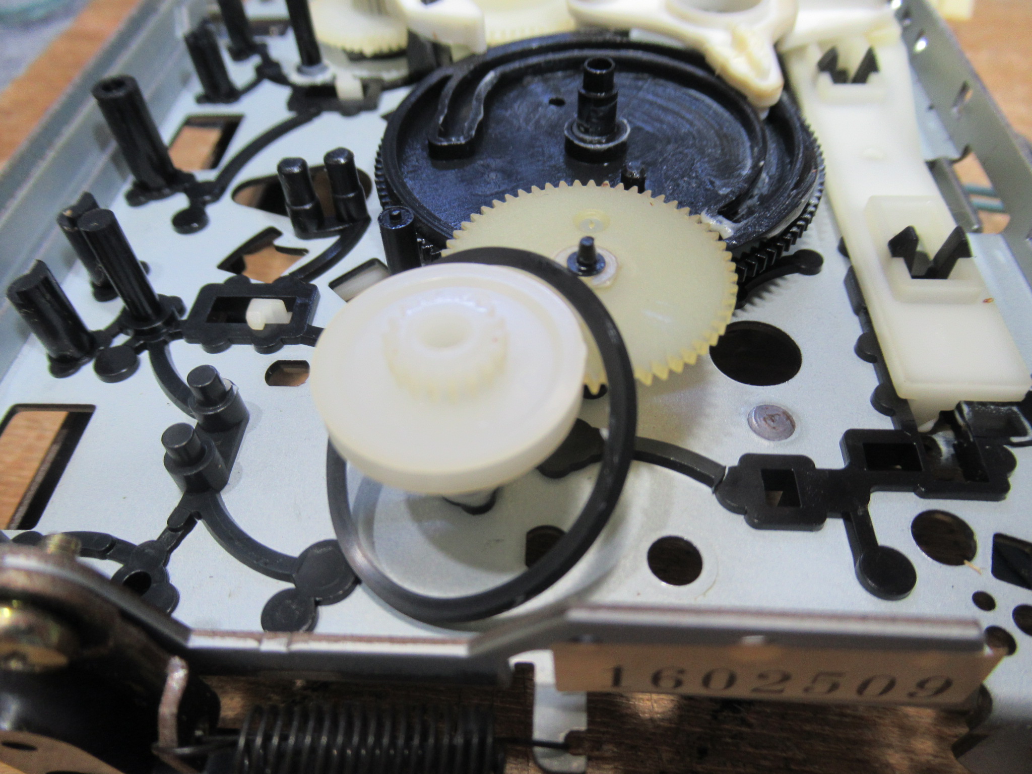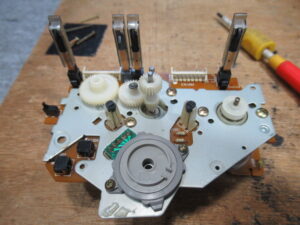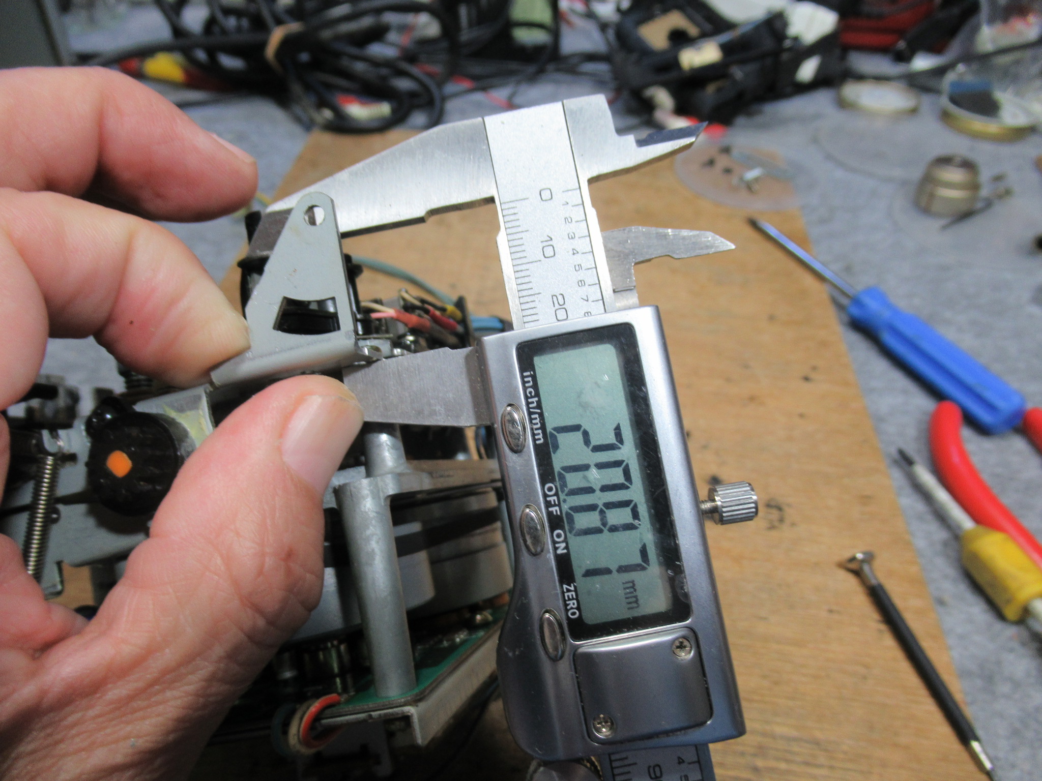 組み付け時に備えて、調整式になっている左側ピンチローラーアームの位置を測定します。標準的な位置から0.3mm程度とやや奥側に調整されていますが、10年前にメーカーサービスでヘッドを交換されたということですので、ヘッドとピンチローラーの位置はその時に再調整されたと考えられます。ピンチローラーの位置を変えると、ヘッドも調整が必要になりますので、組み付け時は元々の位置に調整します。