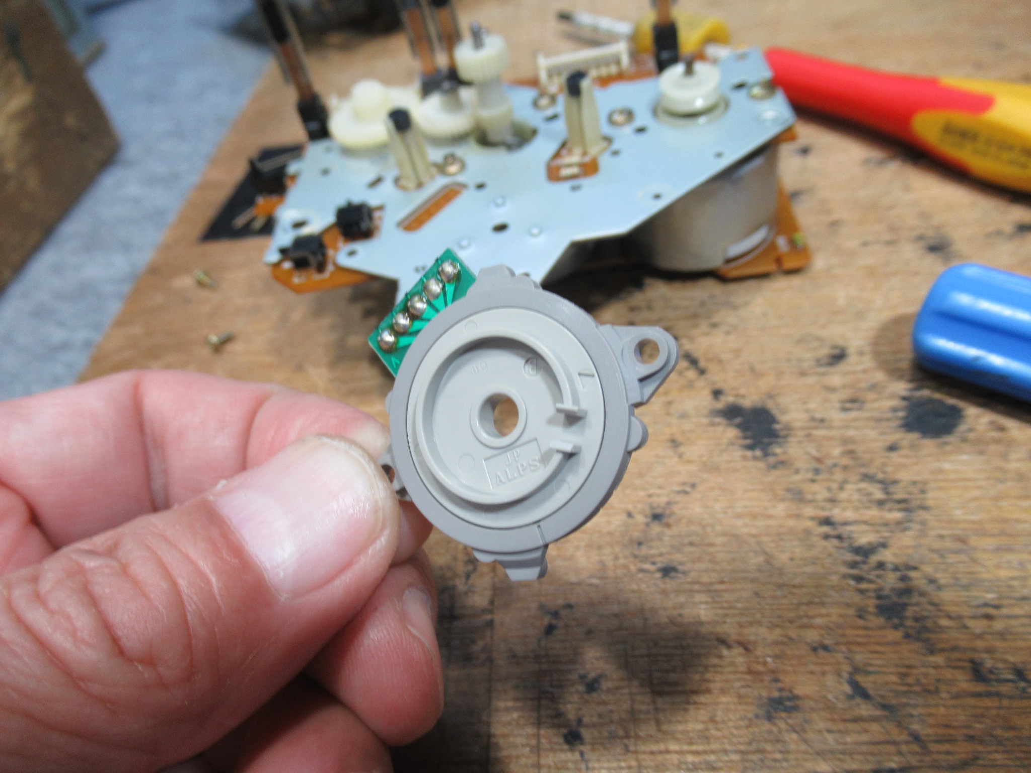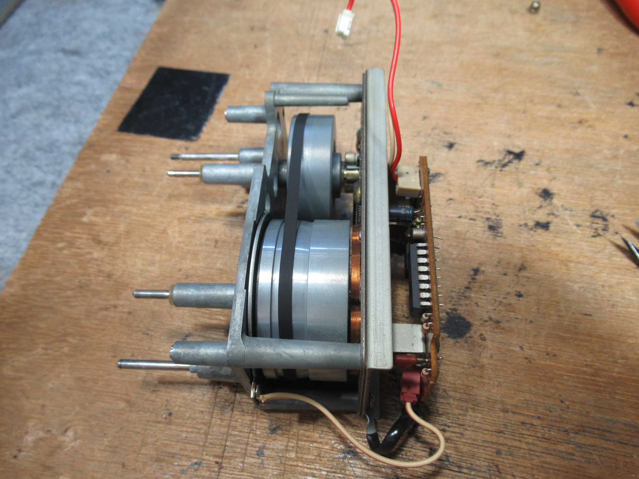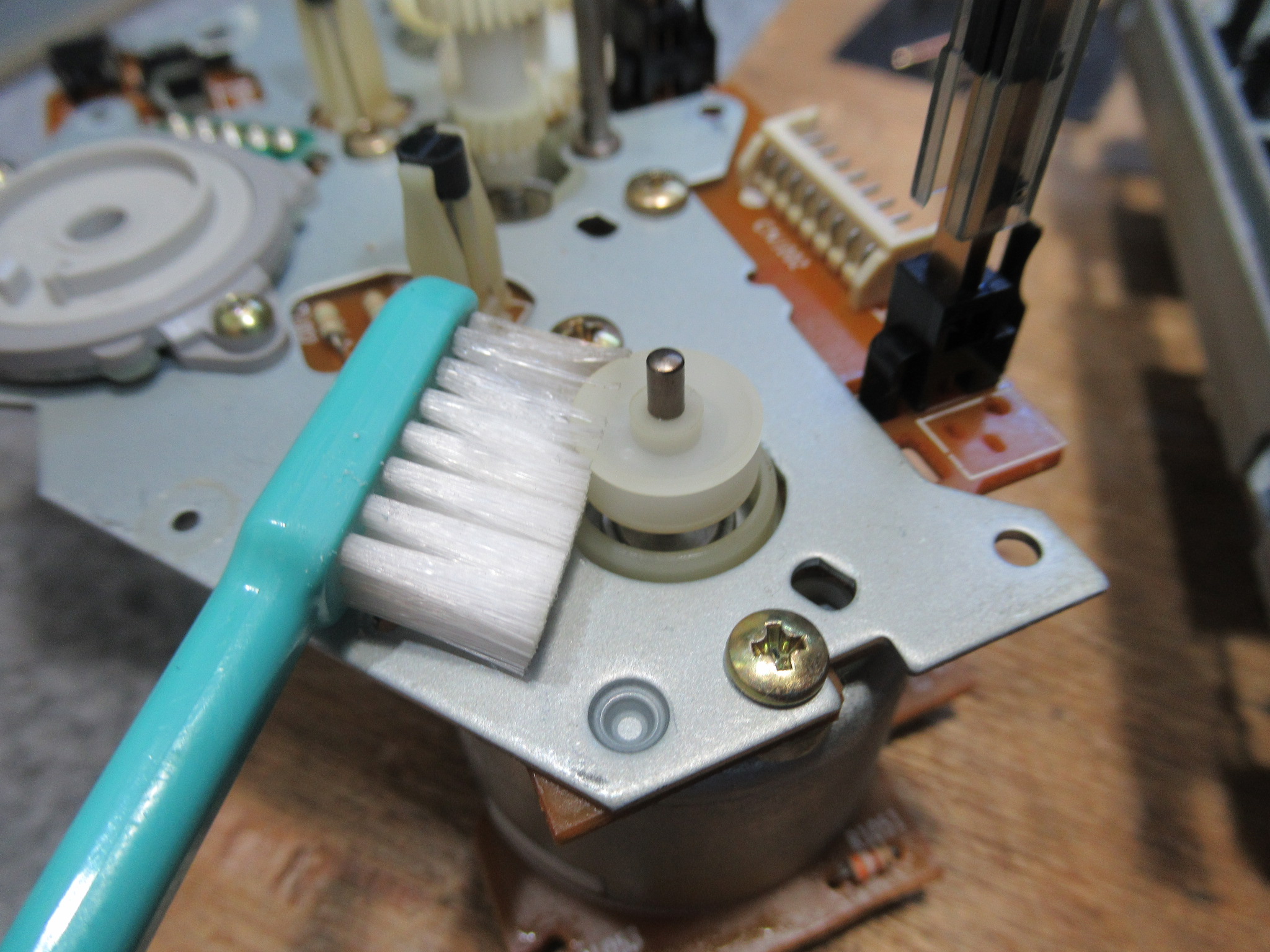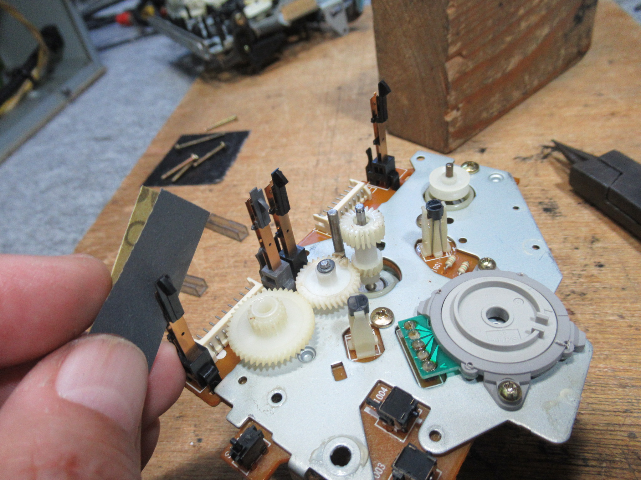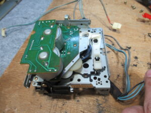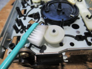 組み付け時に備えて、調整式になっている左側ピンチローラーアームの位置を測定します。標準的な位置から0.3mm程度とやや奥側に調整されていますが、10年前にメーカーサービスでヘッドを交換されたということですので、ヘッドとピンチローラーの位置はその時に再調整されたと考えられます。ピンチローラーの位置を変えると、ヘッドも調整が必要になりますので、組み付け時は元々の位置に調整します。