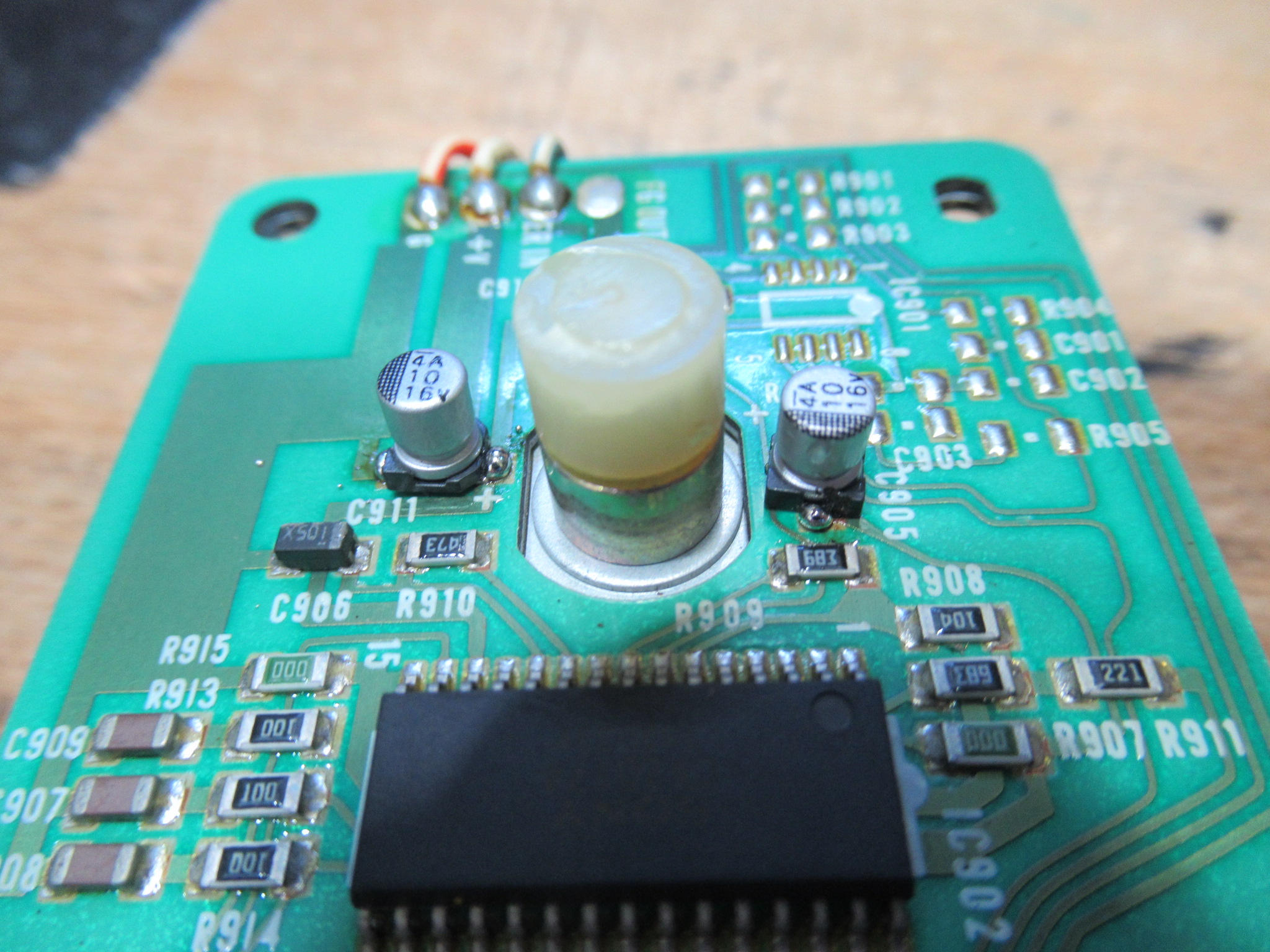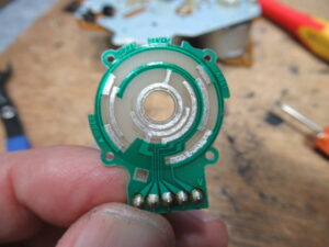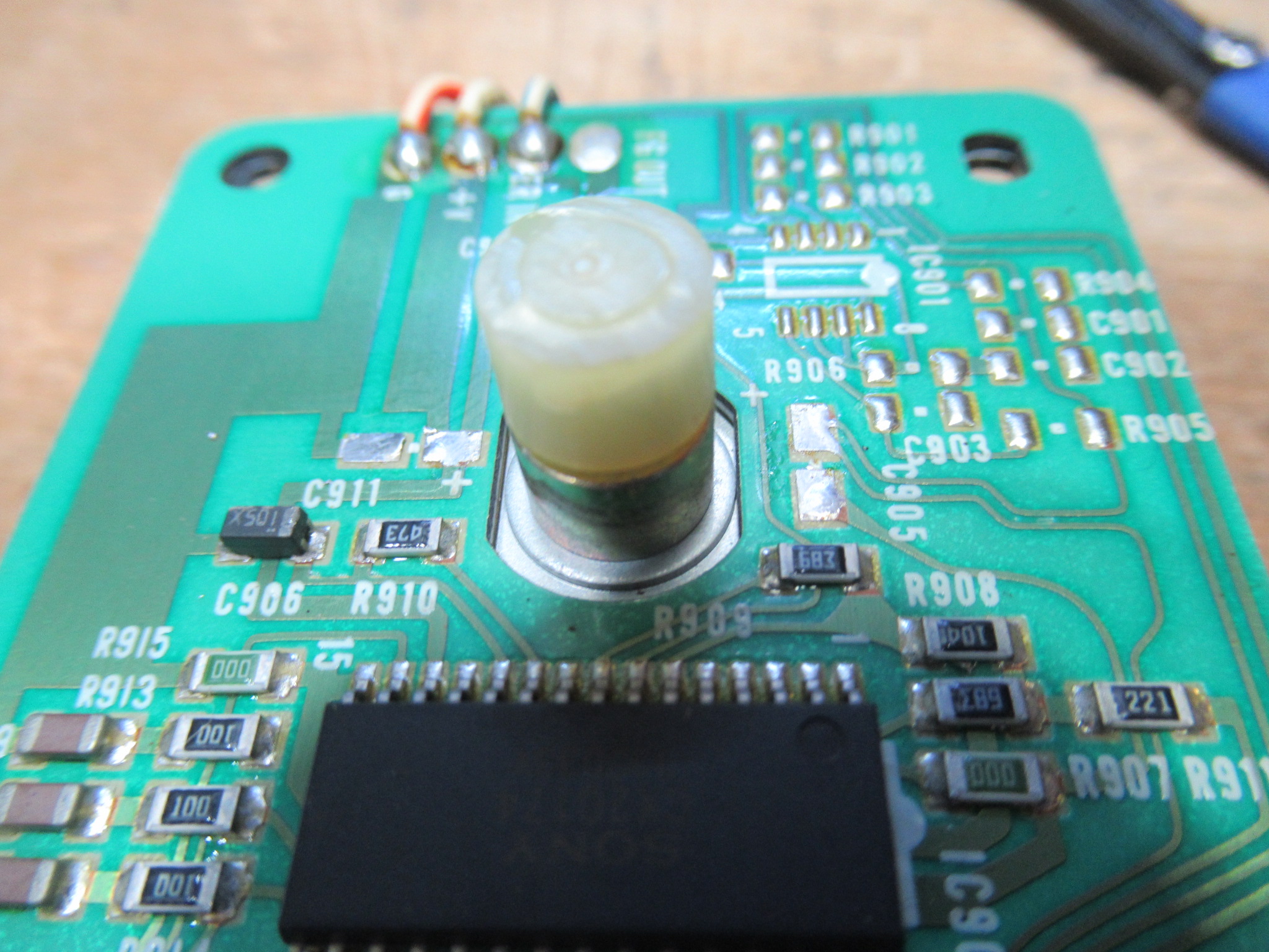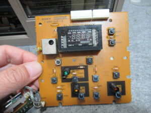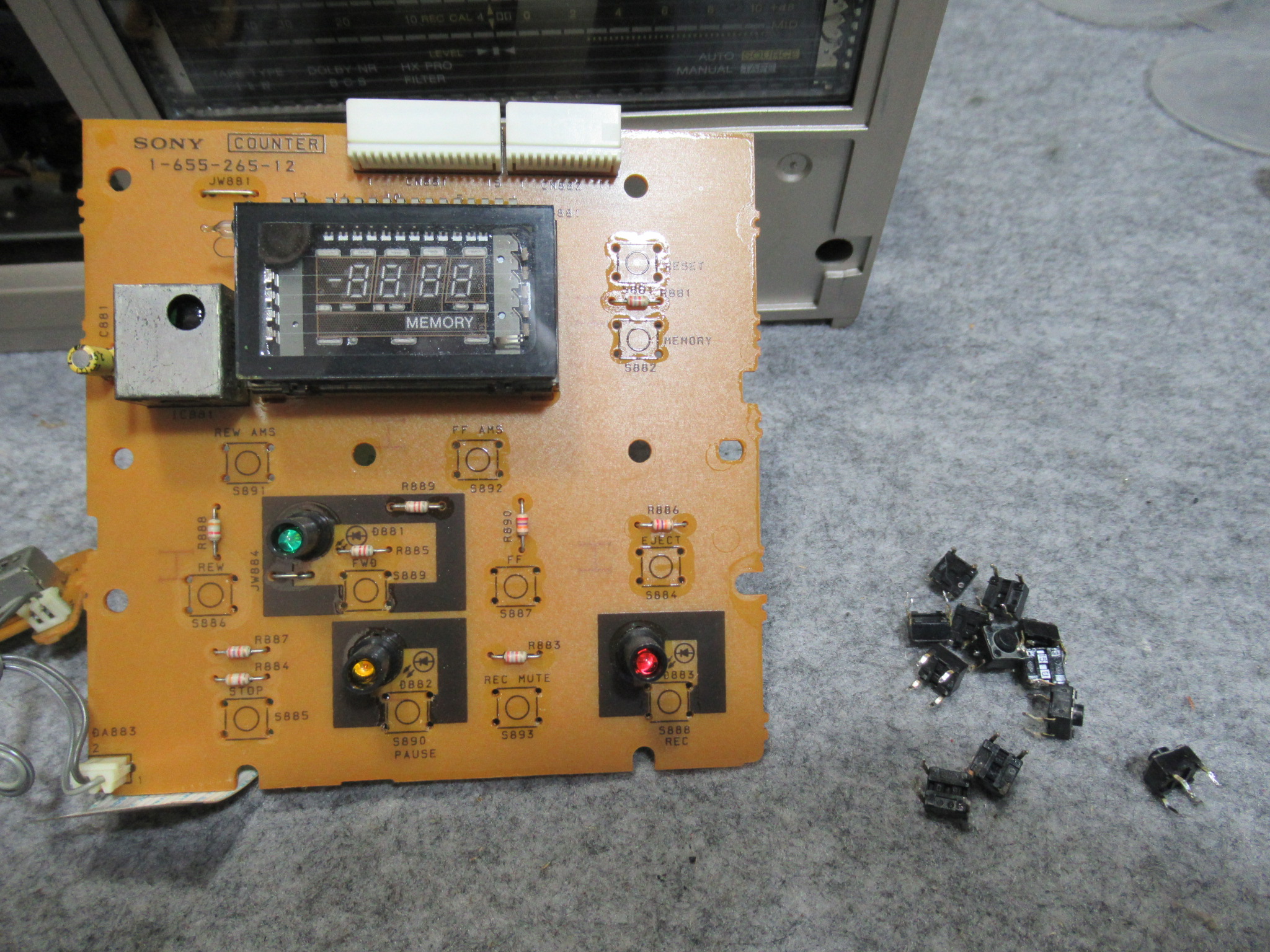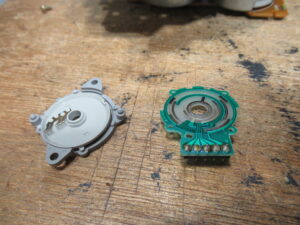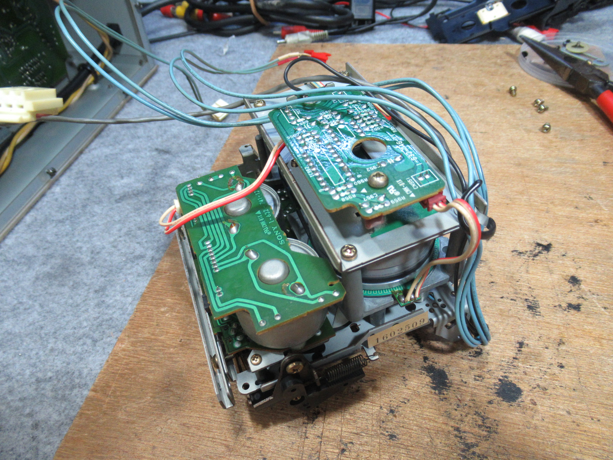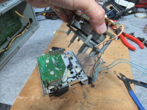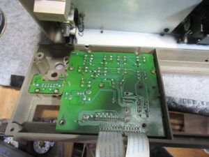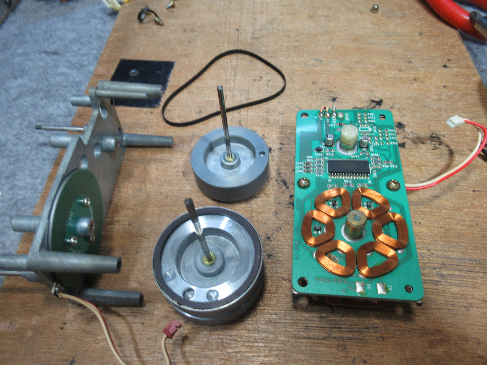 組み付け時に備えて、調整式になっている左側ピンチローラーアームの位置を測定します。標準的な位置から0.3mm程度とやや奥側に調整されていますが、10年前にメーカーサービスでヘッドを交換されたということですので、ヘッドとピンチローラーの位置はその時に再調整されたと考えられます。ピンチローラーの位置を変えると、ヘッドも調整が必要になりますので、組み付け時は元々の位置に調整します。