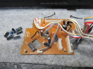 黒色のパーツは、ヘッドのモーター部のコネクタです。ご覧のとおり、端子8本が外部に露出していて、基板に半田付けされています。黒色の部分は固定されていませんので、ヘッドのフラットケーブルを差し込むときにグラグラします。今回の故障は、その露出している端子2本が断裂していました。何度か抜き差ししているうちに金属疲労と劣化により破損したと考えられますが、初めてのケースです。
