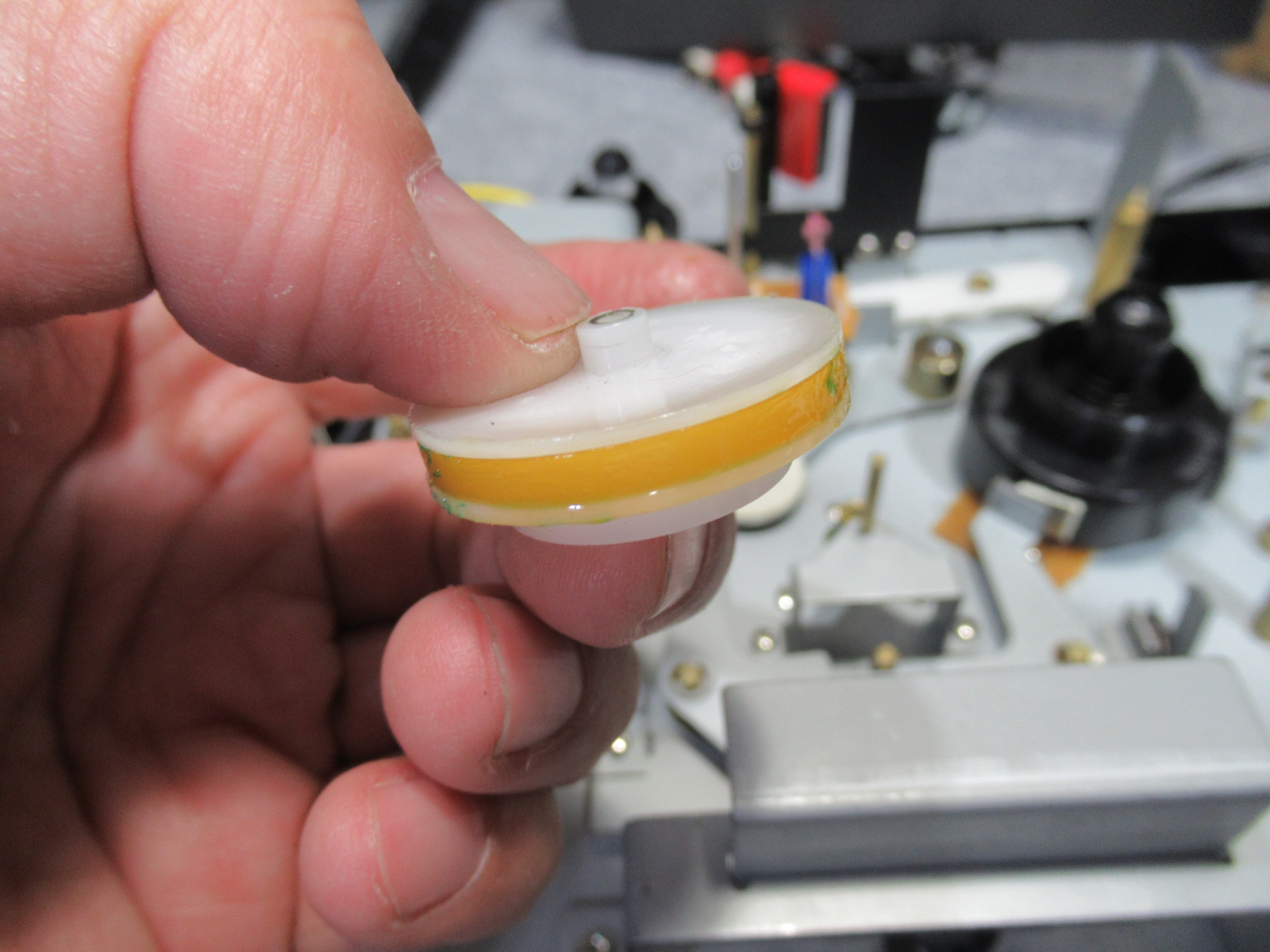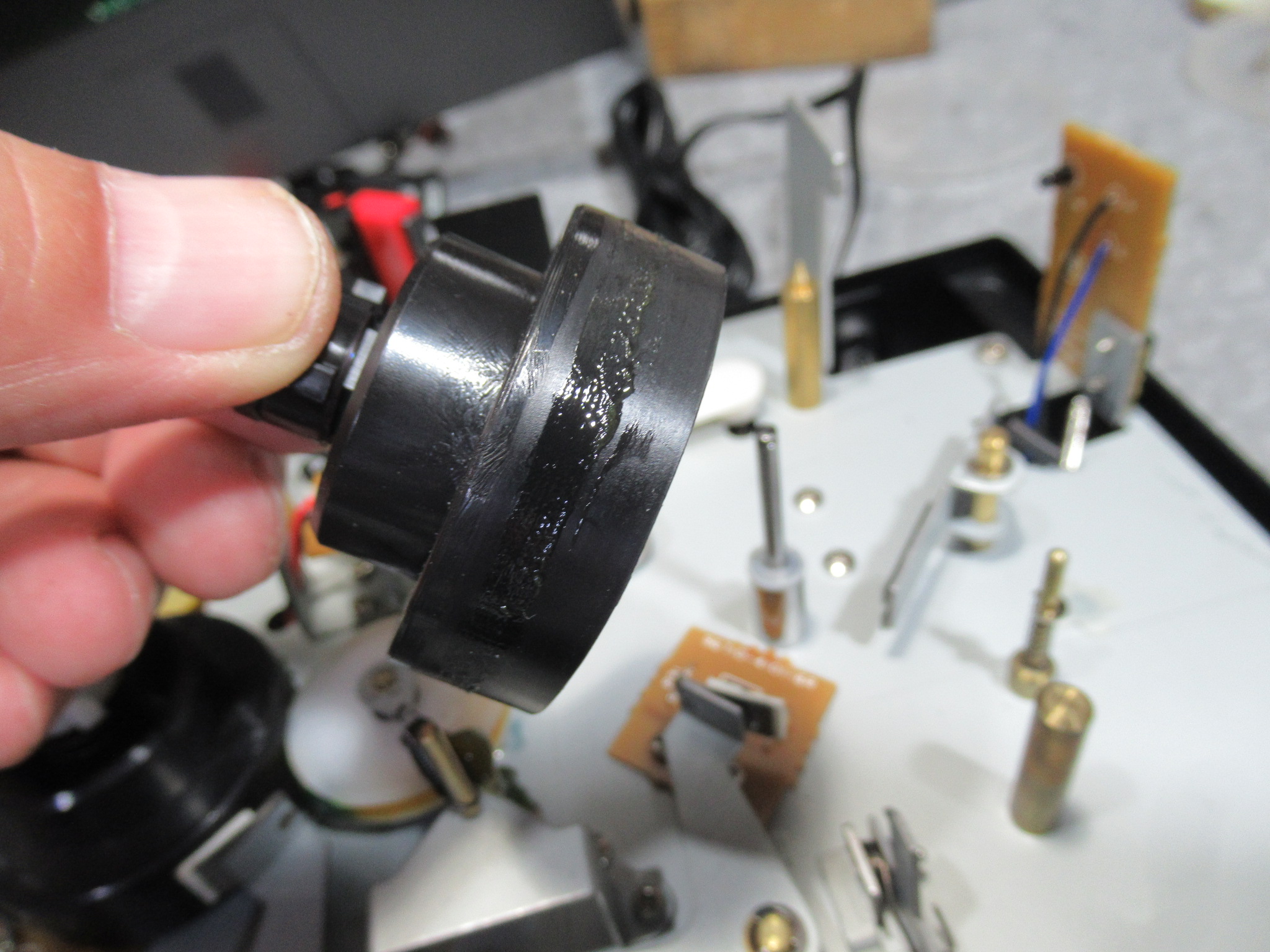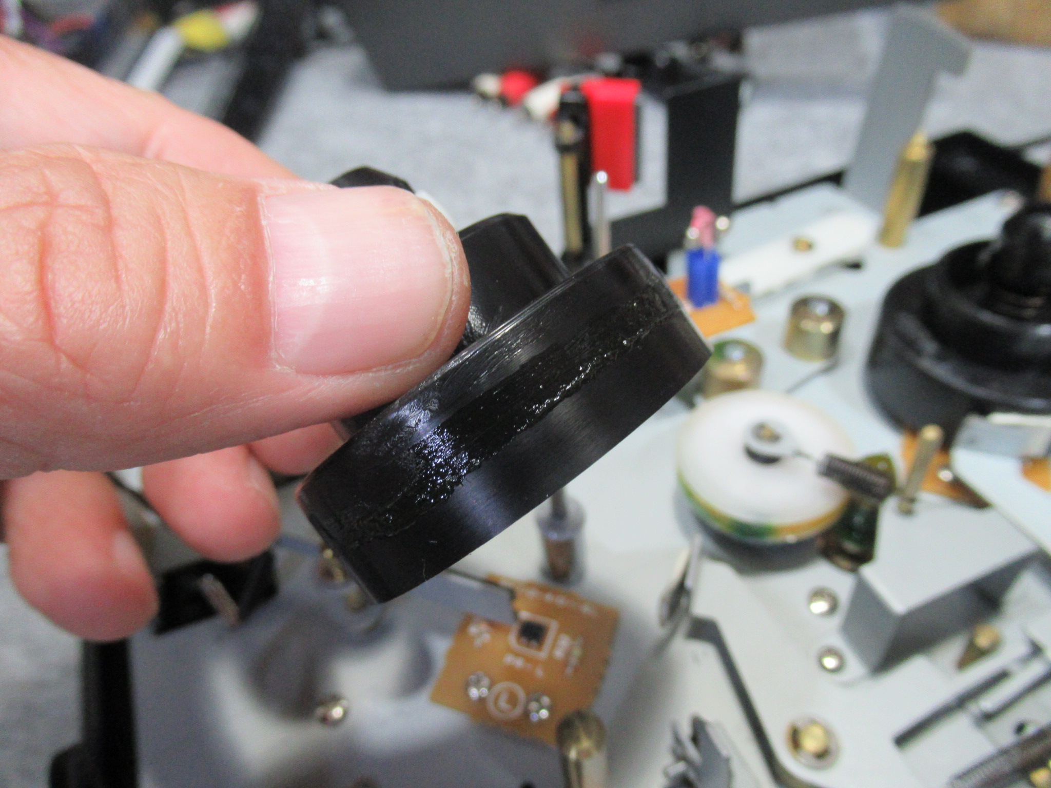 アイドラーゴムが加水分解で溶けています。こういったウレタンゴムは、耐摩耗性に優れていますが、加水分解しやすいという最大の欠点を有しています。