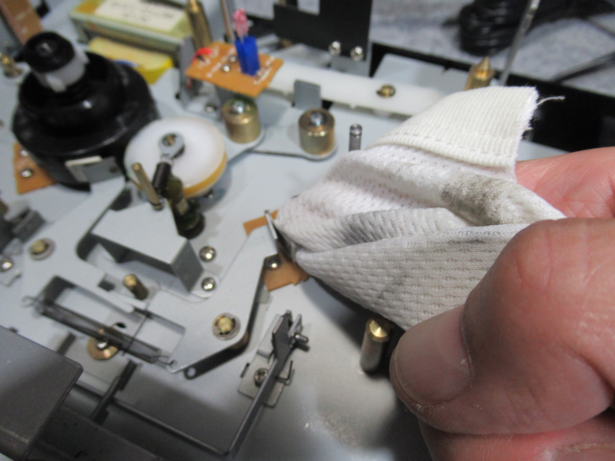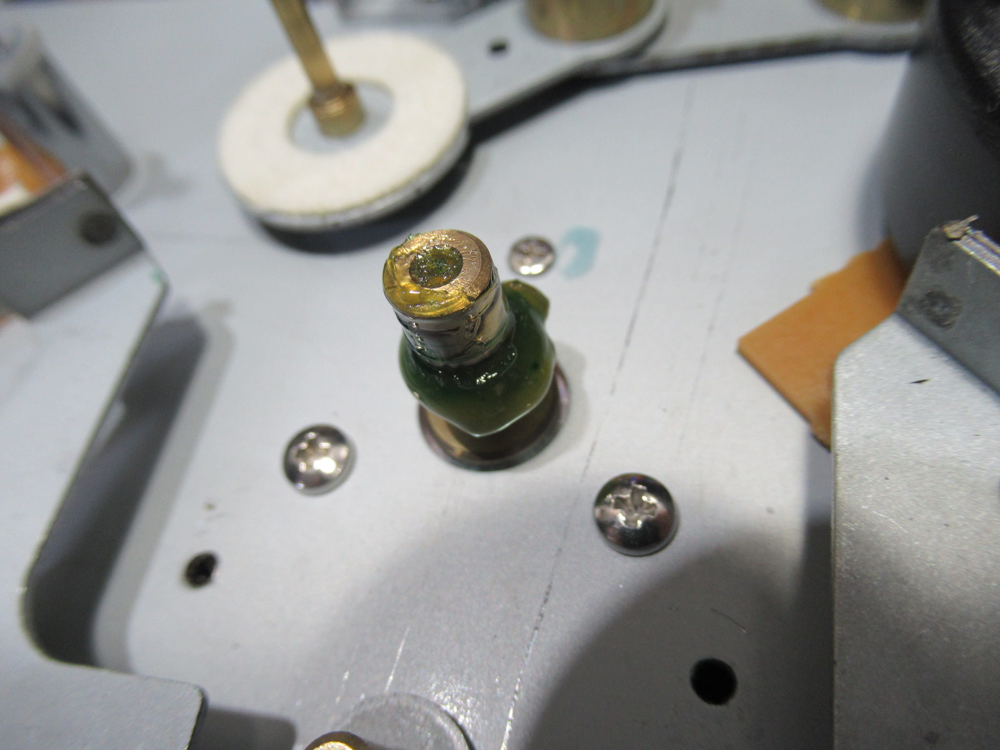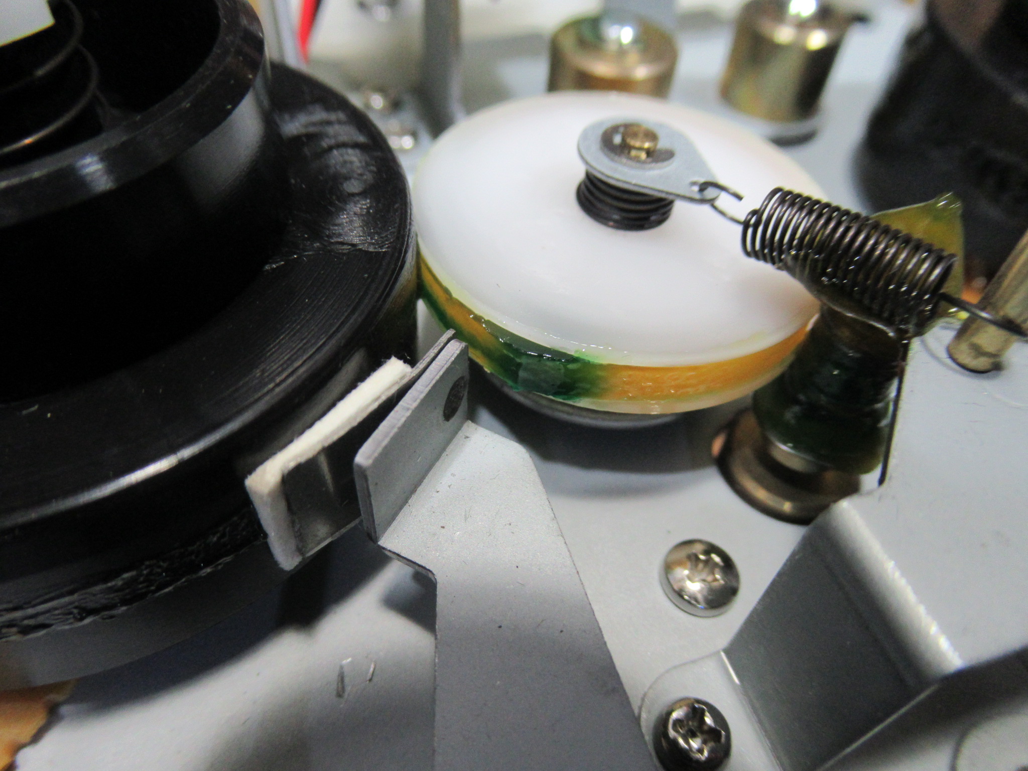 アイドラーゴムが加水分解で溶けています。こういったウレタンゴムは、耐摩耗性に優れていますが、加水分解しやすいという最大の欠点を有しています。