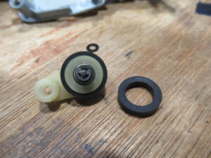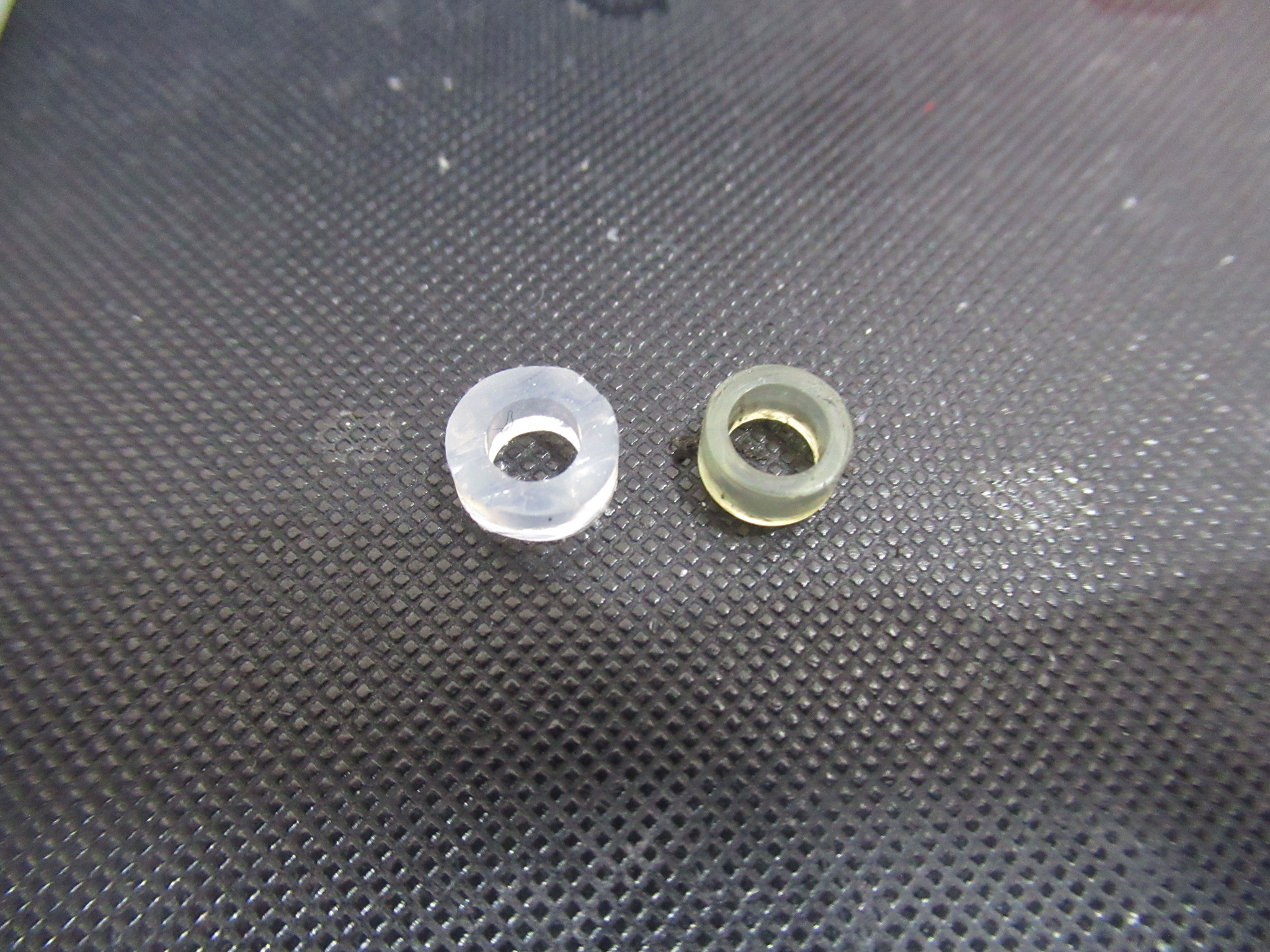 以前も似たようなものがありましたが、代替のゴムリング(右)が妙に小さなものが取り付けられていましたので、標準と同サイズのシリコンゴム製のアイドラーゴムと交換します。