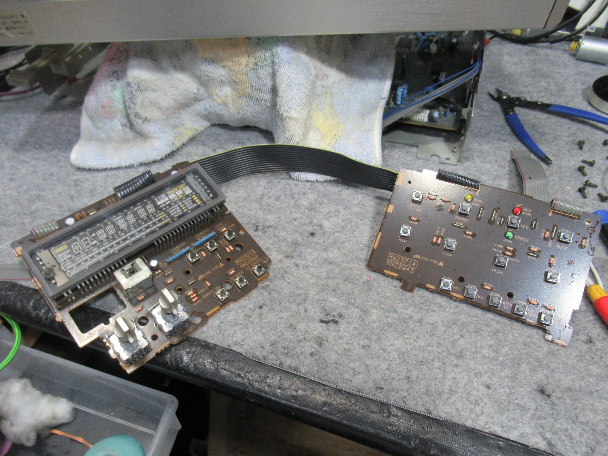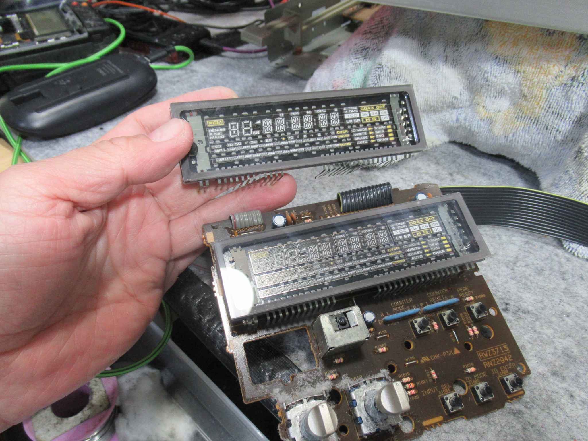 事前にお話しはありませんでしたが、ディスプレイの輝度がかなり低下しています。照明を落として写真のような状態ですので、明るいところではほとんど見えません。輝度が低下する原因は、「回路の故障」または「FL管の劣化」のいずれかになりますが、この機種ではほぼFL管劣化が原因ですので、交換の是非についてオーナー様にご確認したところ、OKをいただきました。