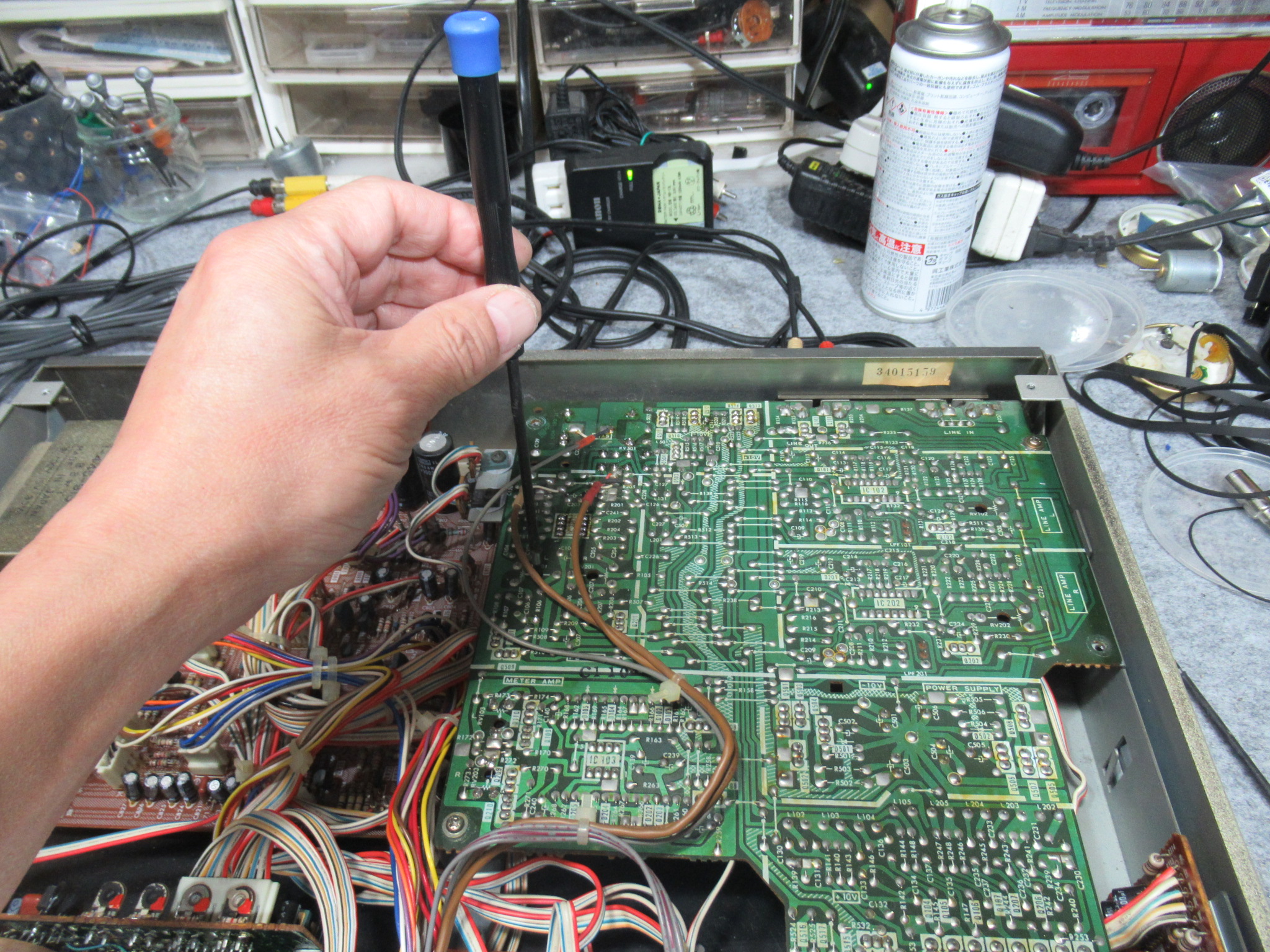 しかし、カバーを開けて各部に触れているうちに、いつの間にかノイズは発生しなくなってしまいました。これは困りました。稀にしか発生しない不具合ですので、不具合個所の特定が困難、かつ、仮に順番にパーツ交換を進めていっても、修理が成功したのかどうかがわかりません。