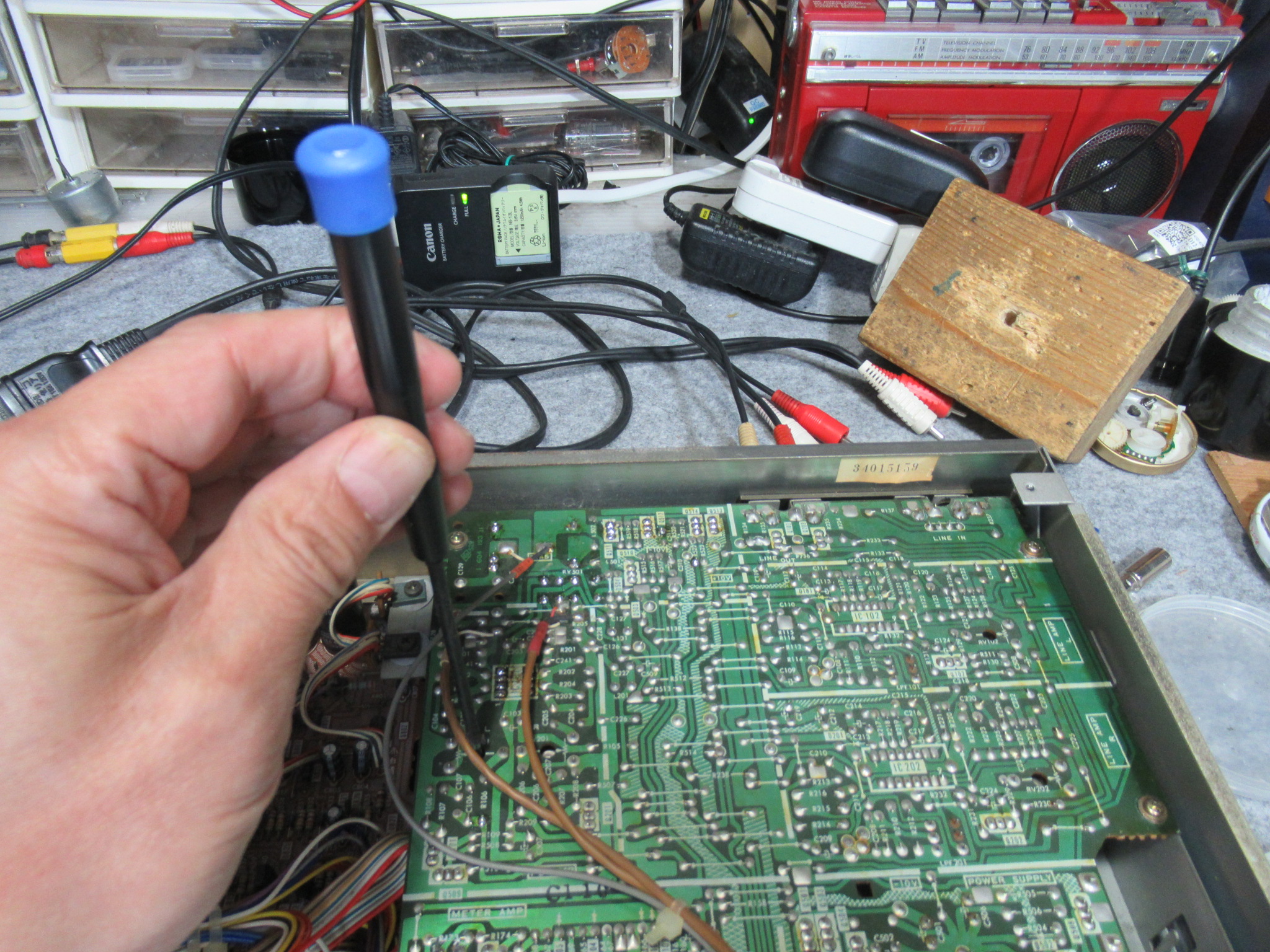 「それはないよな?」と思いながら、再生レベル調整用の半固定抵抗をドライバーで回してみると「バリバリ・・・」という、「ガサガサ・・・」を大音量にしたようなノイズが発生しました。状況から、どうやらこれが原因だったようです。そこで、半固定抵抗に接点復活剤を処置することにしました。それでダメなら部品の加工等を行い交換するしかありません。