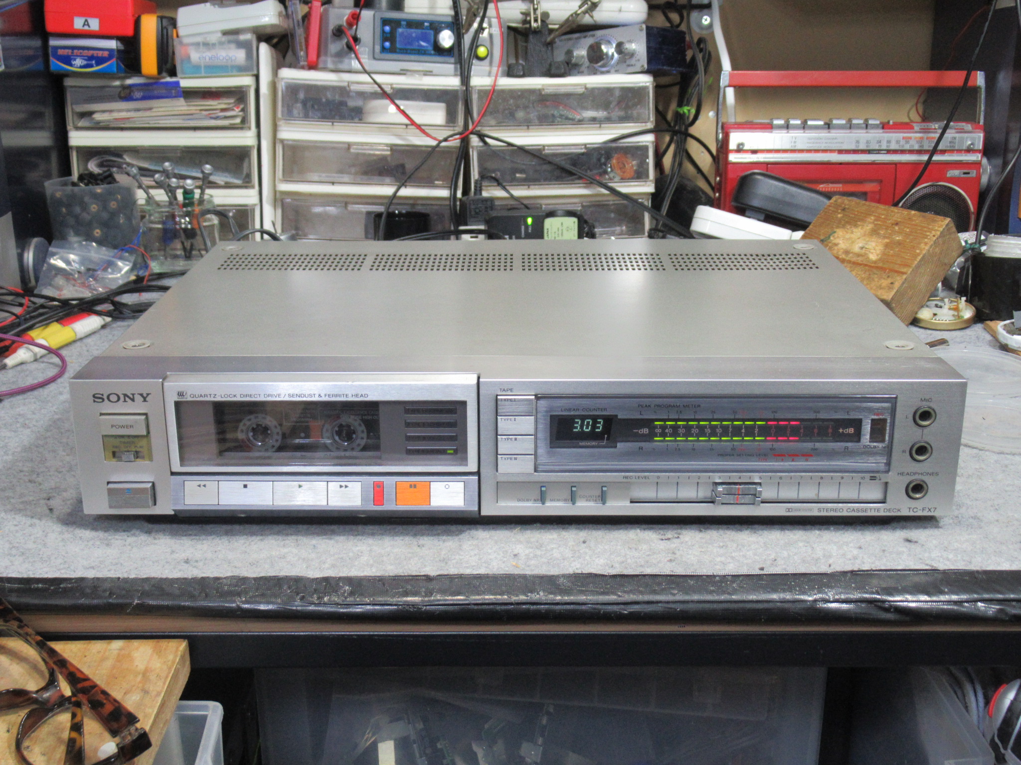 SONYのTC-FX7です。 以前テープを痛めるということで修理した機器ですが、今回は、リールの回転不良が起きたということです。 カセットの高さとほぼ同じという驚異的な設計です。 再生は可能でしたが、 …