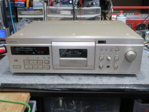 SONY製3ヘッドデュアルキャプスタンカセットデッキ、TC-KA3ESの修理依頼をいただきました。 10年ほど前に故障し、そのまま保管されていたということです。 イジェクトできません。メカを降ろすため …