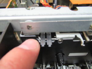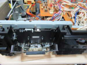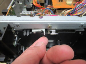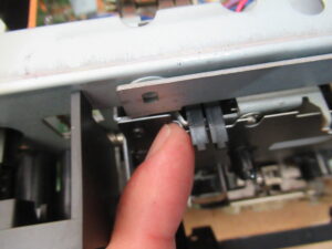 カバーとフロントパネルを取り外しました。指先の銀色のパーツがメタルテープの検出レバーですが、動きが鈍くなっています。