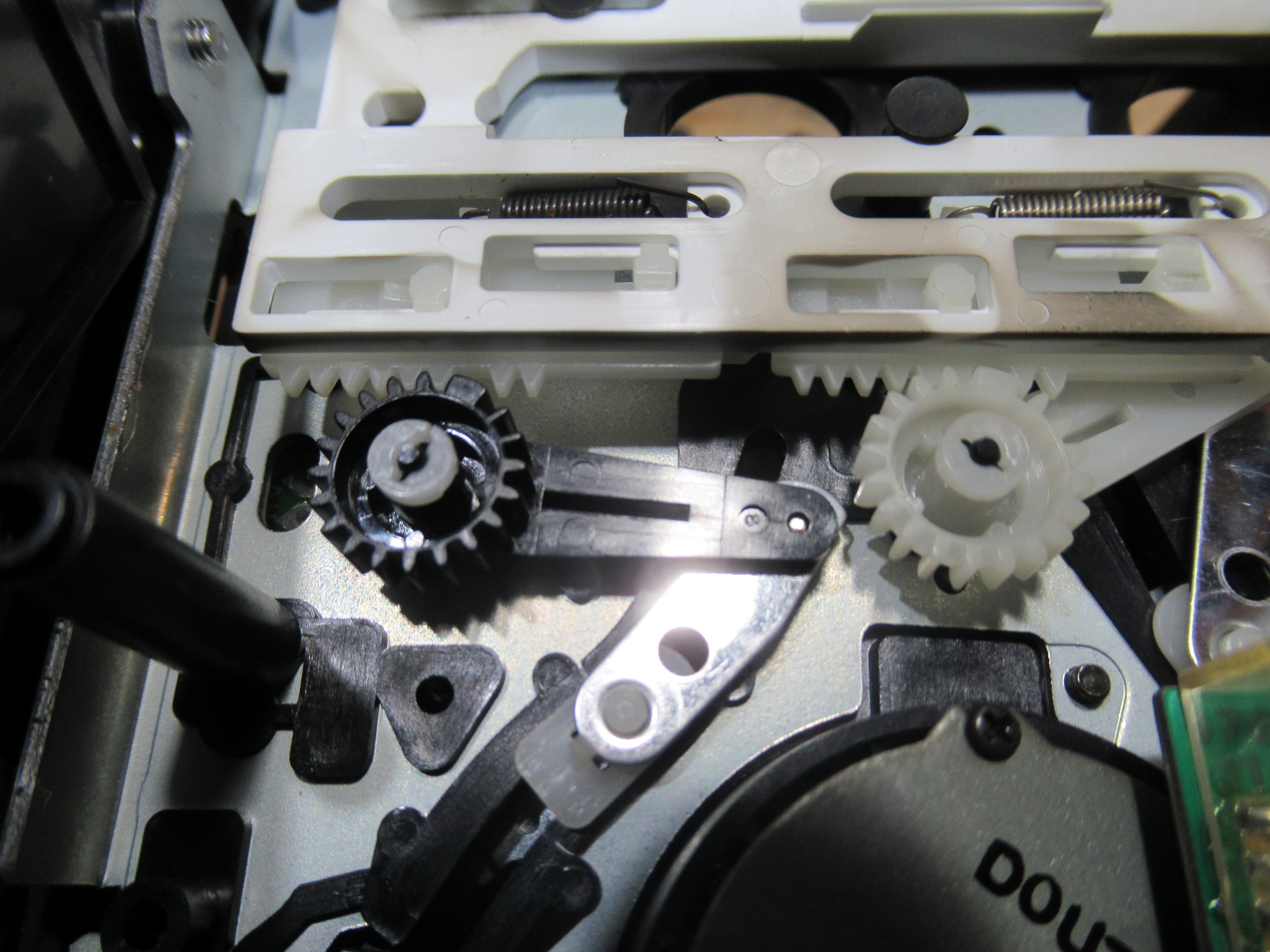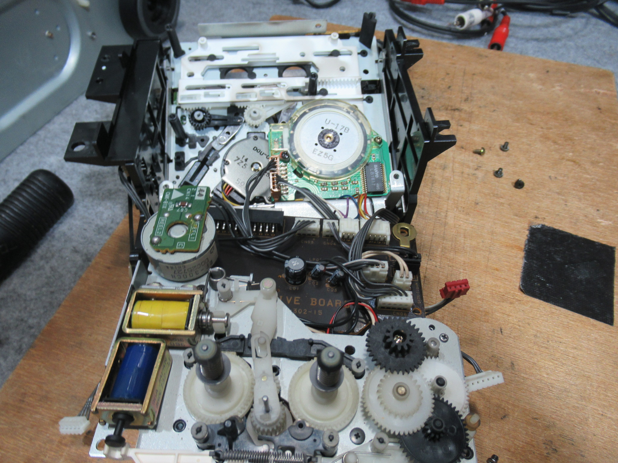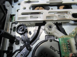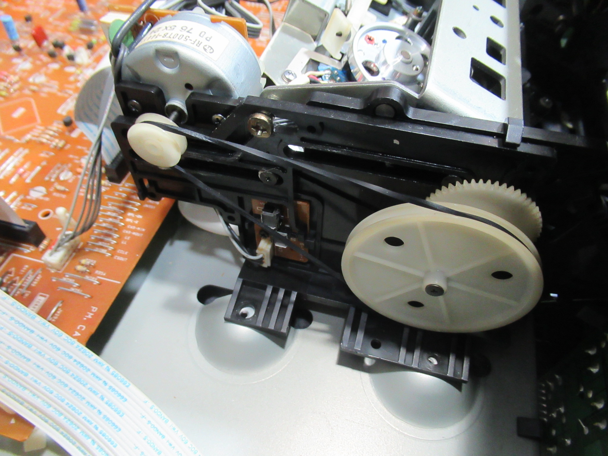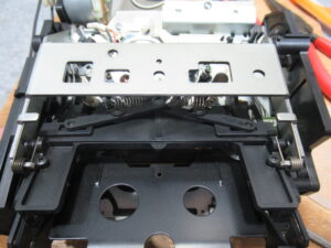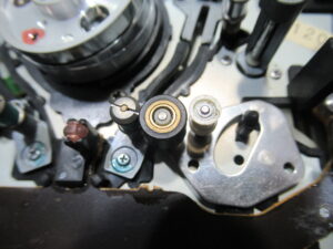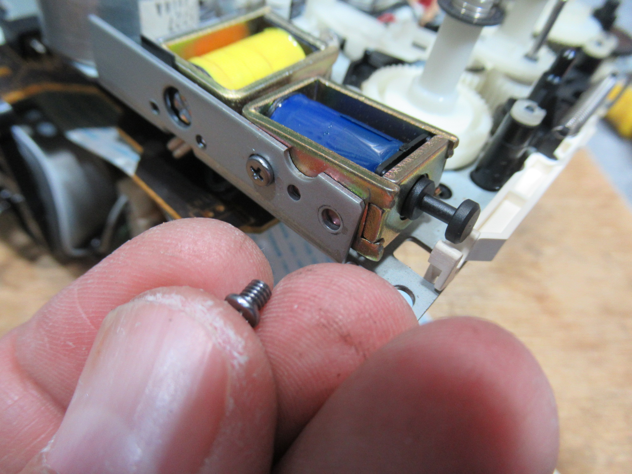 メカを裏返します。青色の部品はブレーキ用のソレノイドですが、固定しているビスが外れています。