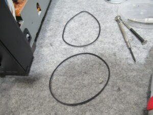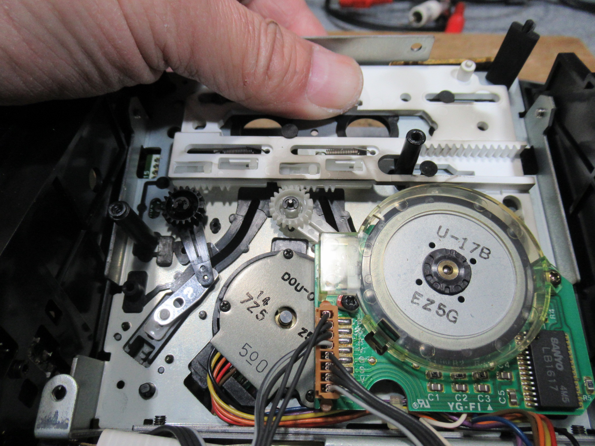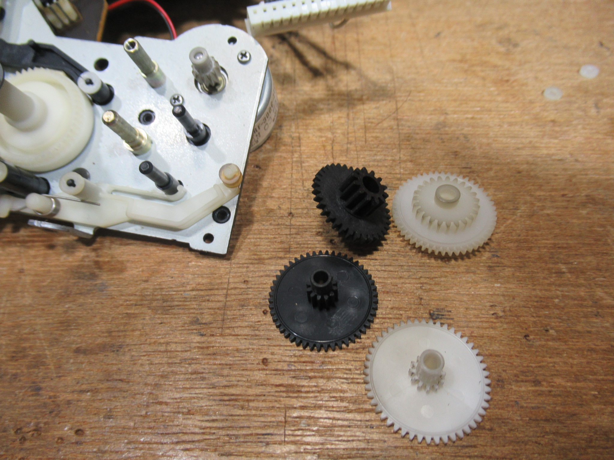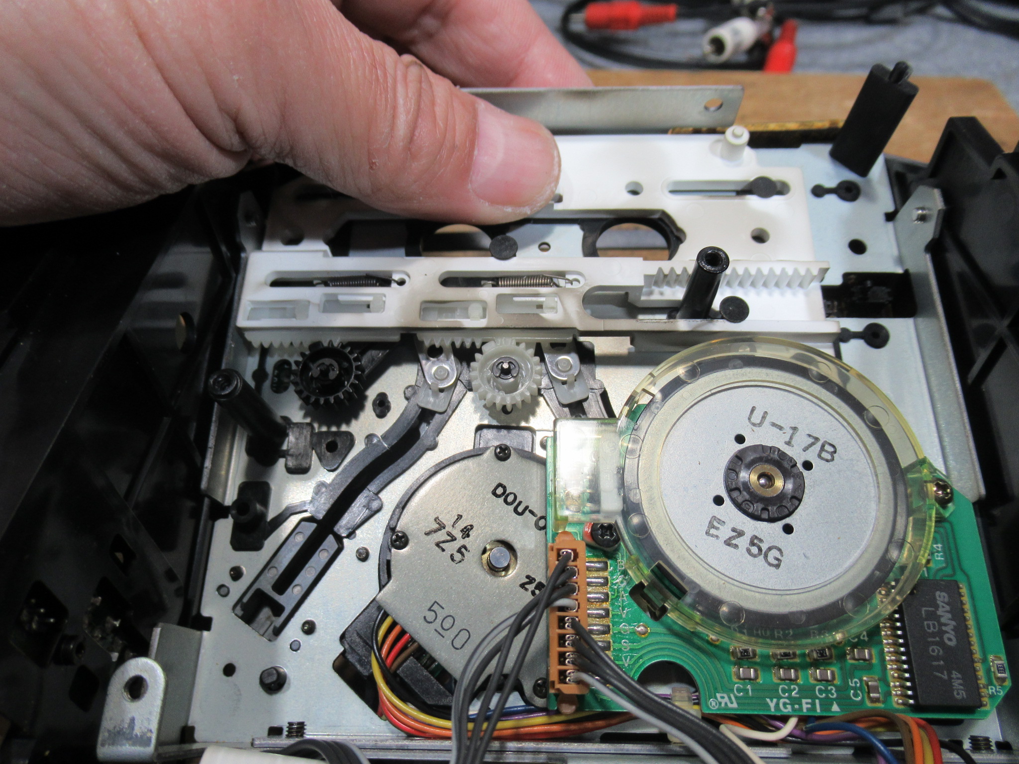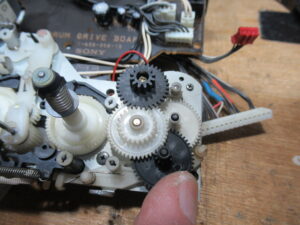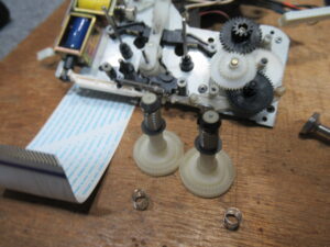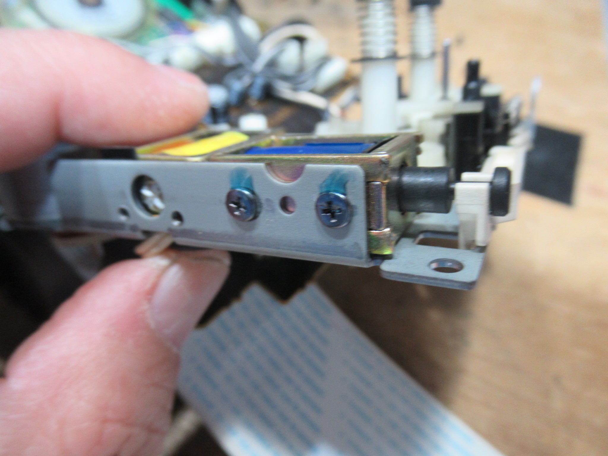 メカを裏返します。青色の部品はブレーキ用のソレノイドですが、固定しているビスが外れています。