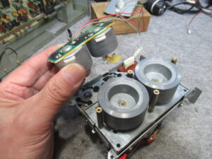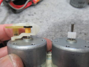 左のモーターは早送り巻き戻し用ですが、ギヤが欠けています。