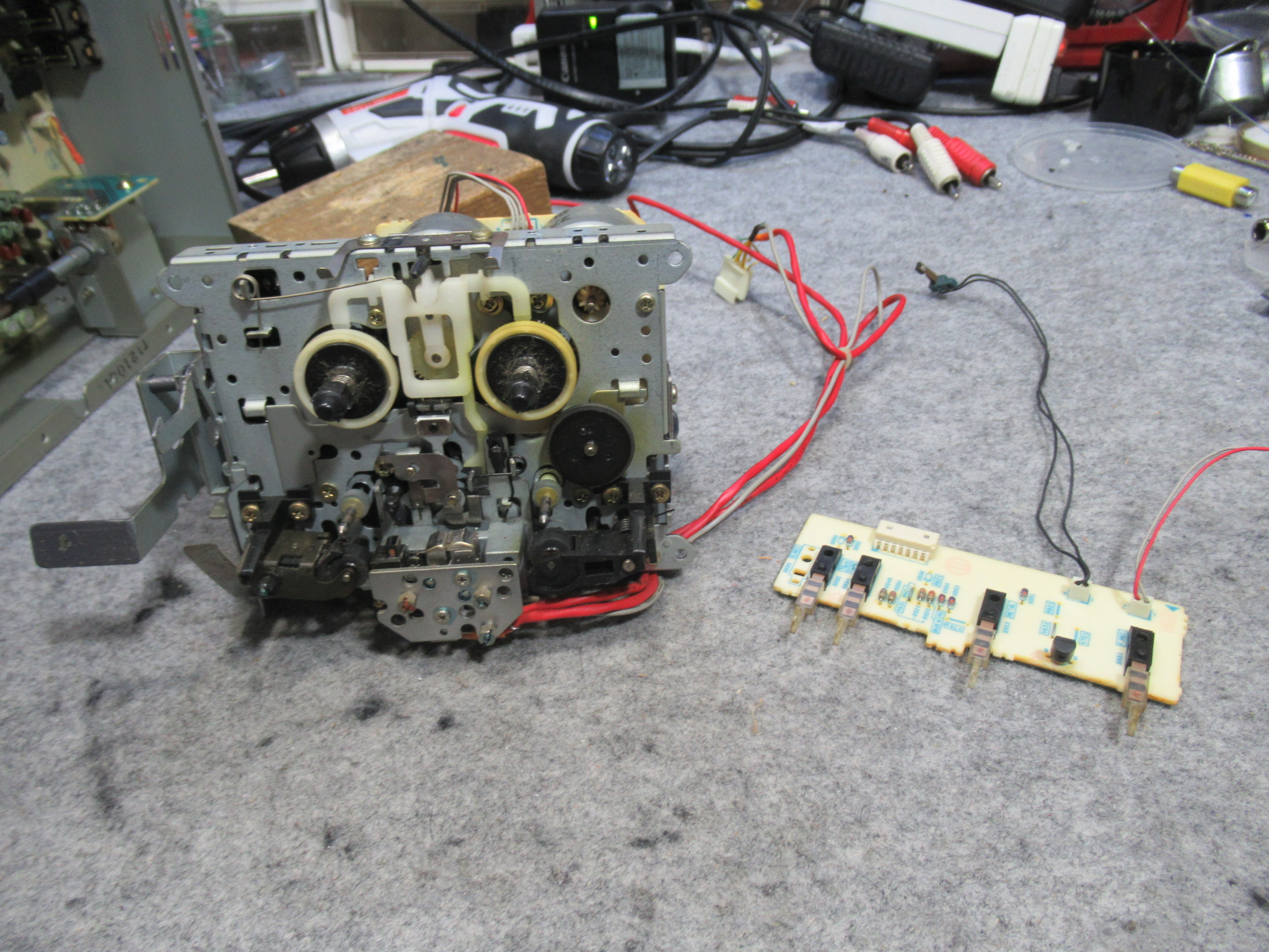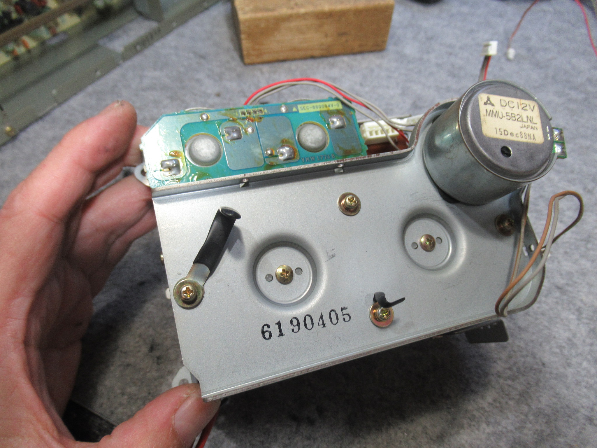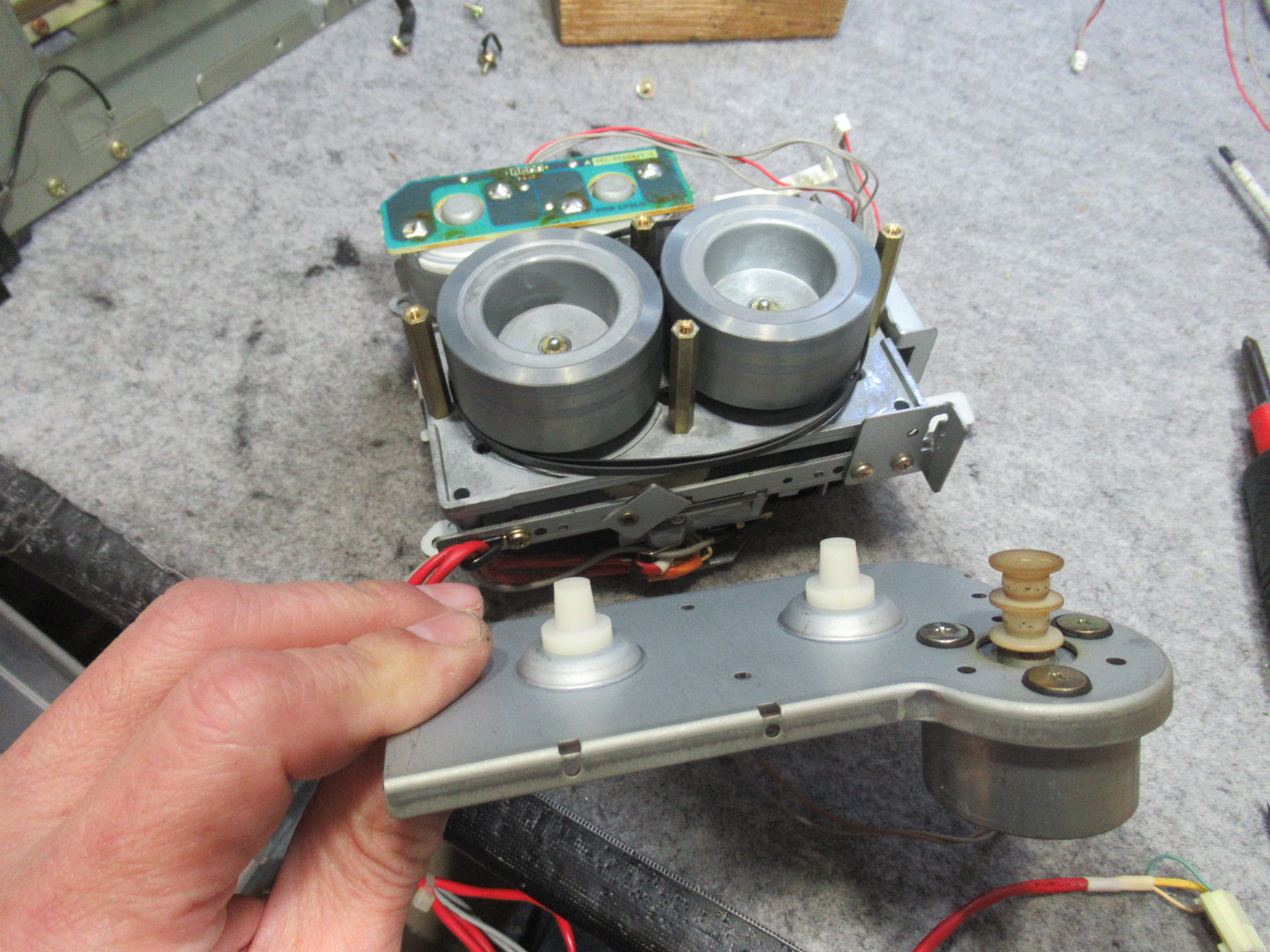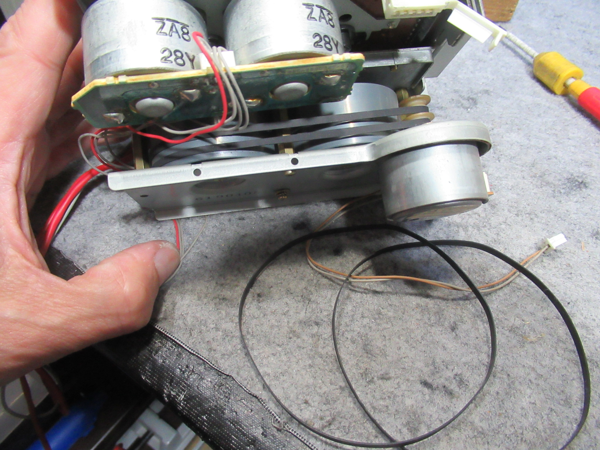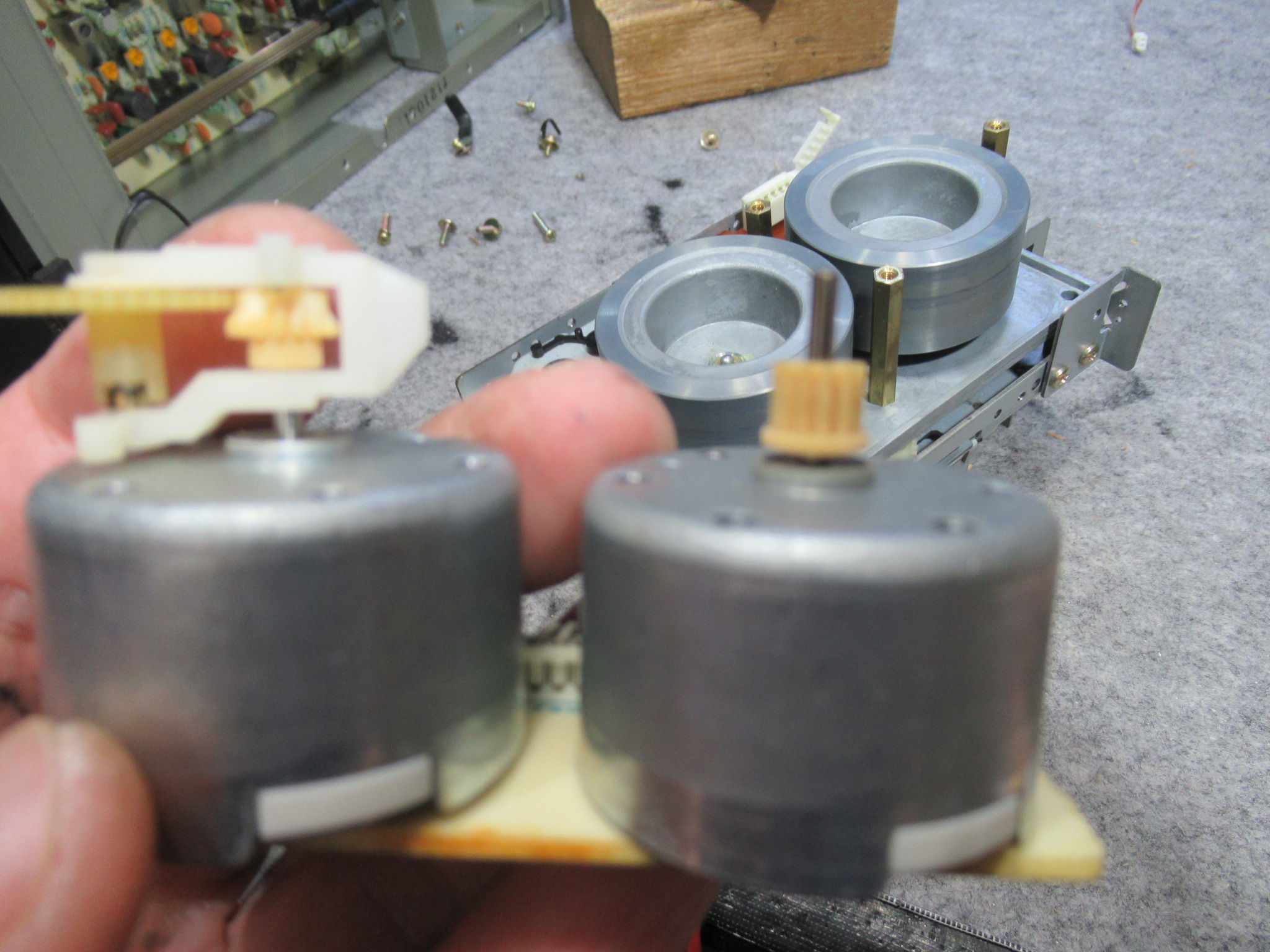 左のモーターは早送り巻き戻し用ですが、ギヤが欠けています。