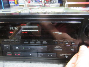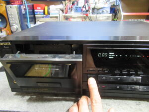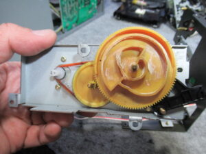 3年ほど前に他店で修理後、当初から調子が悪く、また、最近になってトレイが開かなくなったということで当店の出番となりました。その修理の際のコメントに「プラスチックギヤが摩耗しているため破損の可能性あり。ヘッドの摩耗により高域が落ちている」と記載されていたということです。