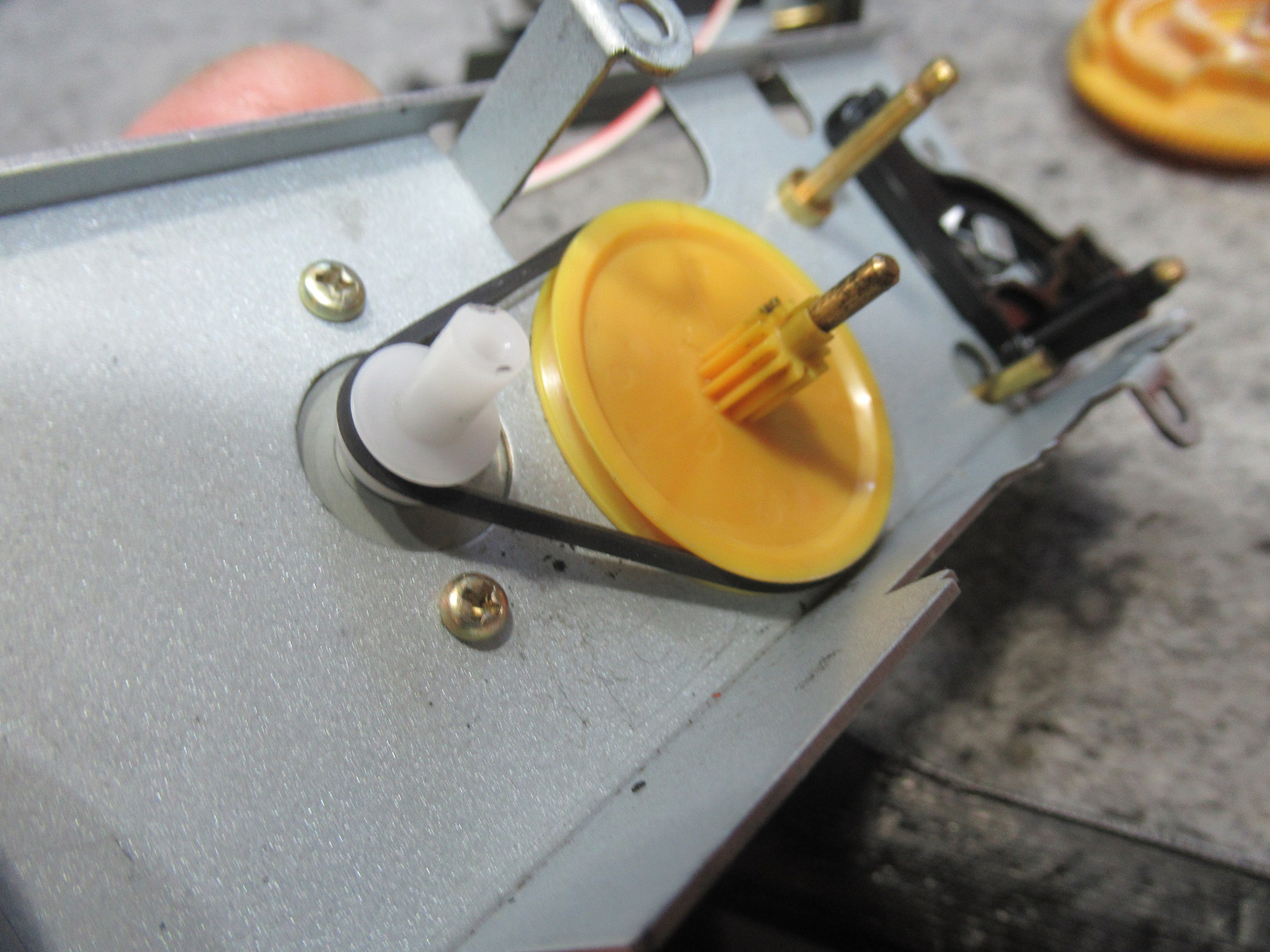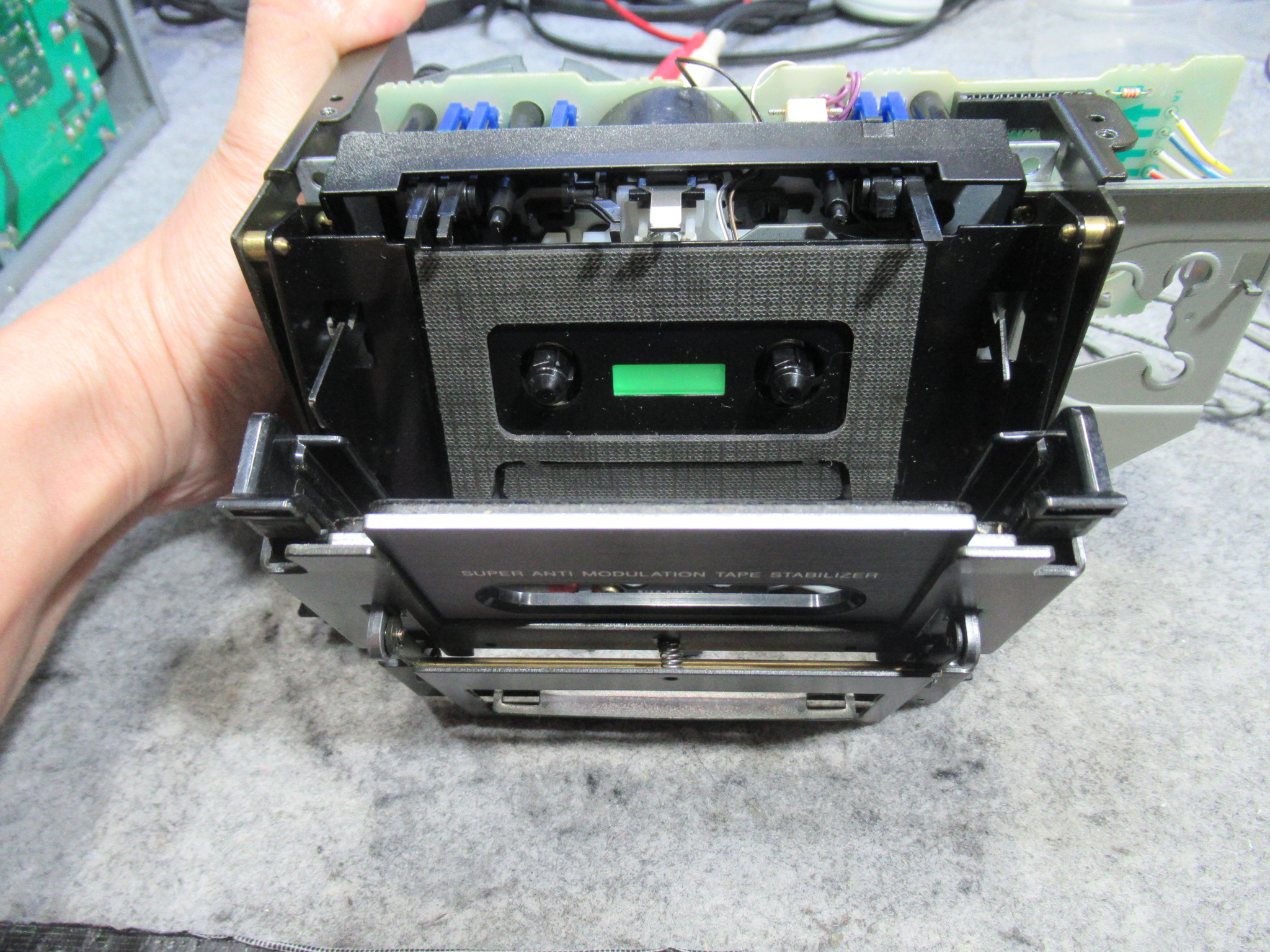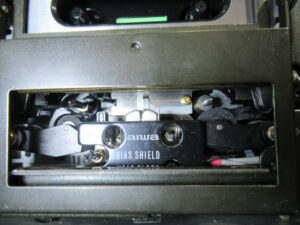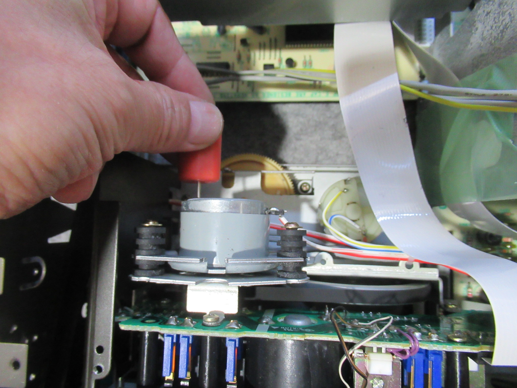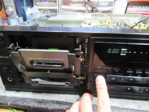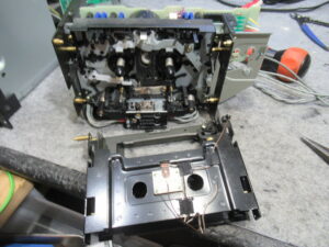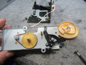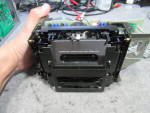 なぜかというと、ヘッドとピンチローラーが少し上がった状態だからです。このメカは、フライホイールの回転力を利用してヘッドとピンチローラーを上下しますので、キャプスタンベルトがスリップしている可能性があります。