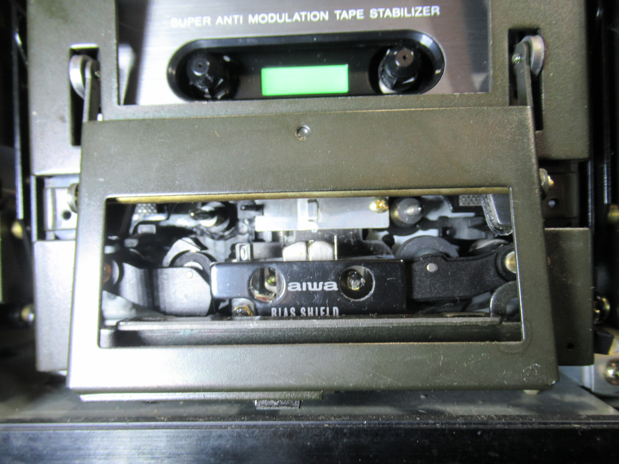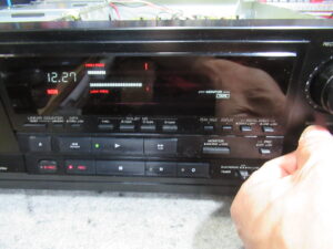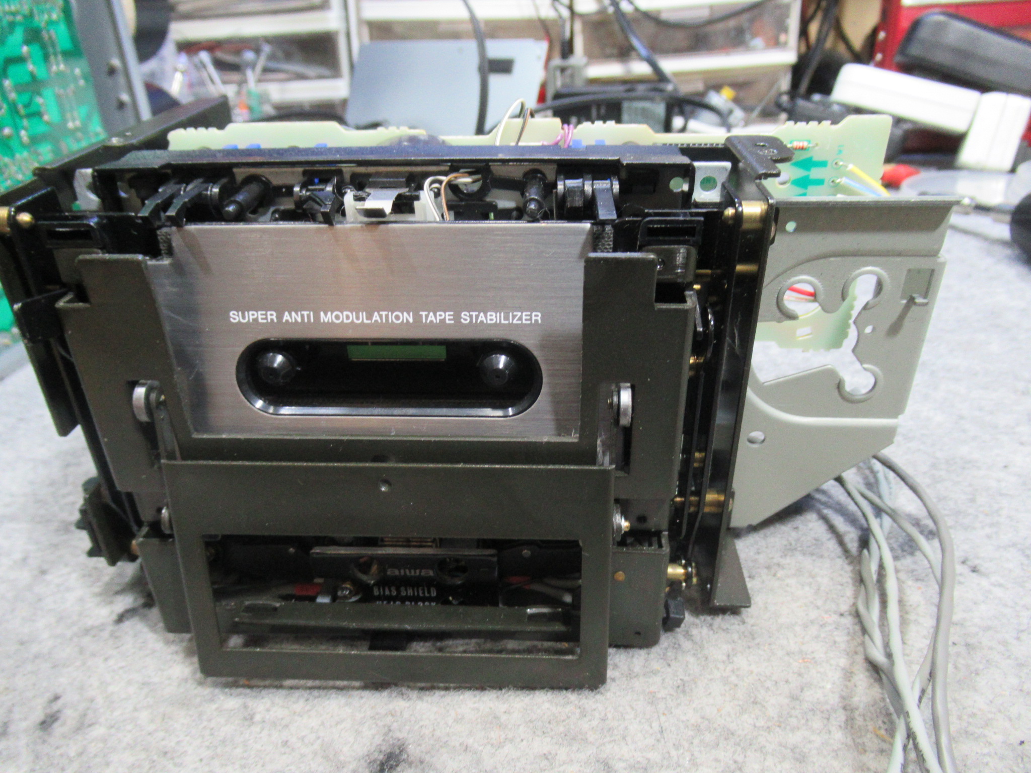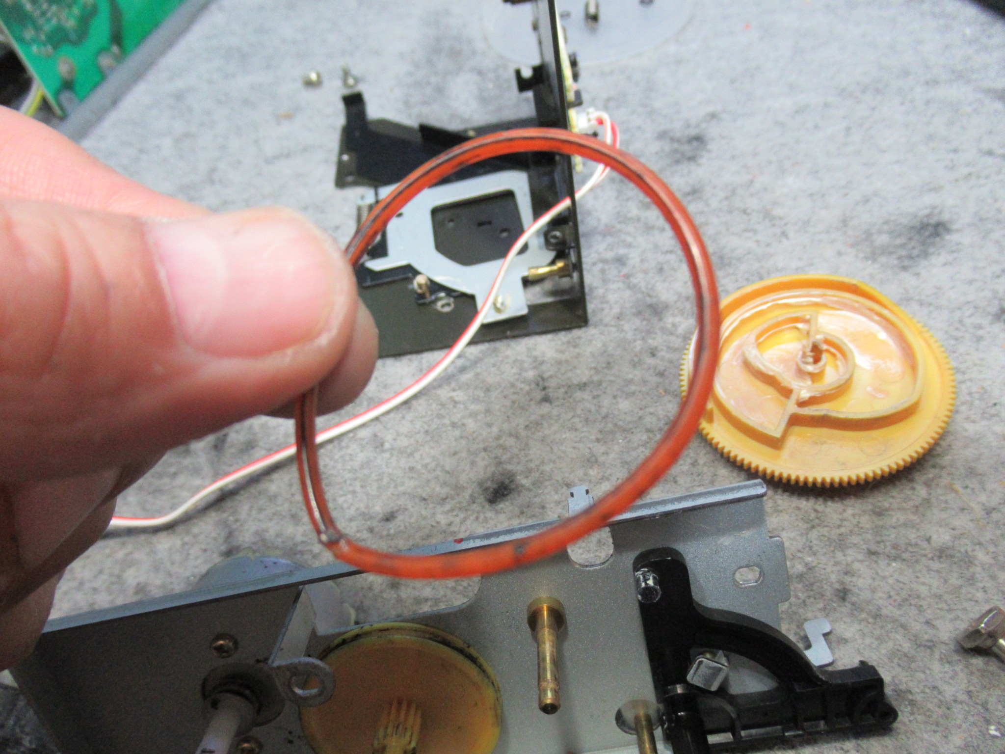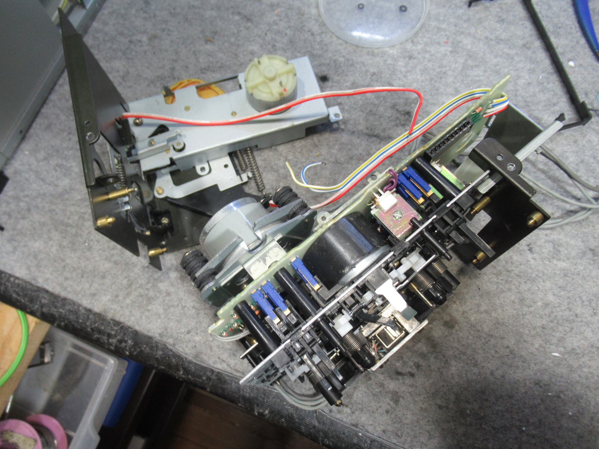 なぜかというと、ヘッドとピンチローラーが少し上がった状態だからです。このメカは、フライホイールの回転力を利用してヘッドとピンチローラーを上下しますので、キャプスタンベルトがスリップしている可能性があります。