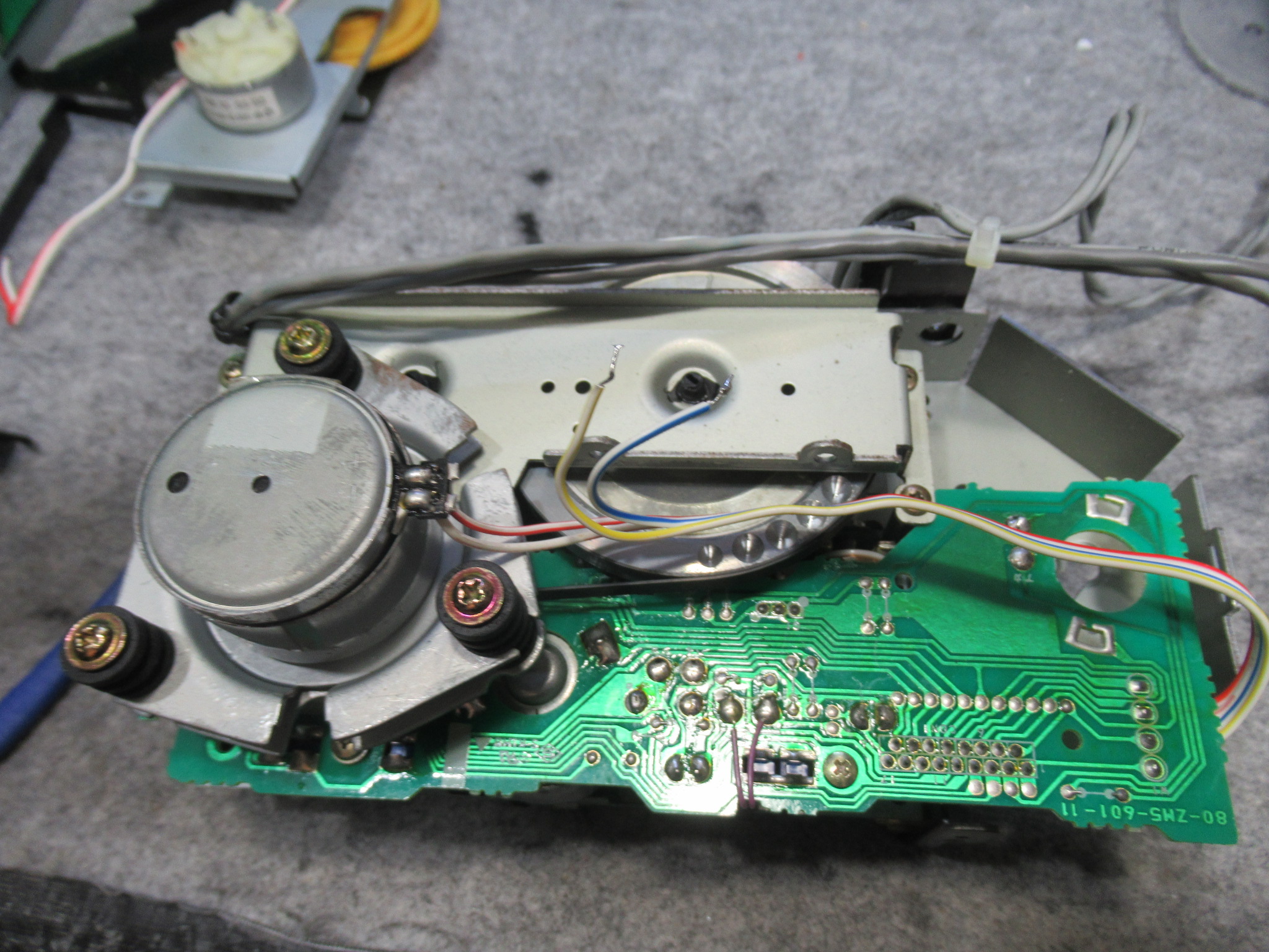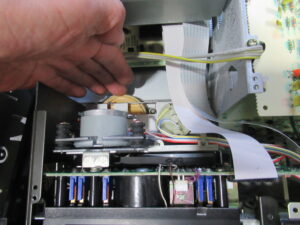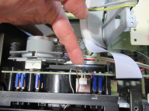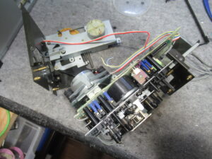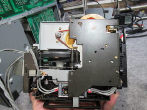 これはメカの底面です。AMTSユニットのベルトにバンコードが使用されています。それ自体は悪いことではありませんが、プーリーが黒く汚れているのが気になります。ゴムベルトが加水分解で溶けた汚れを清掃しないで整備したのでしょうか?それともスリップ防止のために何かを処置したのでしょうか?いずれにしてもトレイ開閉の不具合は、これが原因です。
