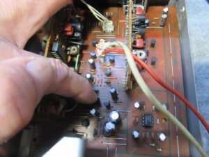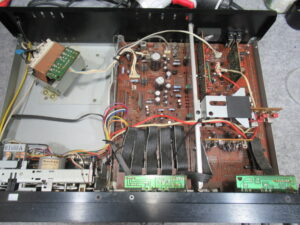 カバーを開けて点検を進めます。両CHとも音が出ないということは、電源ラインの故障の可能性が大です。テスターで各部の電圧を点検すると、-7.2Vラインが死んでいることがわかりました。